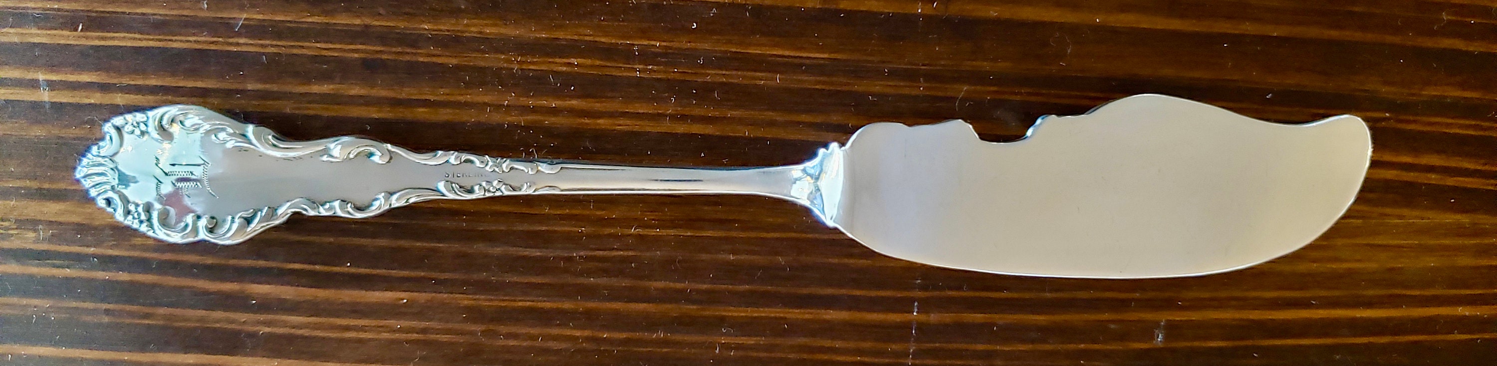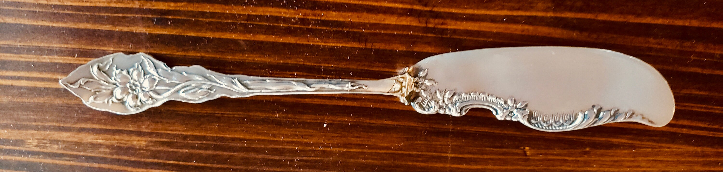 Serve your butter or cheese in Art Nouveau style with this sterling silver Master Butter Knife made in "Narcissus" pattern by Unger Bros in 1890. This piece is exemplary of the Art Nouveau movement. We highly recommend using our four piece cleaning kit for easy maintenance, beautiful shine and infrequent tarnishing: https://etsy.me/2RqR88j and our Tarnish Preventive 6-Piece Silver Place Setting Cloth https://www.etsy.com/listing/779216236 for easy space saving storage.