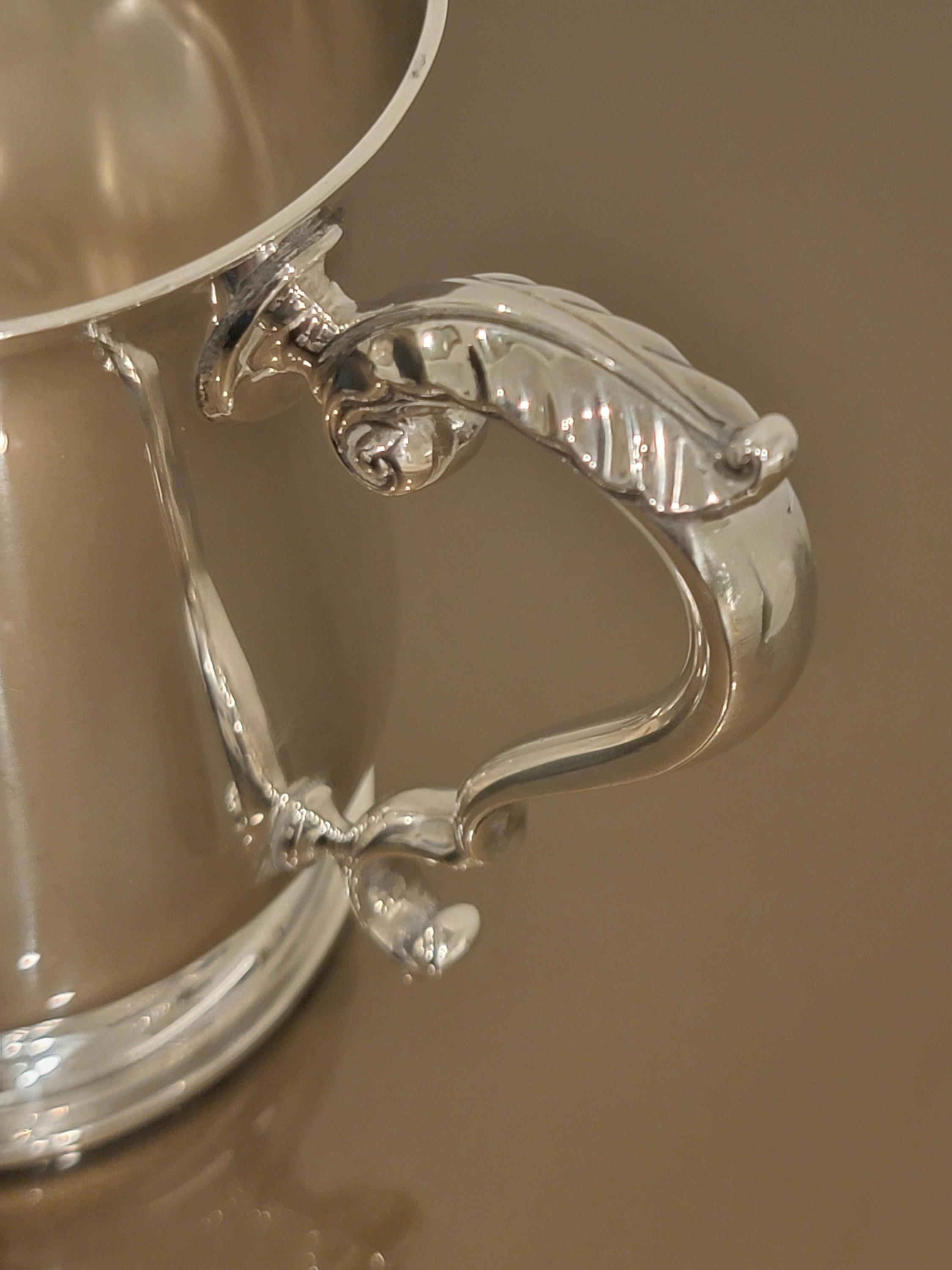 This impressive A.E. Jones sterling silver tankard was crafted in Birmingham, England in 1936, beautifully executed in the Georgian baluster form. The design features a smooth rounded body, applied scroll handle with leaf thumb rest, and a raised circular foot — a hallmark of fine English silversmithing.