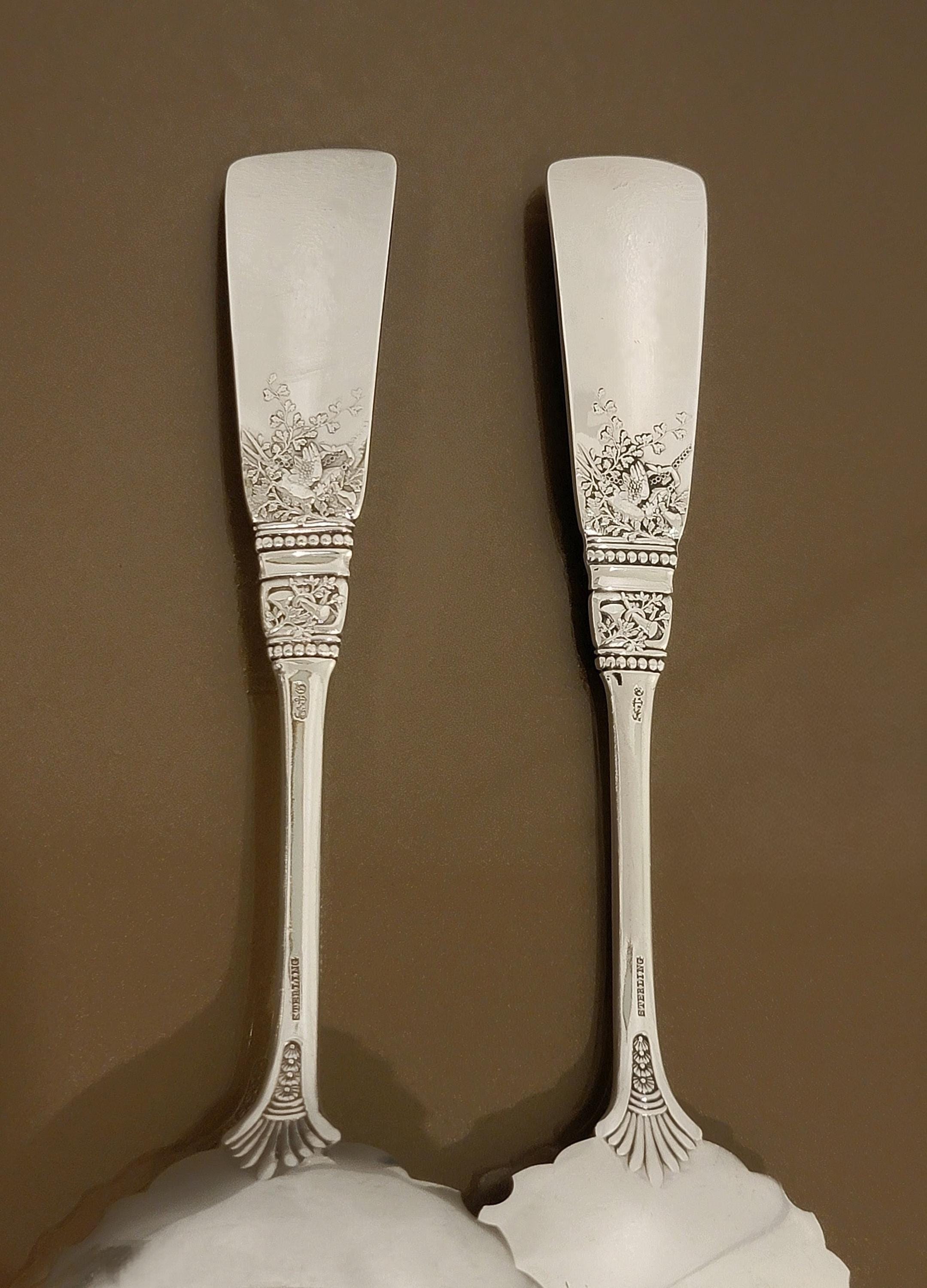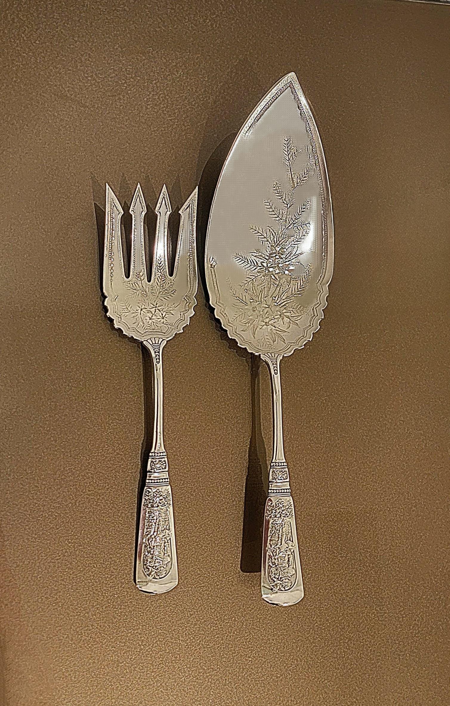 A gorgeous two-piece sterling silver fish serving set in the Fontainebleau pattern by Gorham circa 1880. No monogram, 11 -3/8"inches (knife), Fork 8-3/4" - 6.56 troy ounces total