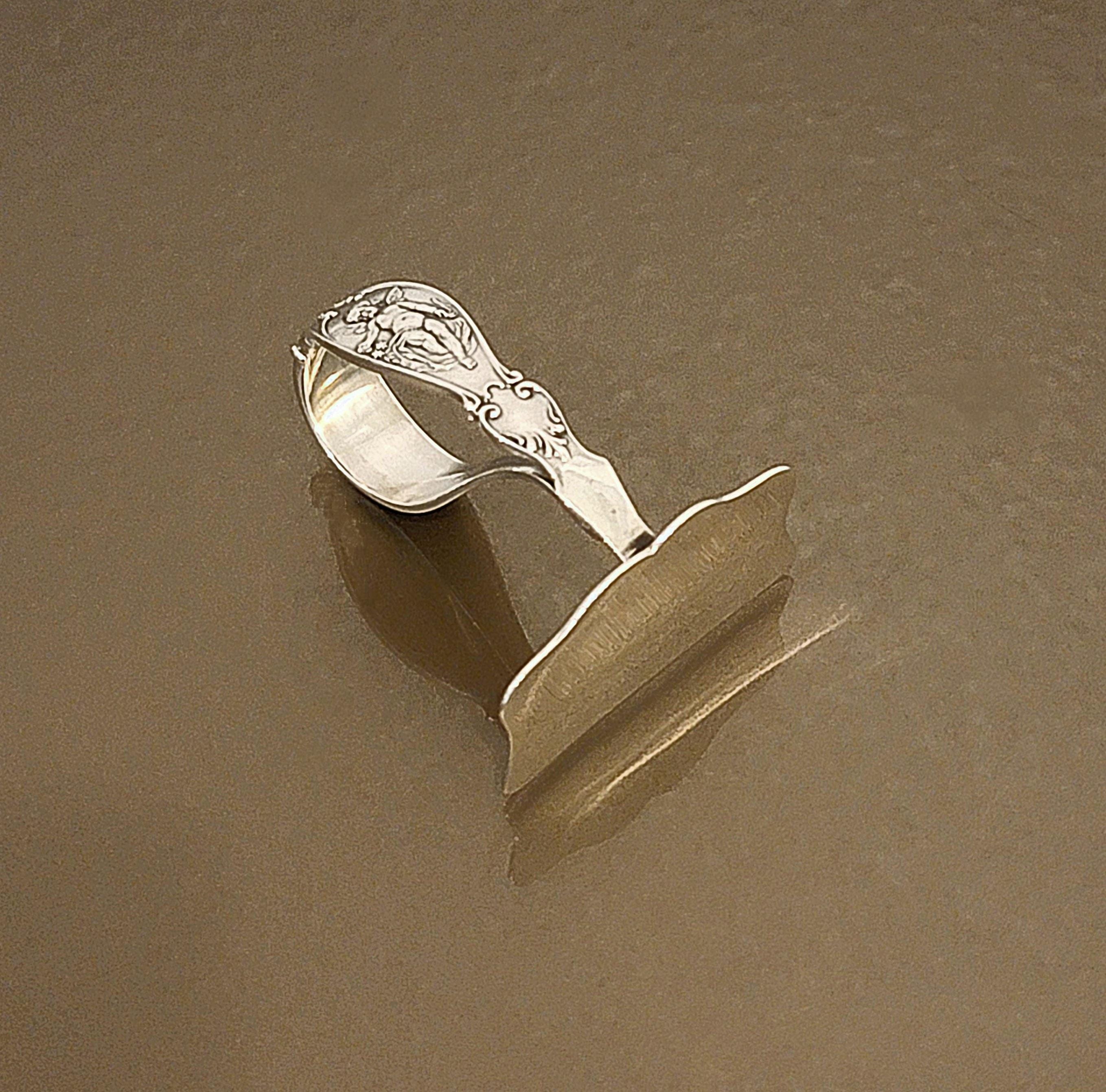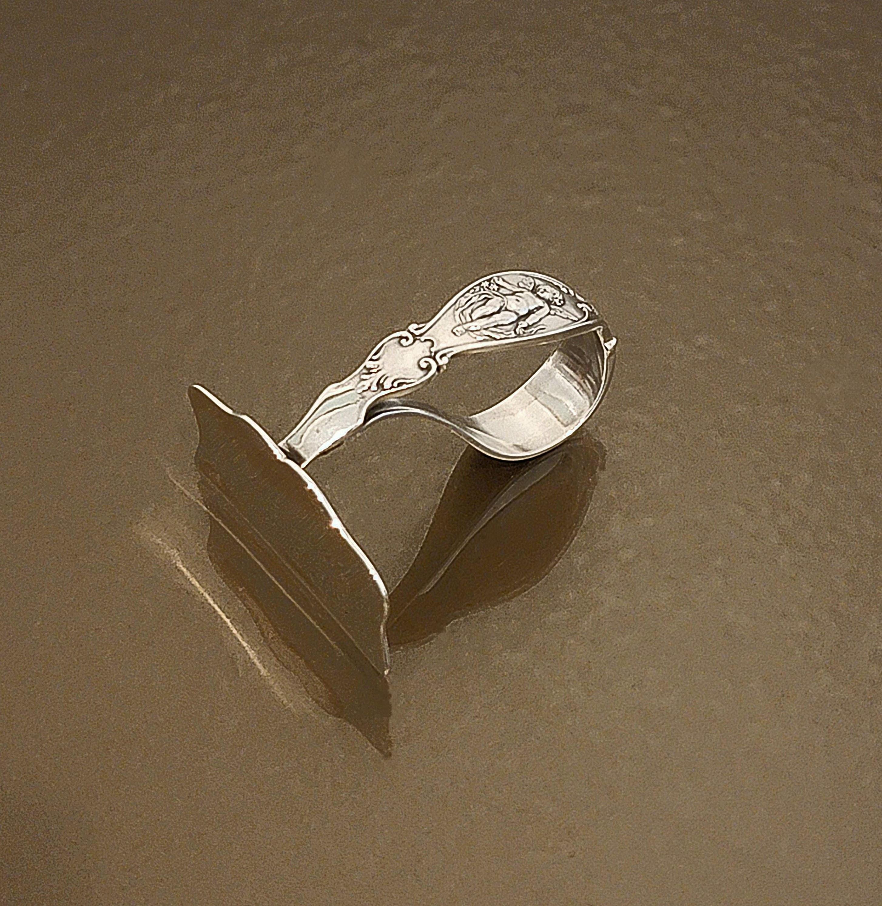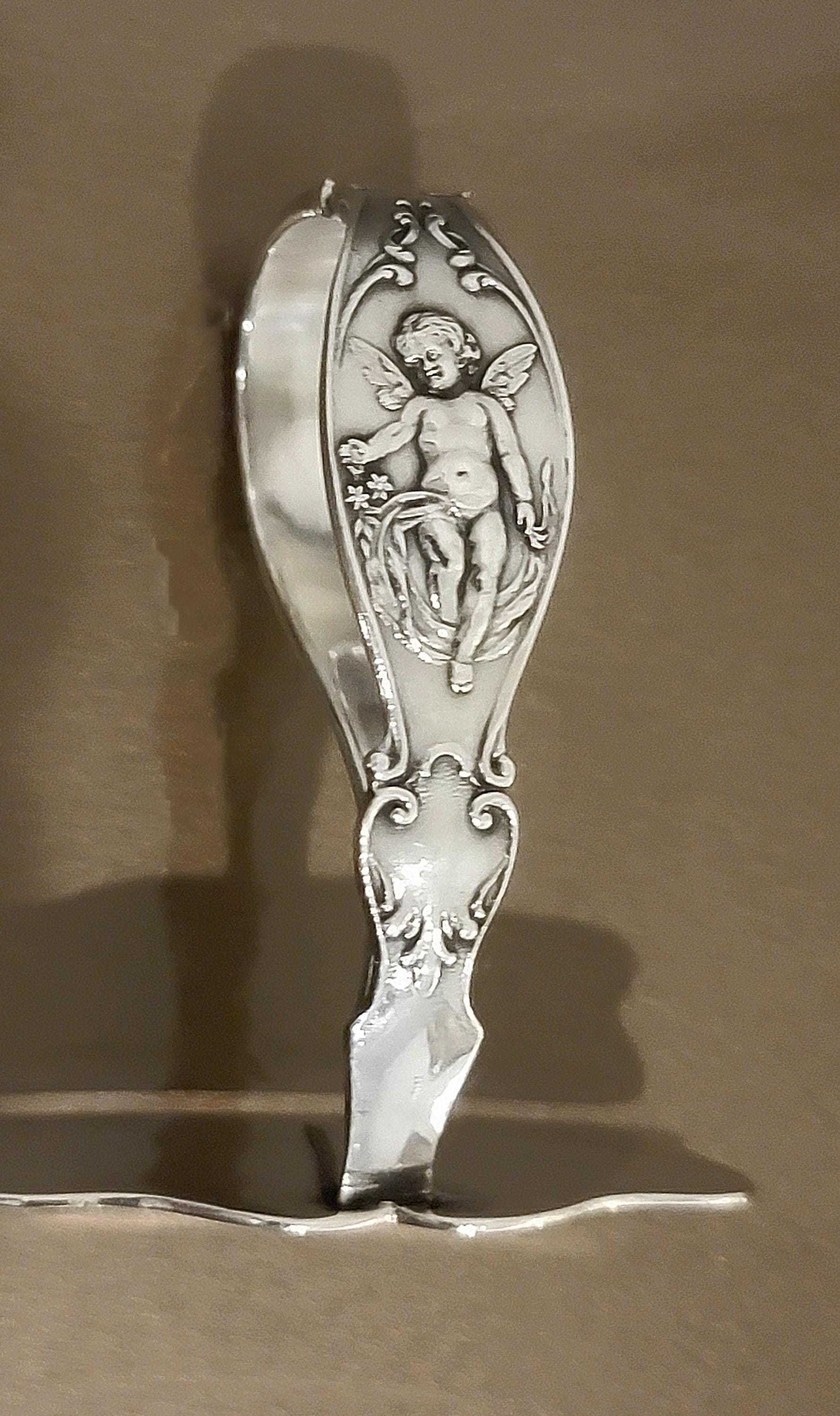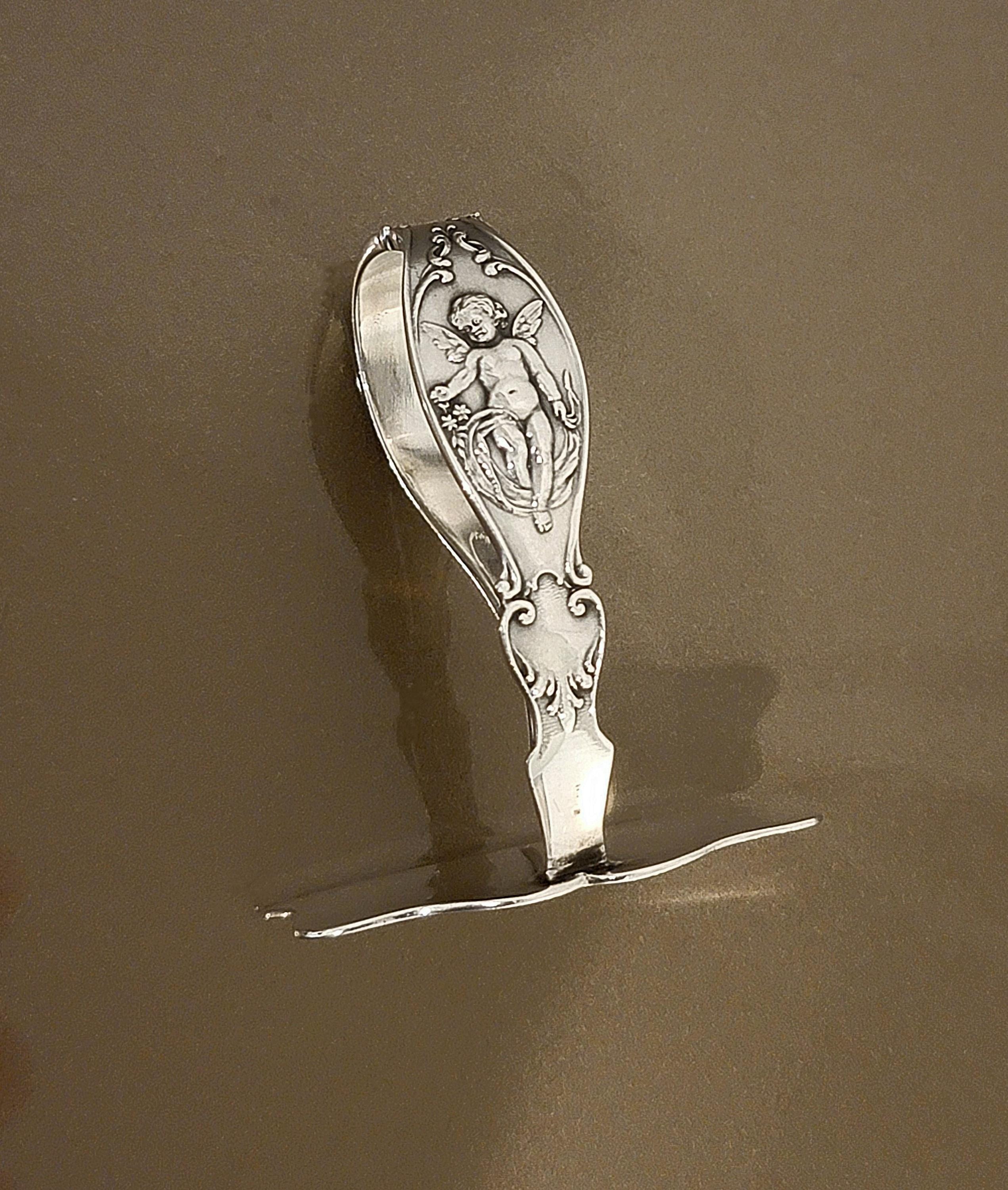 A unique and beautiful sterling silver angel motif baby food pusher by Reed & Barton. 2 1/8 inches, 0.72 troy ounce