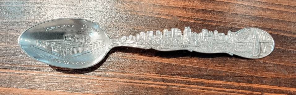 A sterling silver souvenir spoon depicting Pennsylvania Station in raised lettering in bowl, and the New York City skyline on the handle.