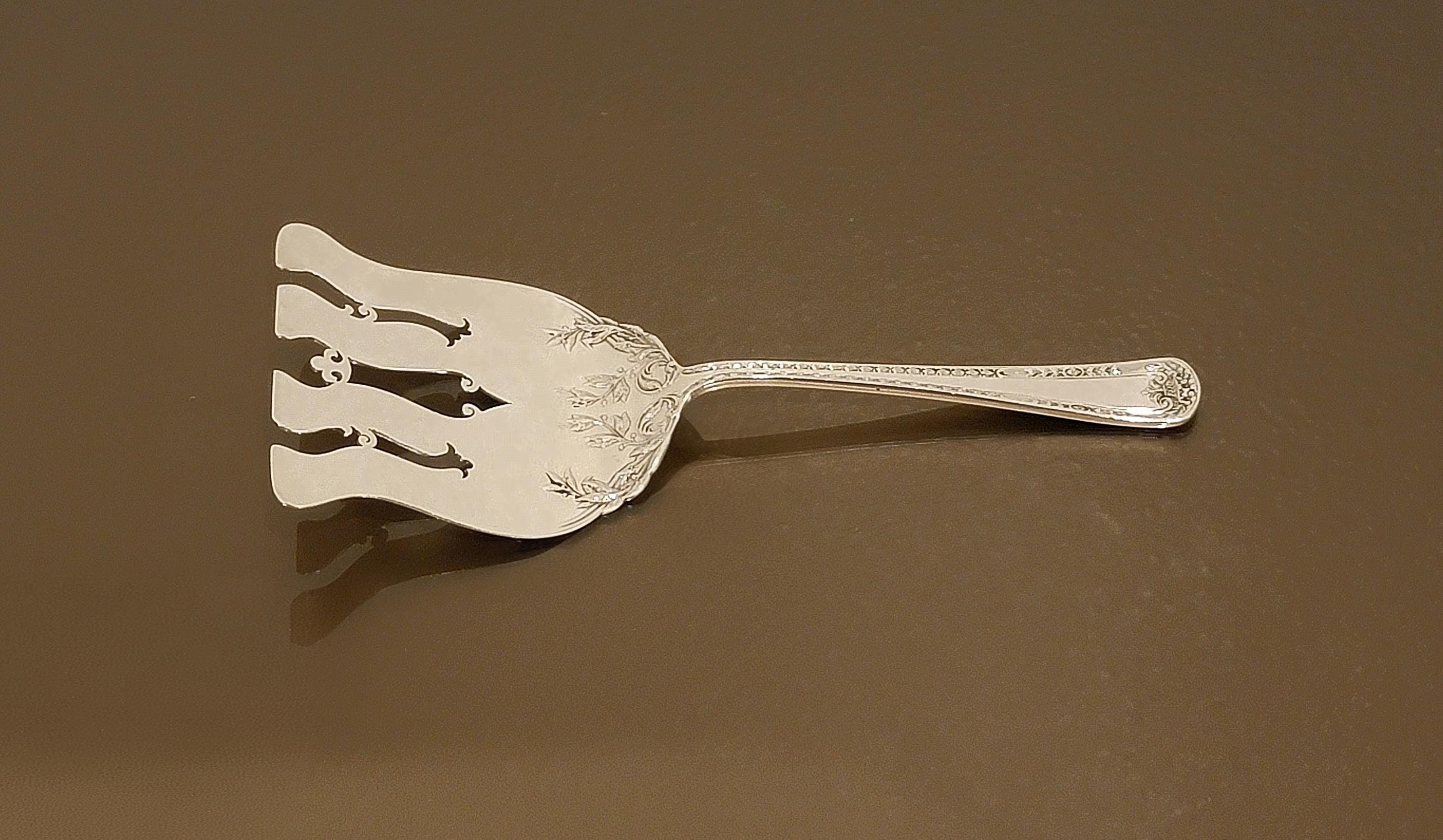 A rare and elegant antique asparagus serving fork by Dominick & Haff, one of the most respected American silversmiths of the late 19th and early 20th centuries. Crafted in solid sterling silver, this large, sculptural serving piece features a beautifully pierced and engraved server head with flowing Art Nouveau–influenced foliate decoration and a refined, balanced handle.
