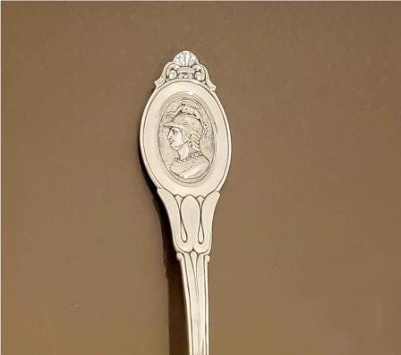 During the mid-1800s, the American silver industry experienced a surge of innovation and artistic expression, driven by a growing middle class with a taste for luxury. Silversmiths dedicated themselves to crafting a wide array of new styles and patterns. In the 1860s and 1870s, silver flatware featuring portrait medallions—drawing inspiration from classical coins and cameos—became especially fashionable, with nearly every silversmith developing their own variation of the "medallion" motif. One such example is a ladle produced by the F. A. Durgin company of Saint Louis, Missouri, whose design closely resembles a medallion pattern first patented in 1862 by New York silversmith John R. Wendt. While not a direct imitation, Durgin's design shows clear awareness of Wendt's earlier work. A publication from 1878 titled A Tour of St. Louis praised Durgin for refining public taste in the decorative arts, noting that his workshop produced some of the finest solid silver items in the country and was favored by the most affluent citizens of the western states.