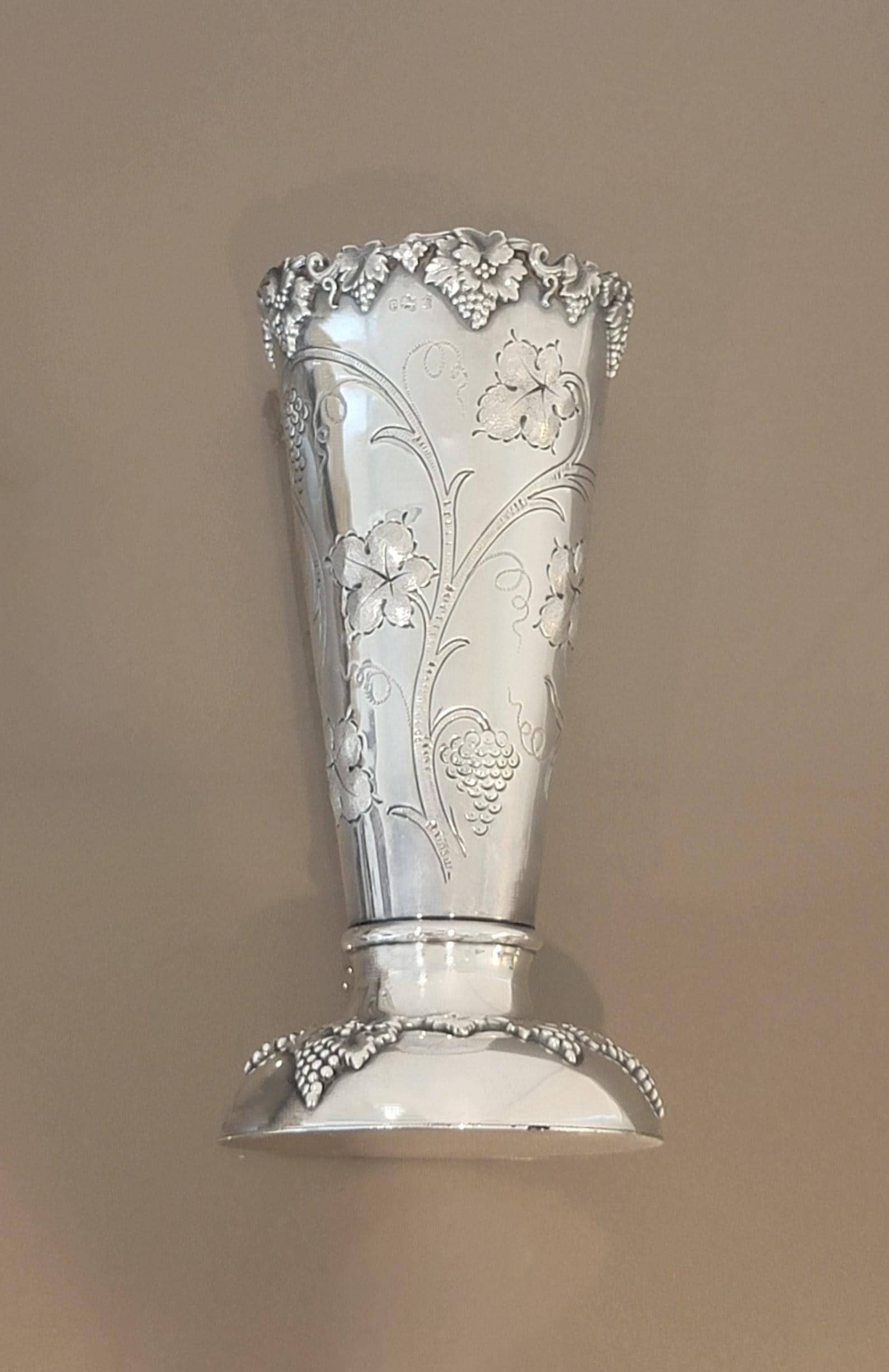 This vase reflects the refined neoclassical style of late 18th-century silverwork. It makes a striking decorative accent or a thoughtful gift for a collector of Georgian silver.