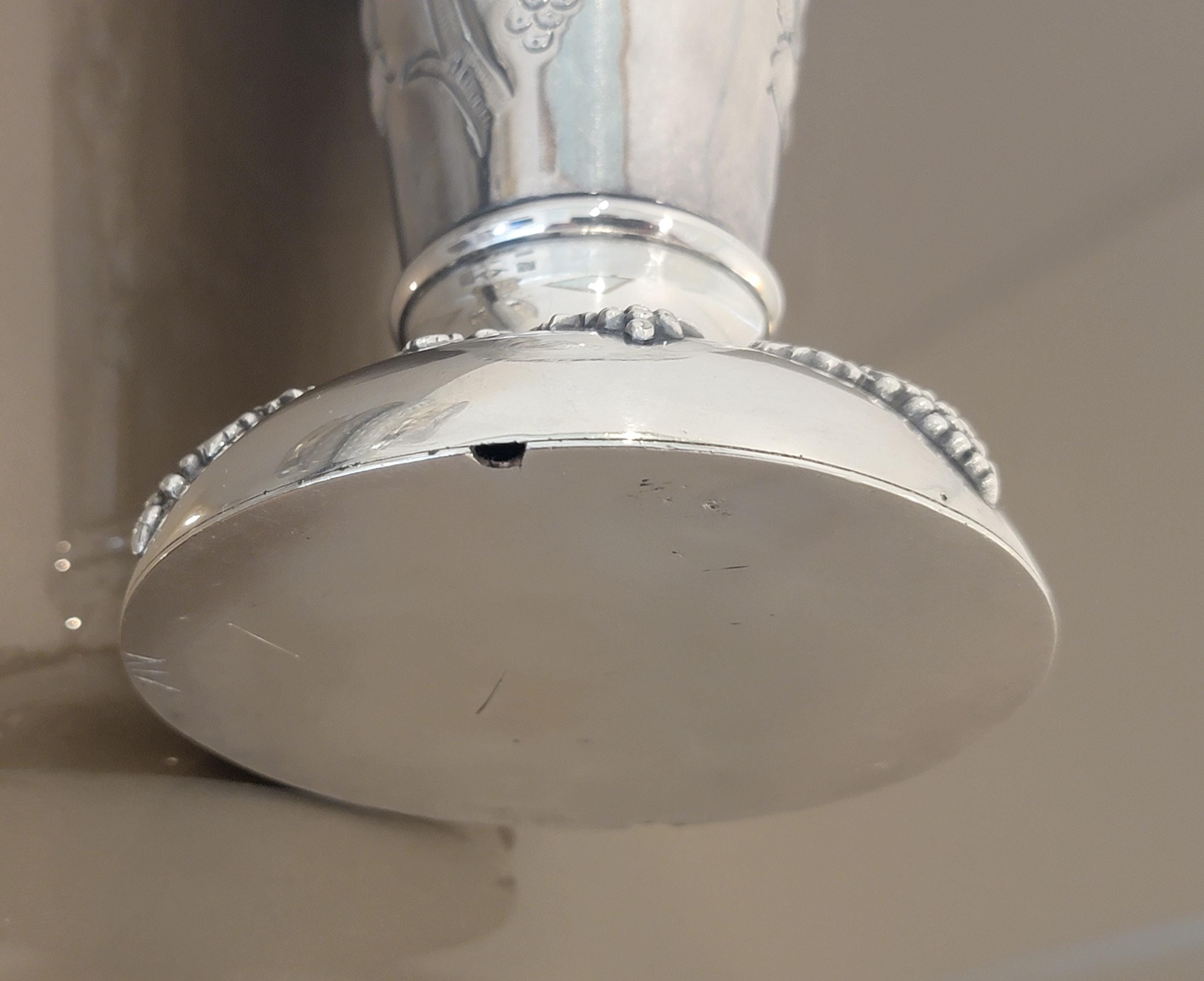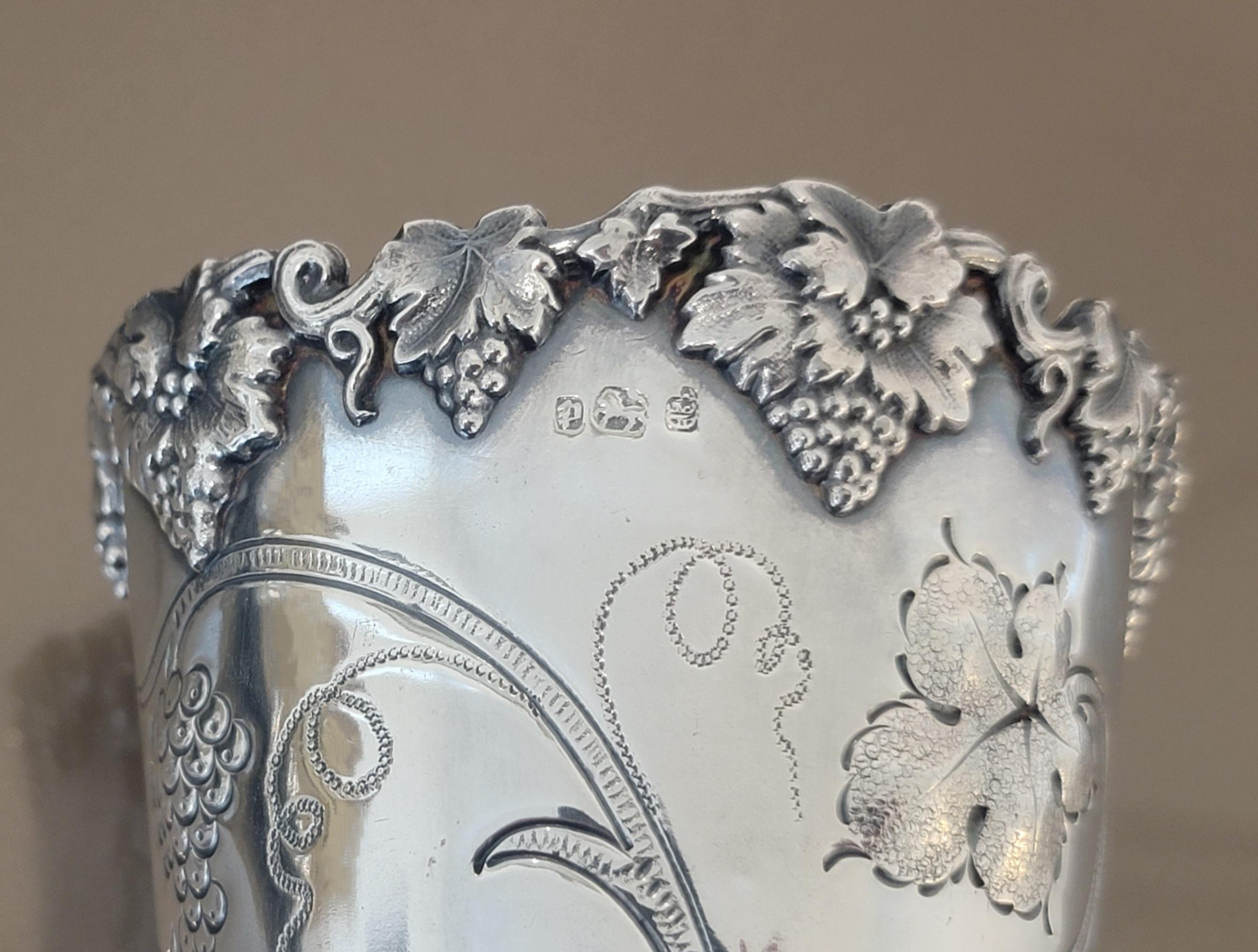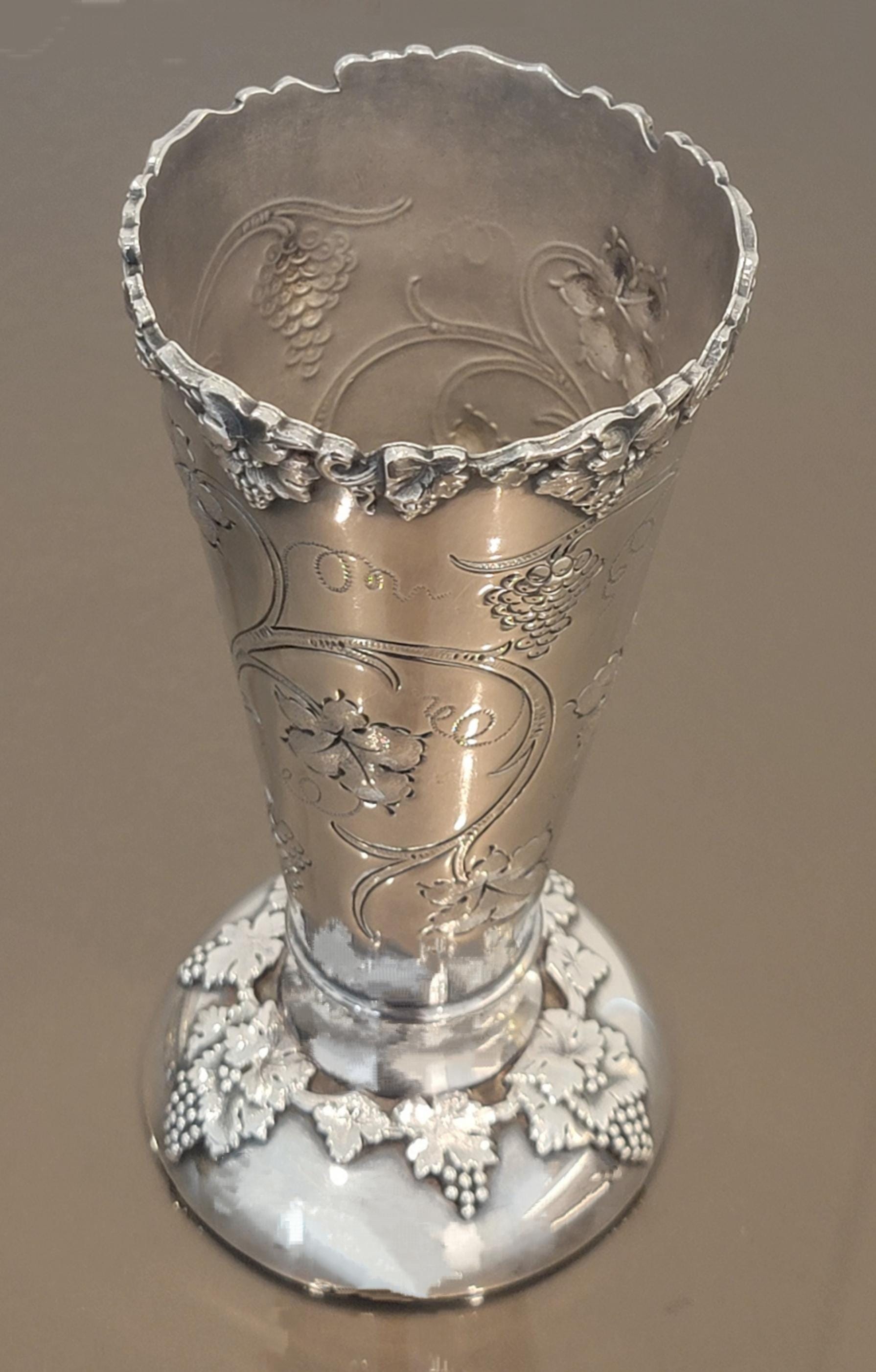 • Design: Beautifully decorated with applied grapevine and leaf motifs around the rim and base, and hand-engraved scrolling vinework on the tapered body.
