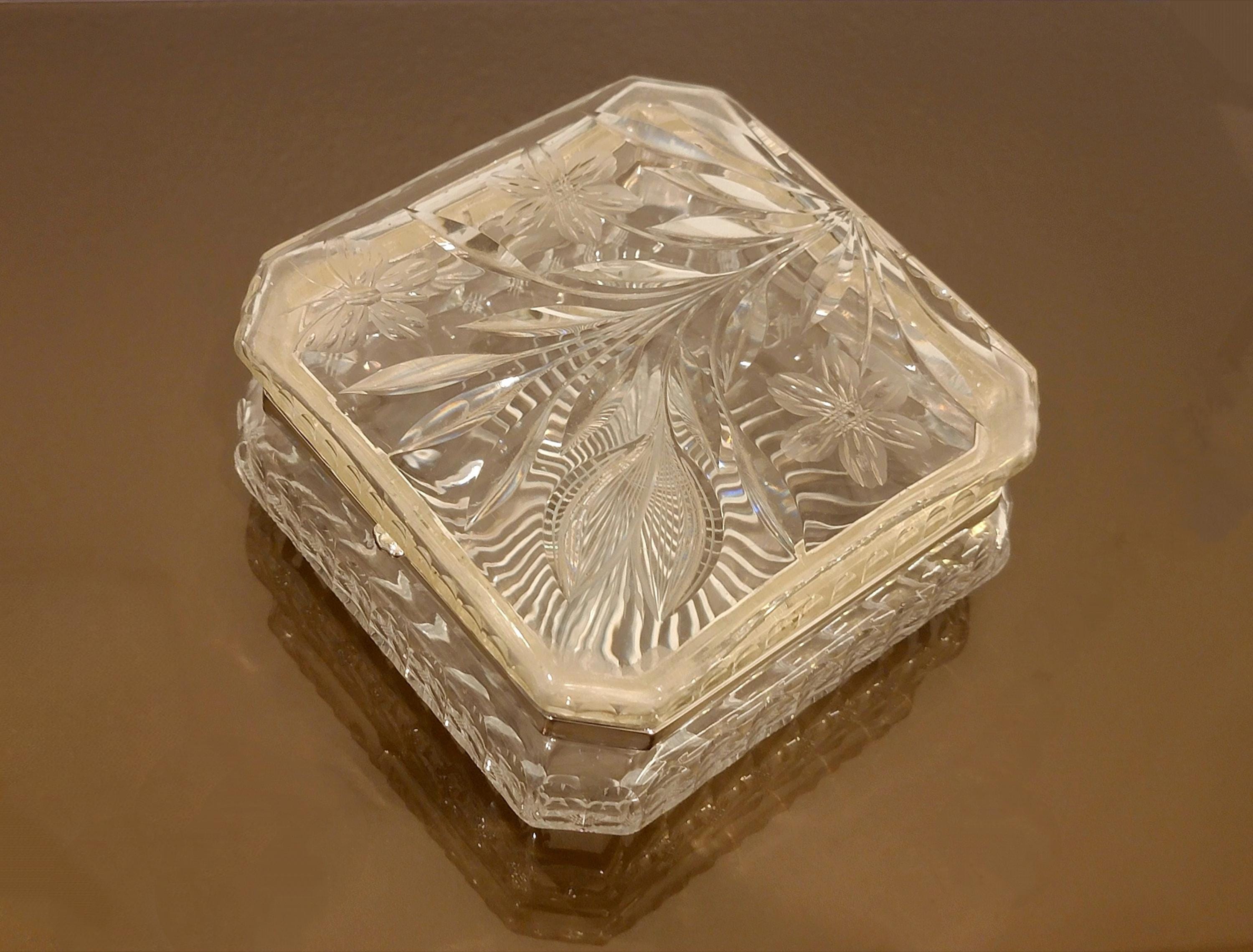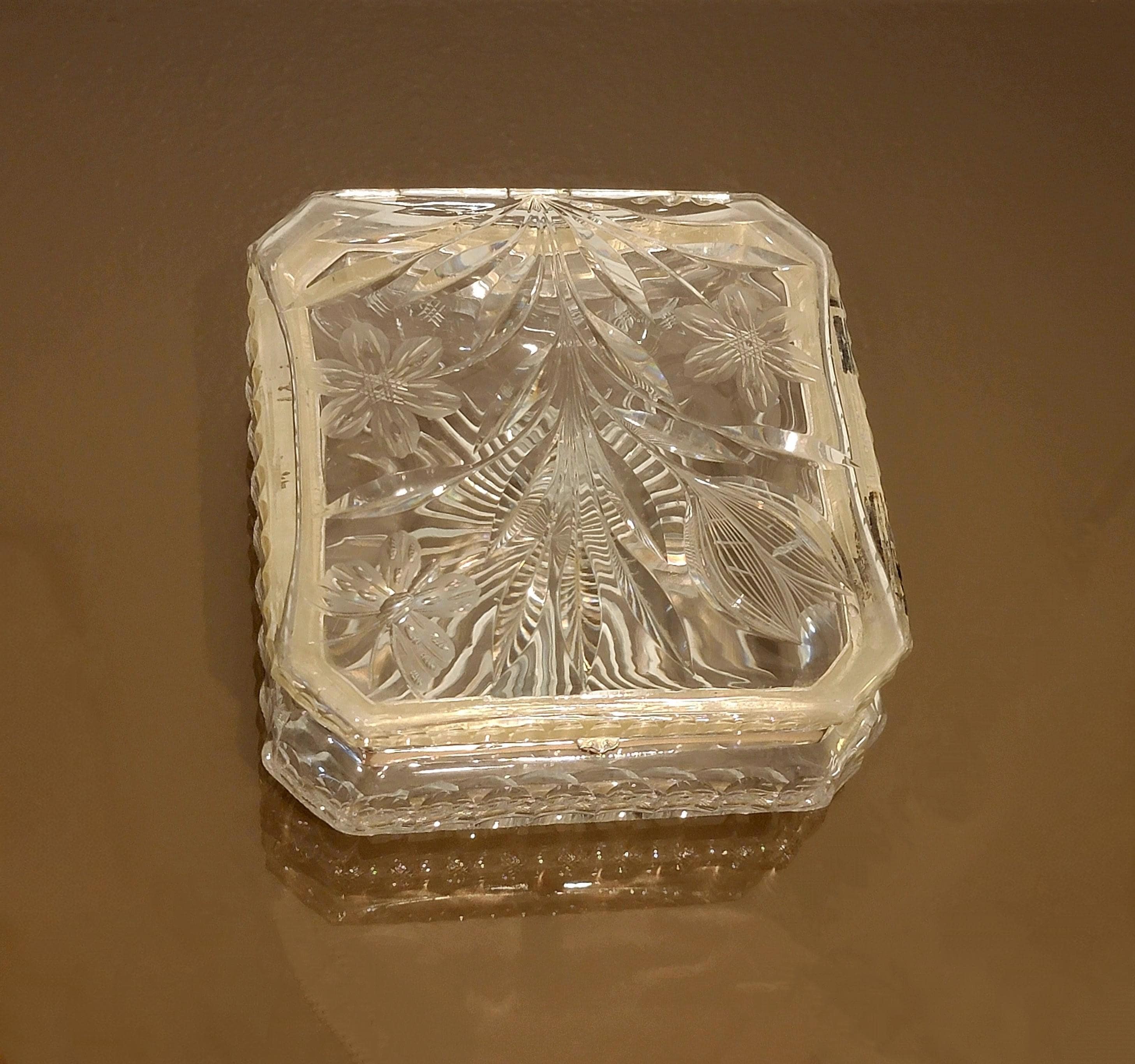 This exquisite antique dresser box was crafted by Pairpoint, one of America’s most celebrated glassmakers. The clear pressed glass is deeply cut with floral and leaf designs on the lid, complemented by a radiant starburst pattern on the base. A polished silverplated rim and hinge frame the box, giving it refined elegance and strength. The rim is engraved with the graceful script monogram “R.C.M.”, adding a personal touch and connection to its history.