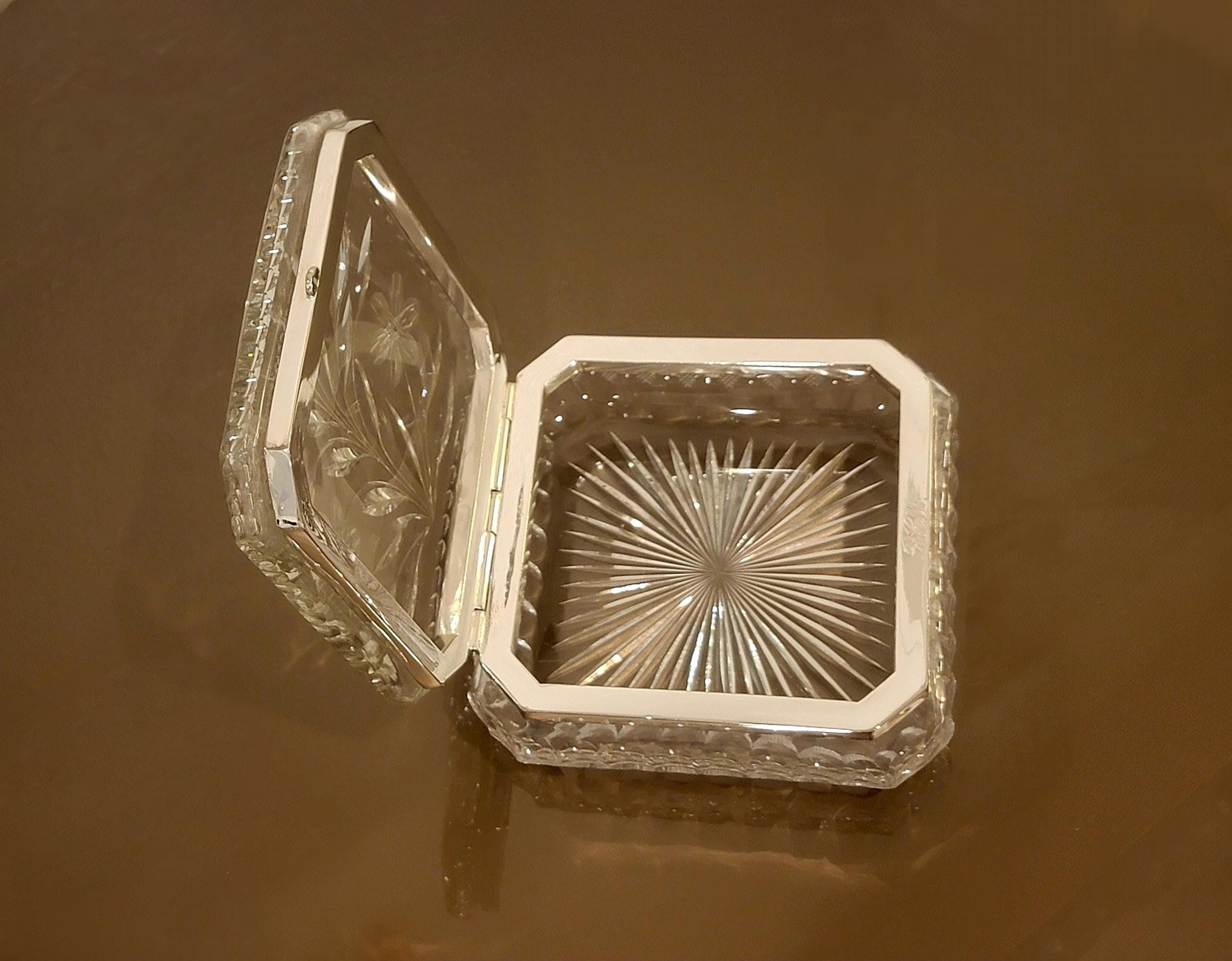 • Features: Hinged lid with etched floral design, radiant starburst base, silverplated rim with engraved monogram