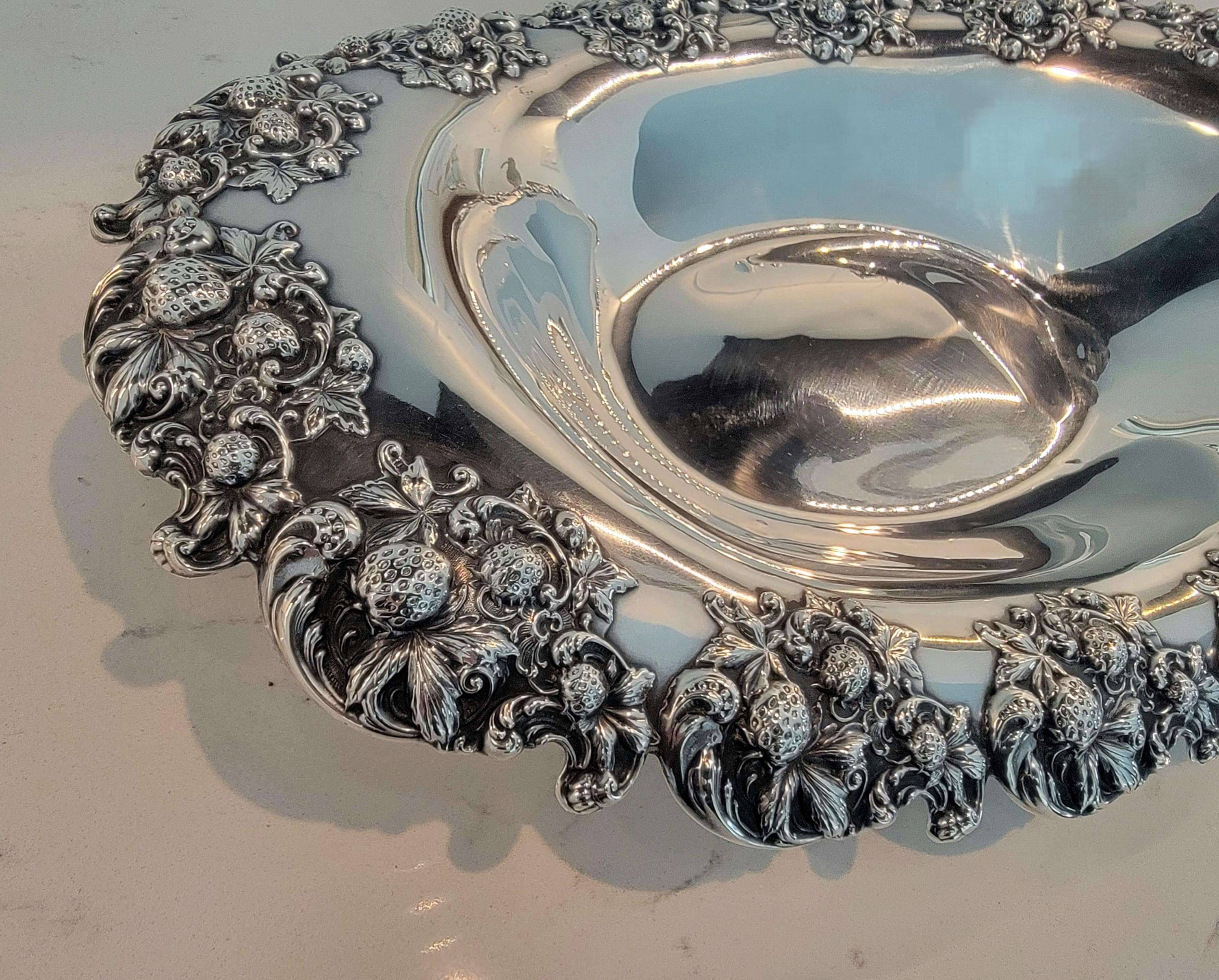 The bold repoussé border, with its clusters of detailed fruit and deep relief design, is characteristic of Mauser’s masterful craftsmanship during the Art Nouveau period. Large, elegant, and versatile, this piece works beautifully for serving bread, pastries, or fruit — or as a striking centerpiece for display.