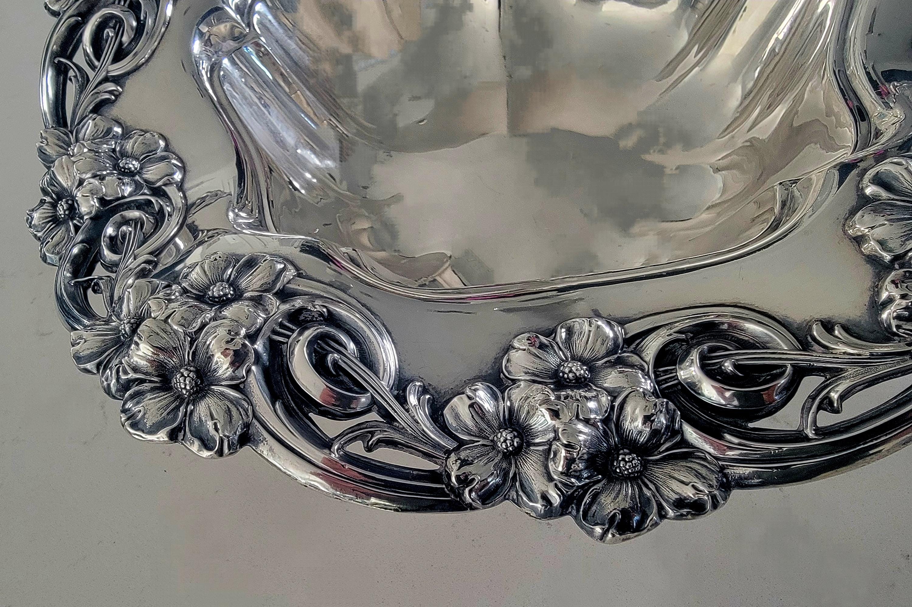 The wide, scalloped rim is richly decorated with raised dogwood blossoms and flowing vines, a signature motif of the Art Nouveau movement. The deep, polished center creates a striking contrast, showcasing both the beauty of the detailed repoussé border and the graceful overall form.