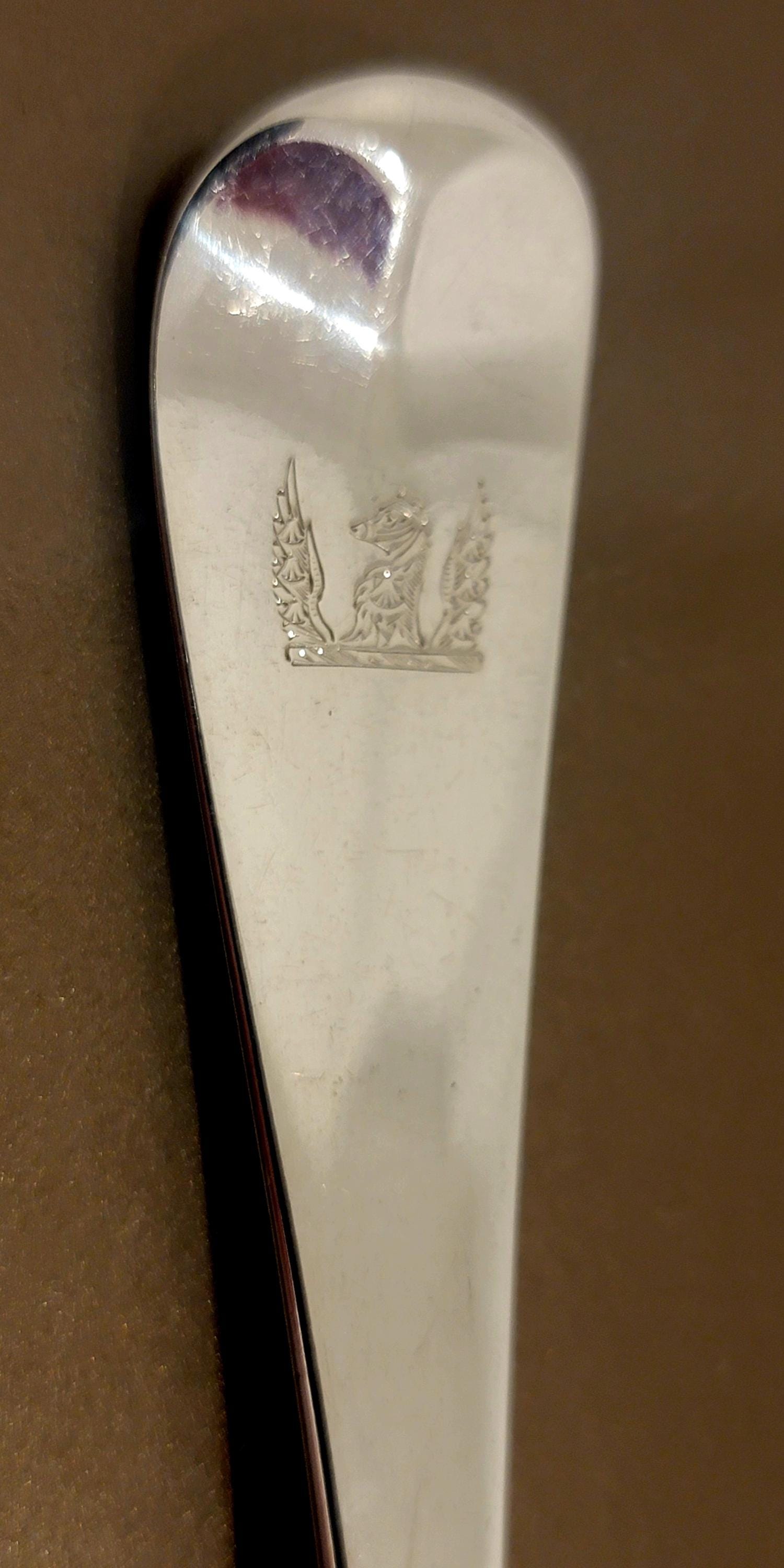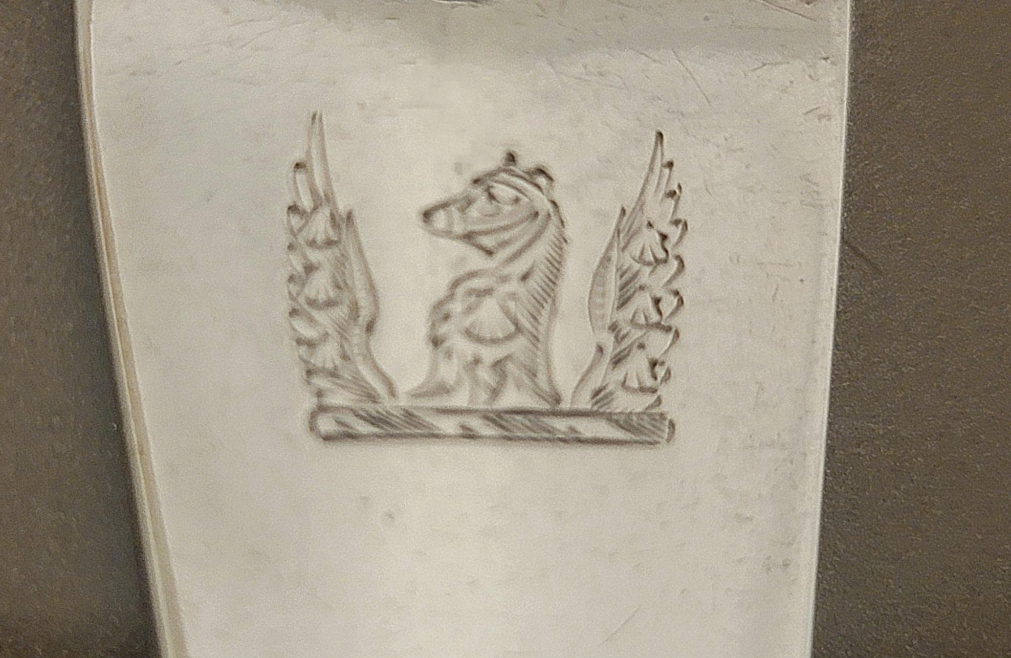 • Engraving: Family crest (griffin’s head with wings and escallops)