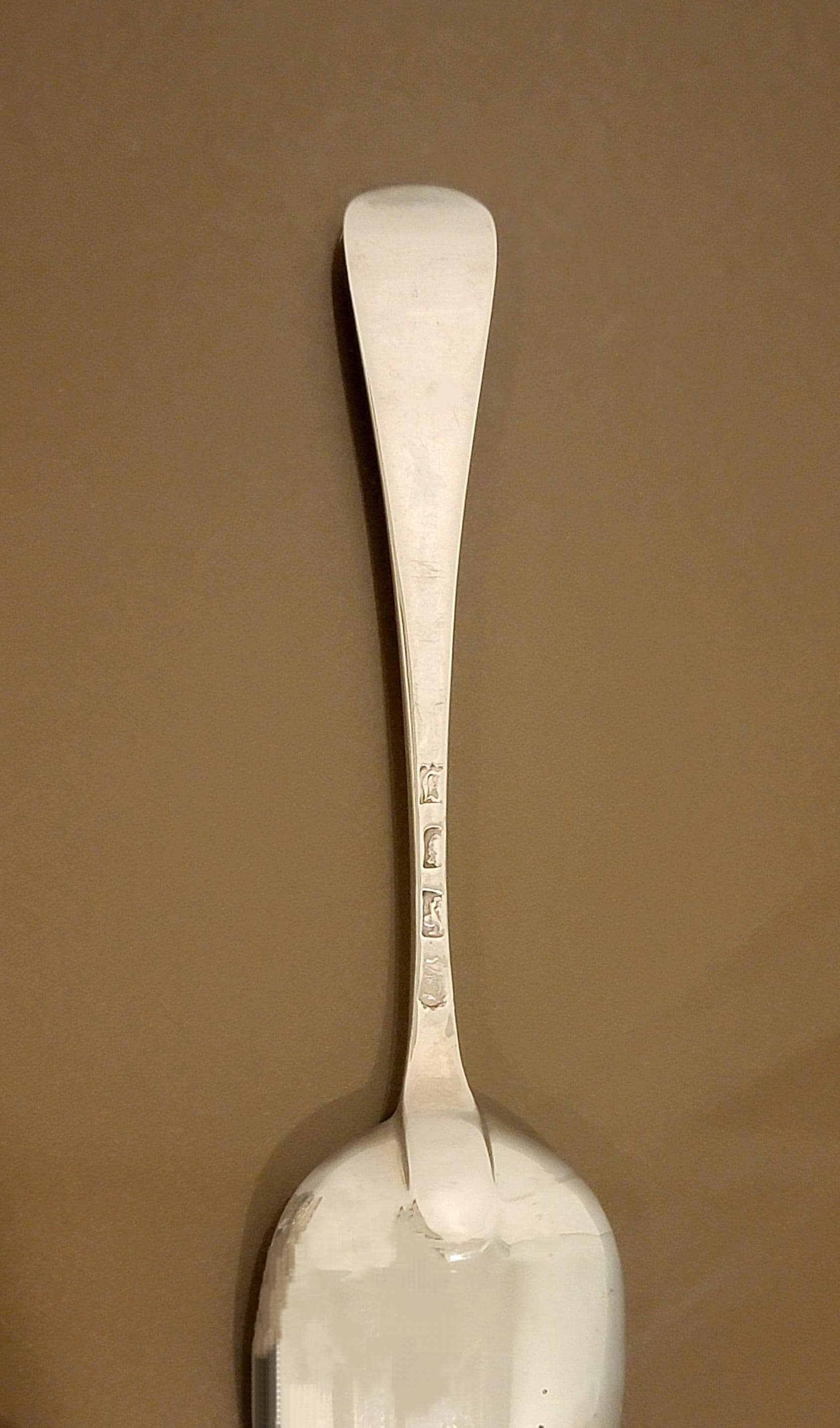 This fine Georgian sterling silver tablespoon was assayed in London in 1764, during the early reign of King George III. Crafted in the elegant Old English pattern, it bears a full set of hallmarks including the lion passant (sterling standard), crowned leopard’s head (London), and the 1764 date letter. The maker’s mark is attributed to William Shaw & William Priest, respected London spoonmakers of the mid-18th century.