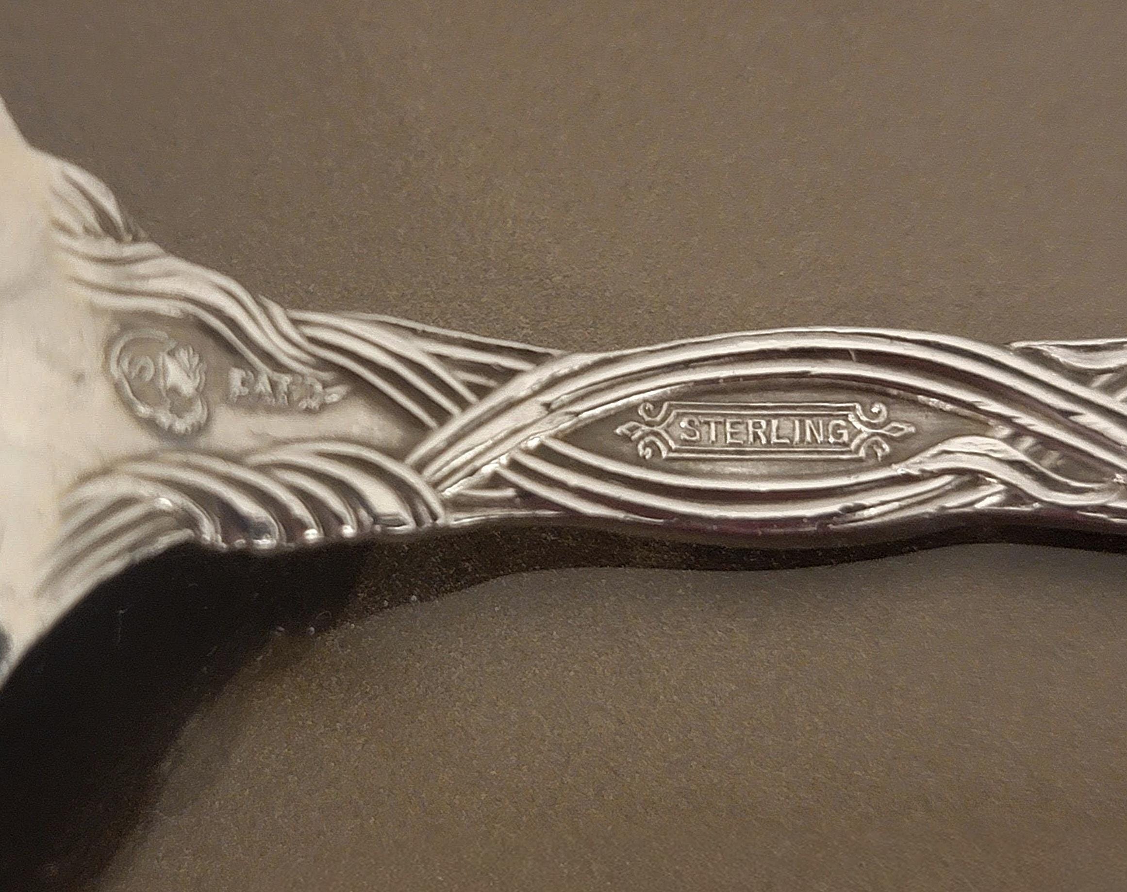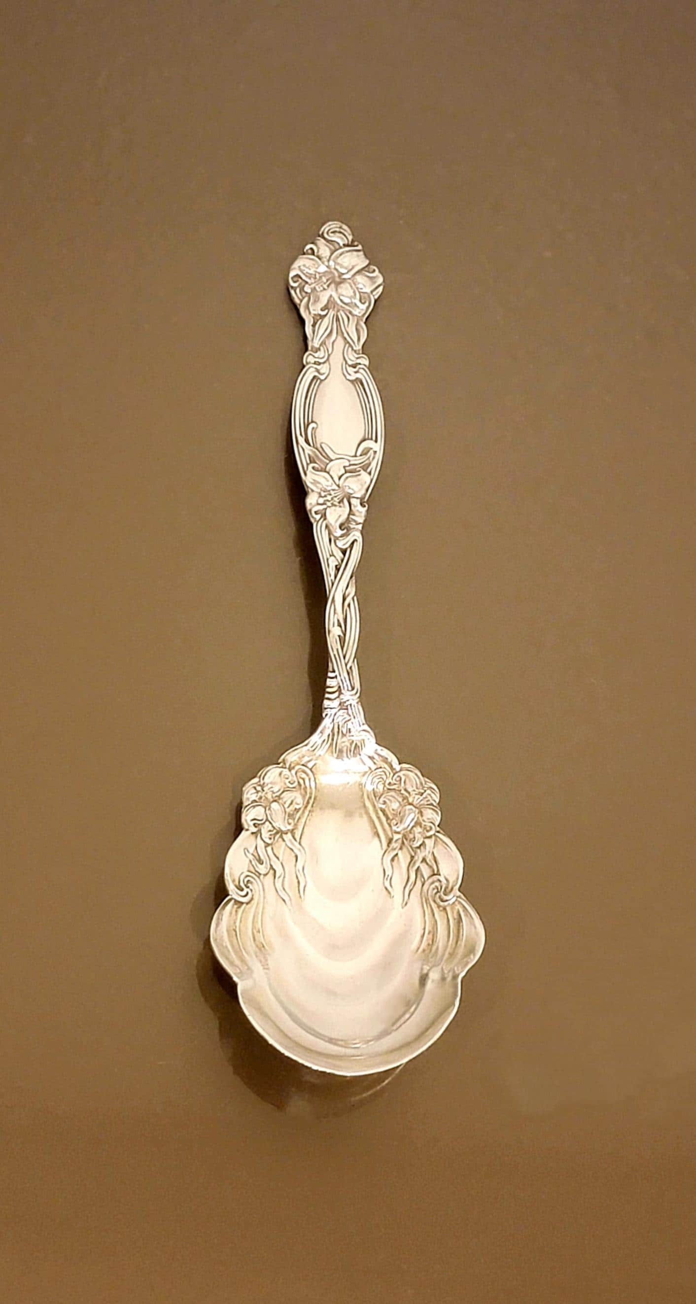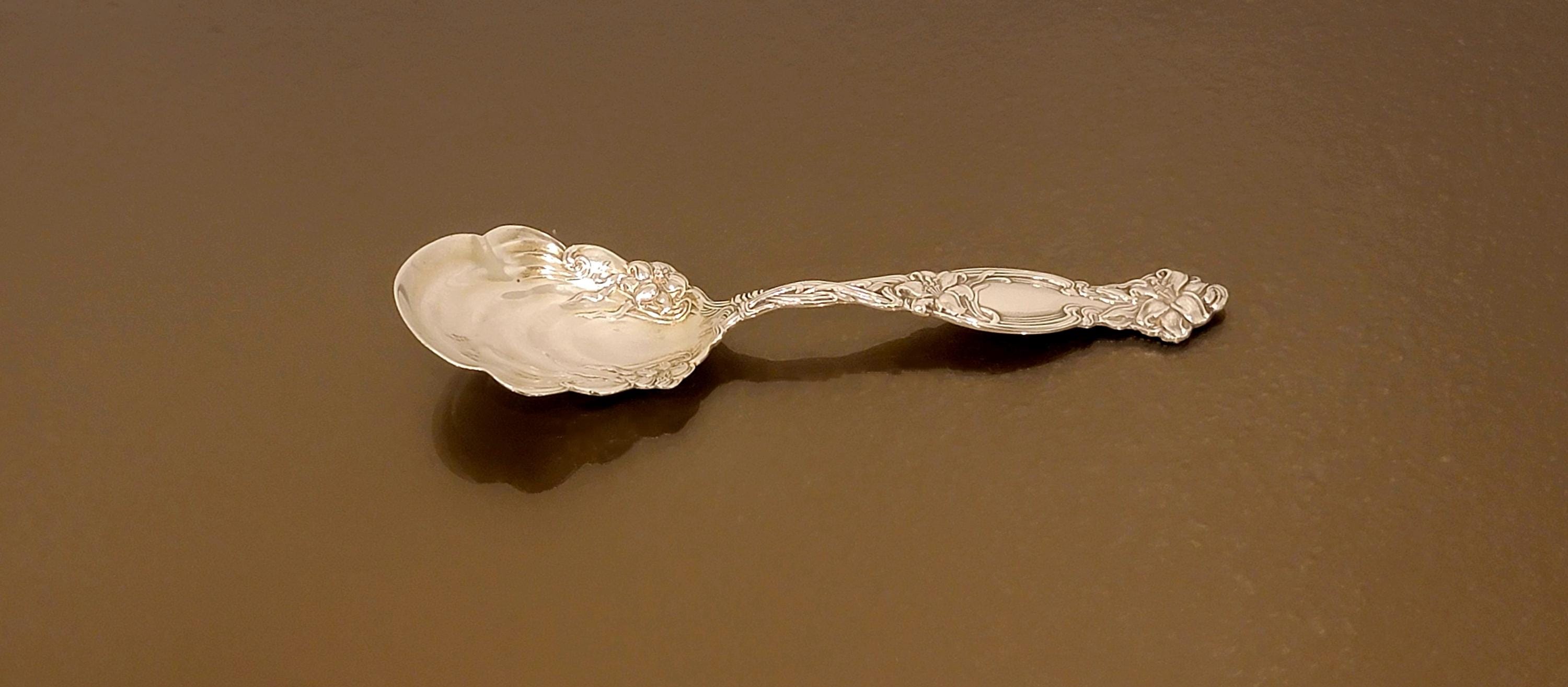 This exquisite antique sterling silver jelly/preserve spoon is crafted in the Frontenac pattern by International Silver, introduced in 1903. A favorite among collectors, Frontenac is celebrated for its dramatic Art Nouveau tiger lily design, with blossoms, vines, and flowing leaves climbing the handle in exquisite detail.