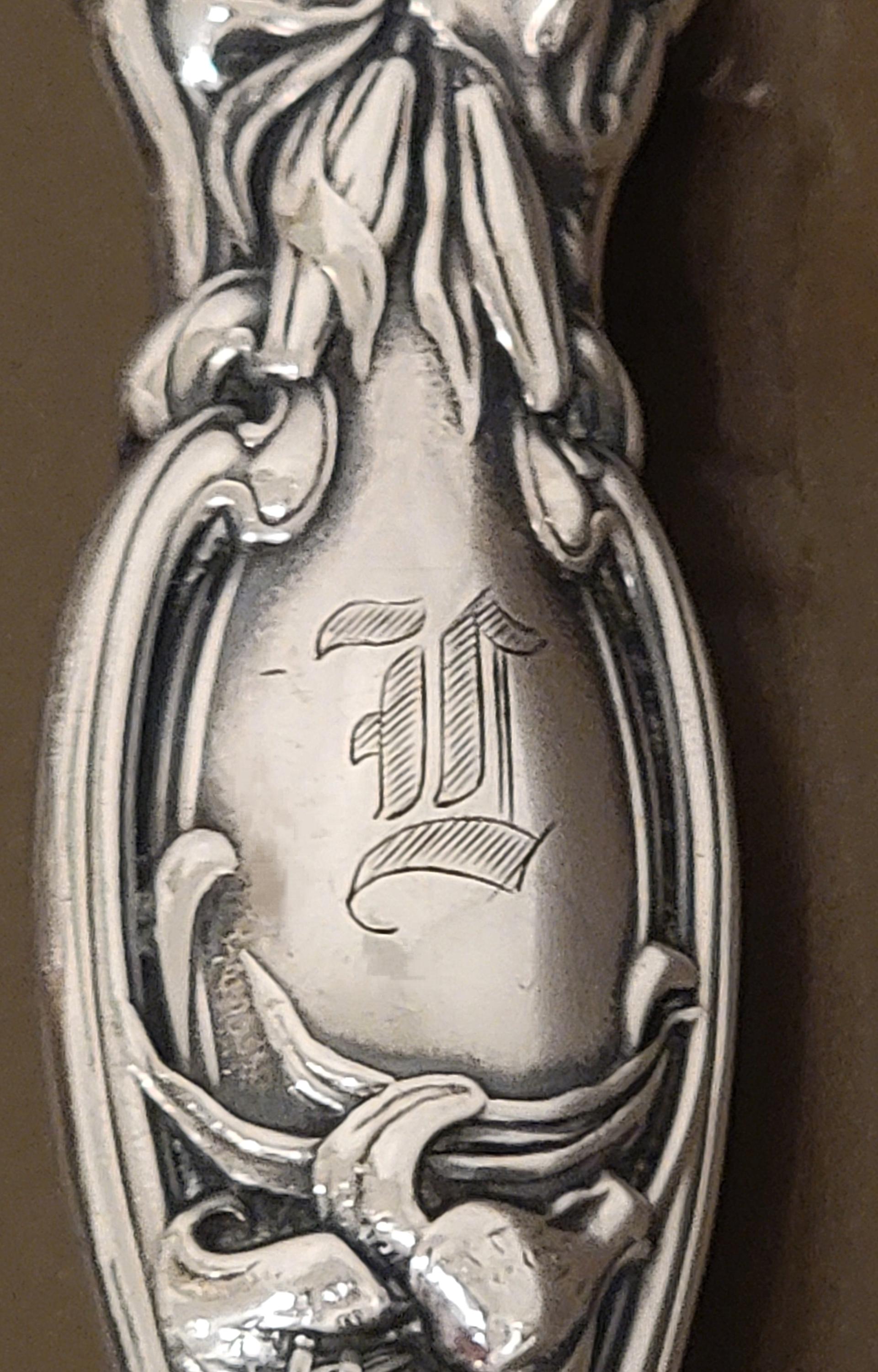 The handle blooms with richly detailed lilies and scrolling vines, a true testament to the Art Nouveau celebration of nature. A hand-engraved script monogram “L” adds a touch of romance, linking this piece to its original owner and giving it the soul of an heirloom.