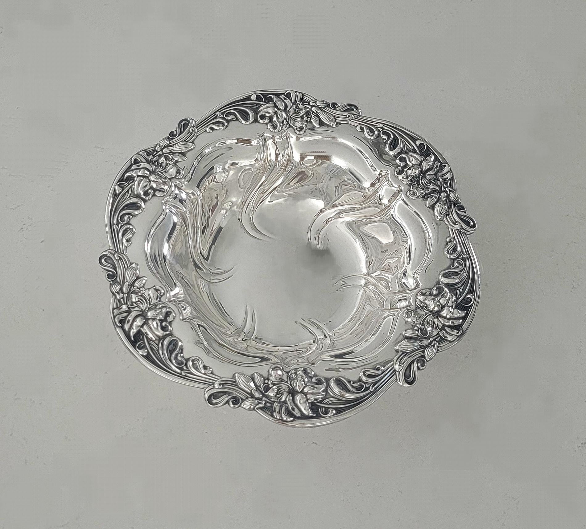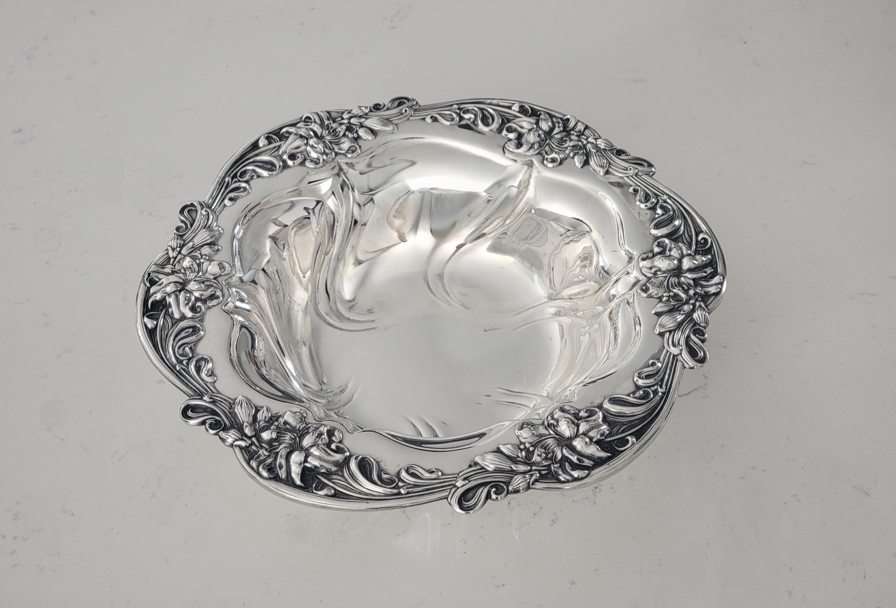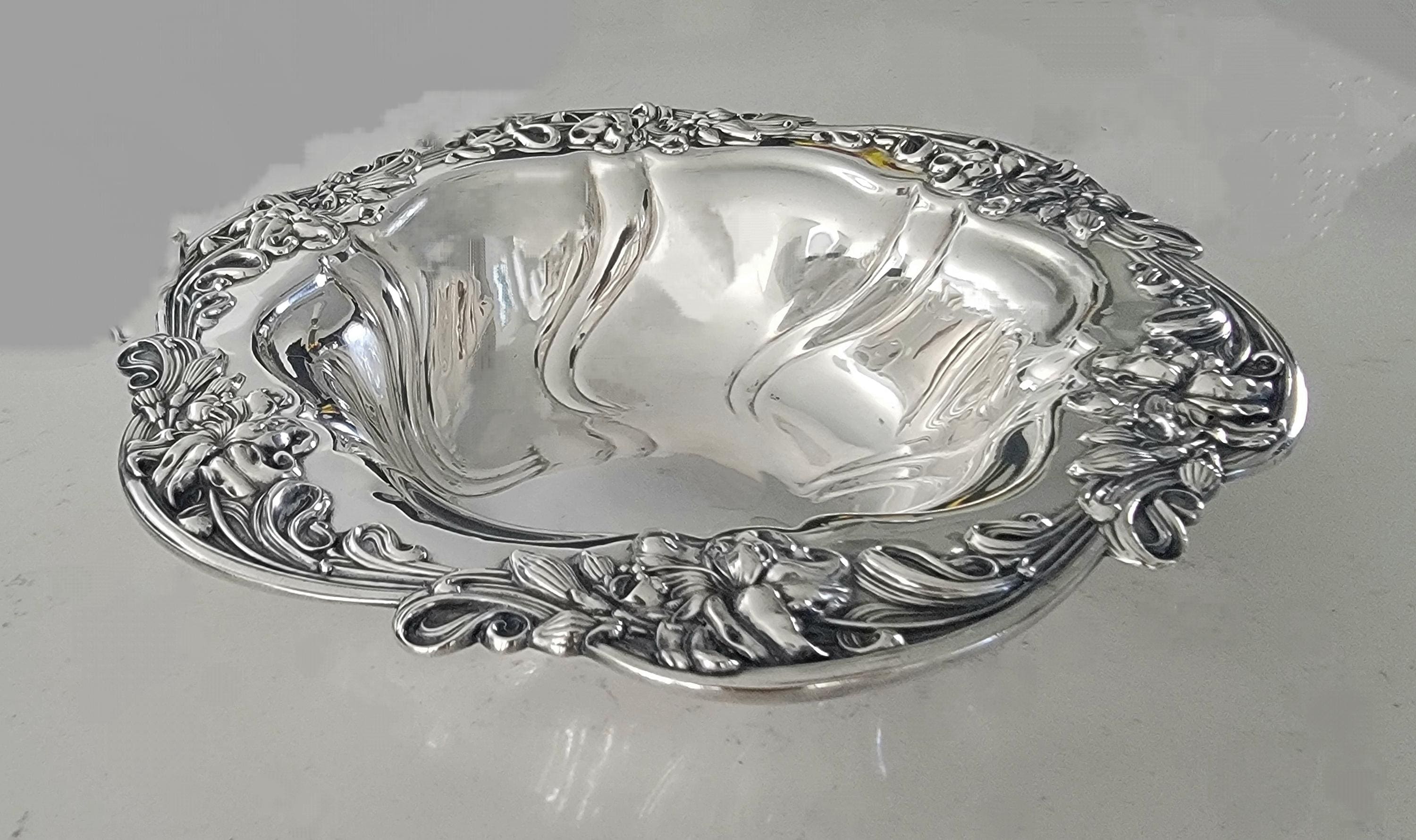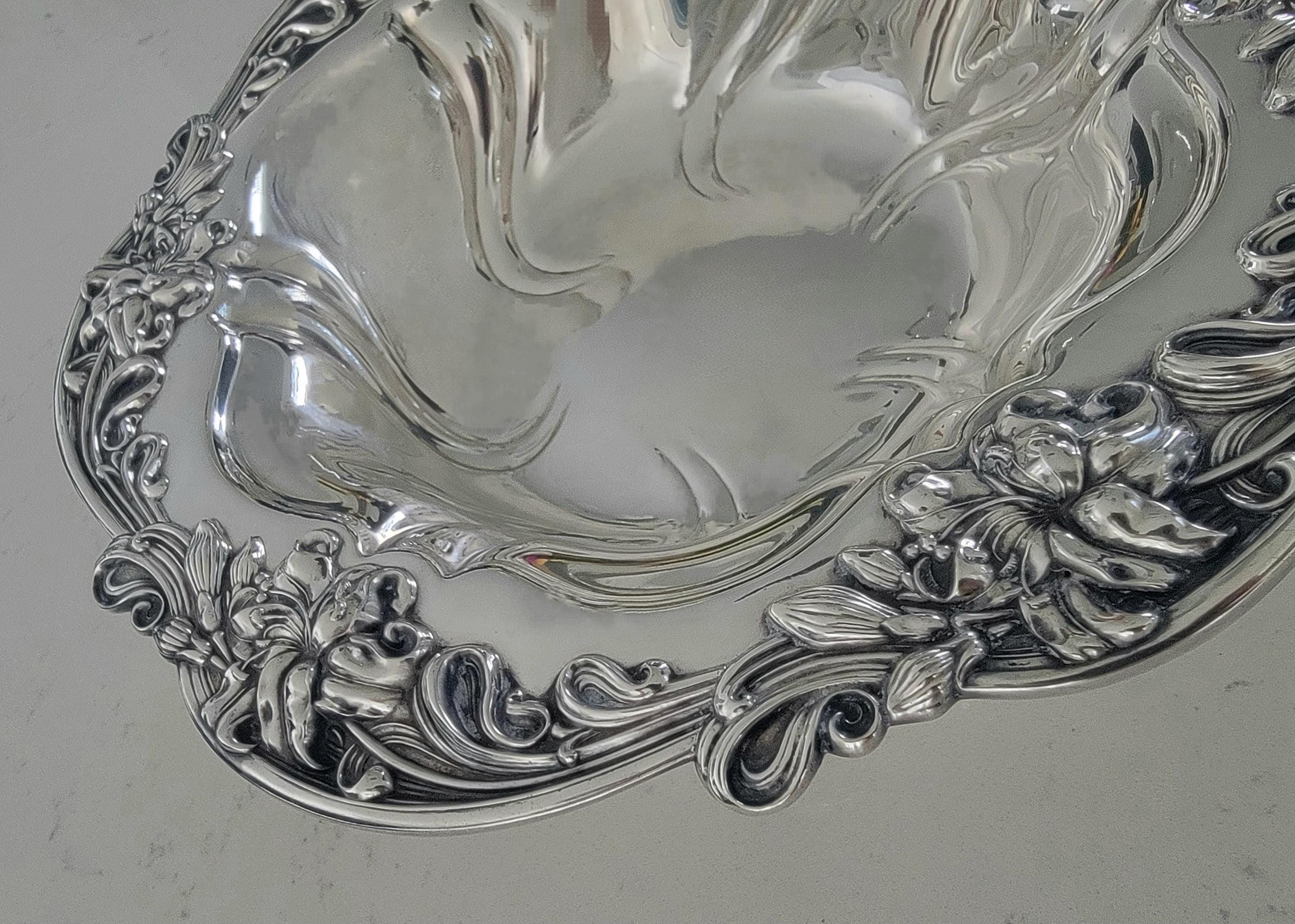 This stunning Meriden Britannia sterling silver bowl, pattern number 654, showcases a flowing Art Nouveau floral and scroll motif that epitomizes the elegance and craftsmanship of early 20th-century American silver. The raised lilies and swirling lines move gracefully around the rim, giving the bowl a sense of motion and natural beauty typical of the Art Nouveau era.