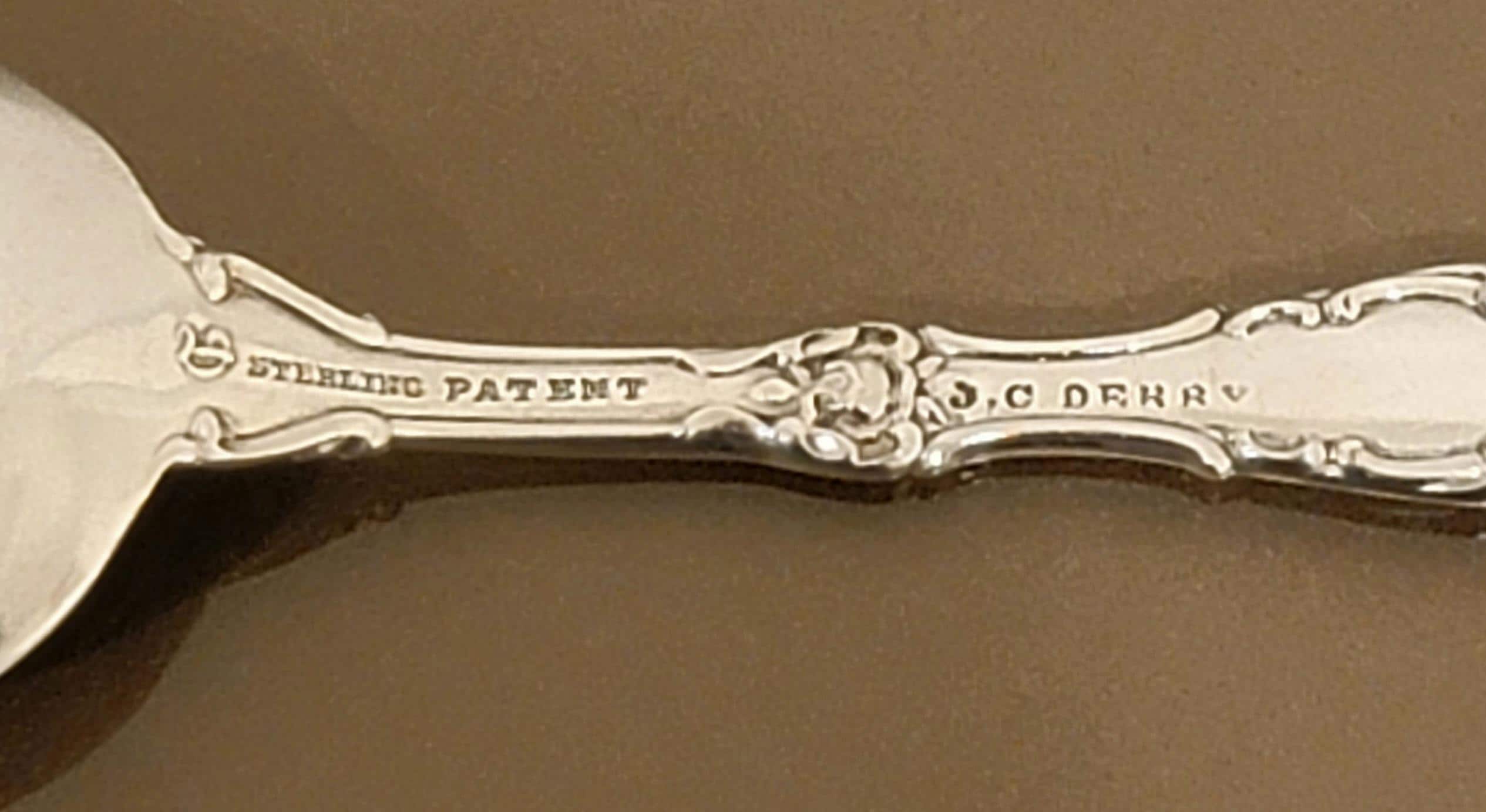 The back of the handle is marked “STERLING PATENT” with the retailer’s name J.C. DEHR, and displays Durgin’s signature quality in weight, crispness, and artistic detail.