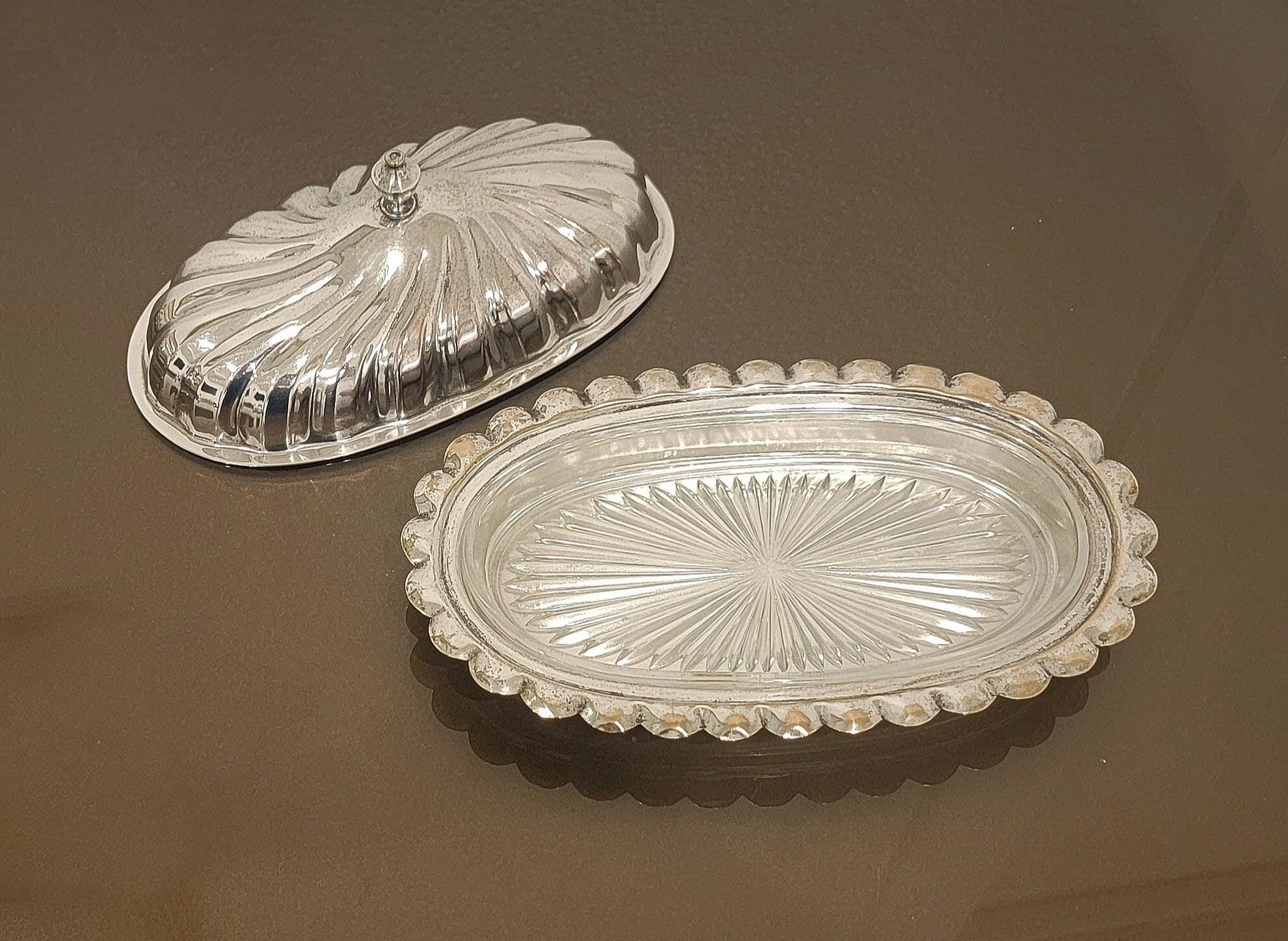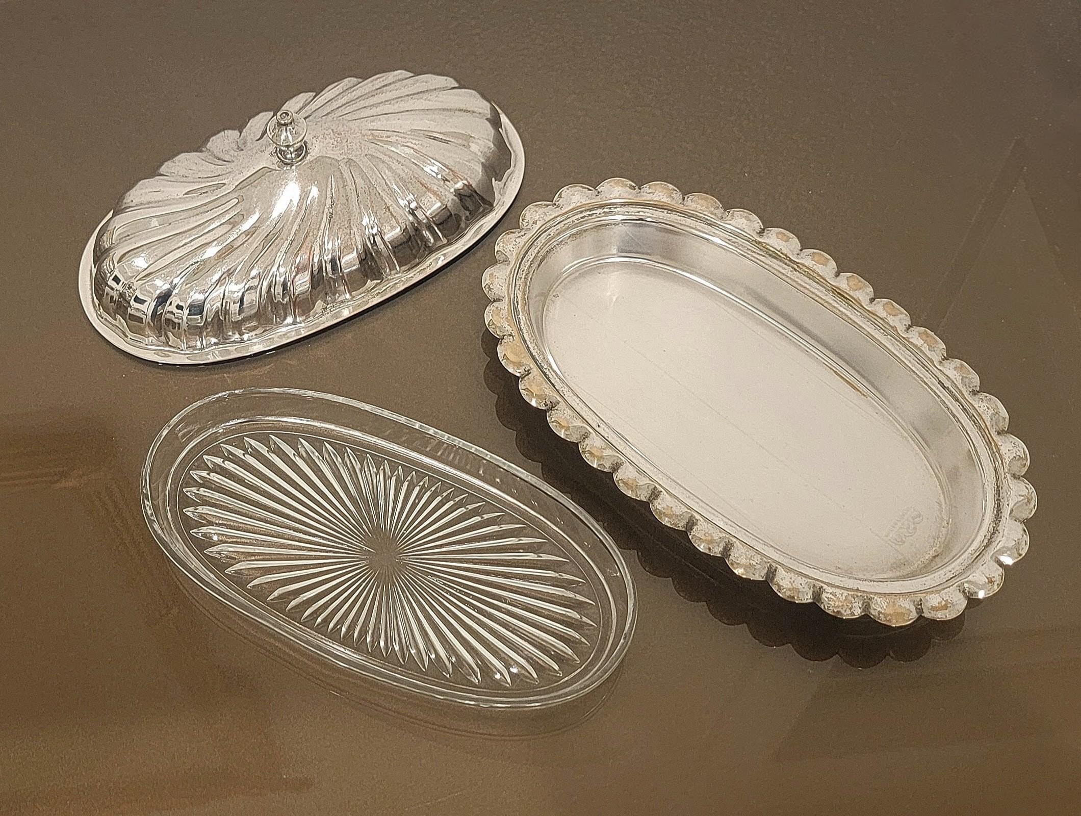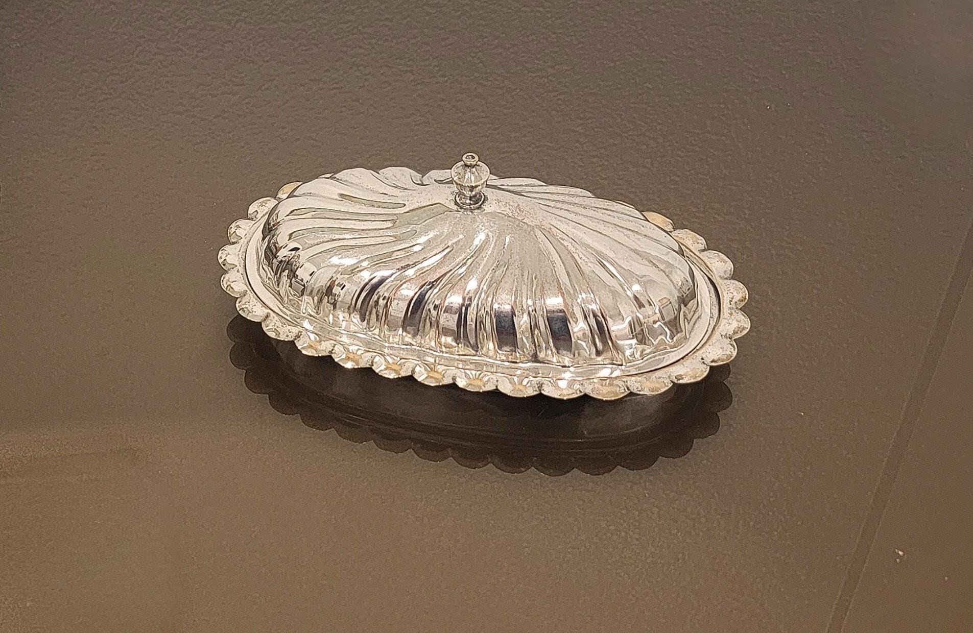 Add a touch of timeless elegance to your breakfast or dinner table with this vintage silver-plated covered butter dish, complete with its original pressed-glass liner. The scalloped oval base and swirled domed lid create a graceful, classic presentation that complements both traditional and modern table settings.