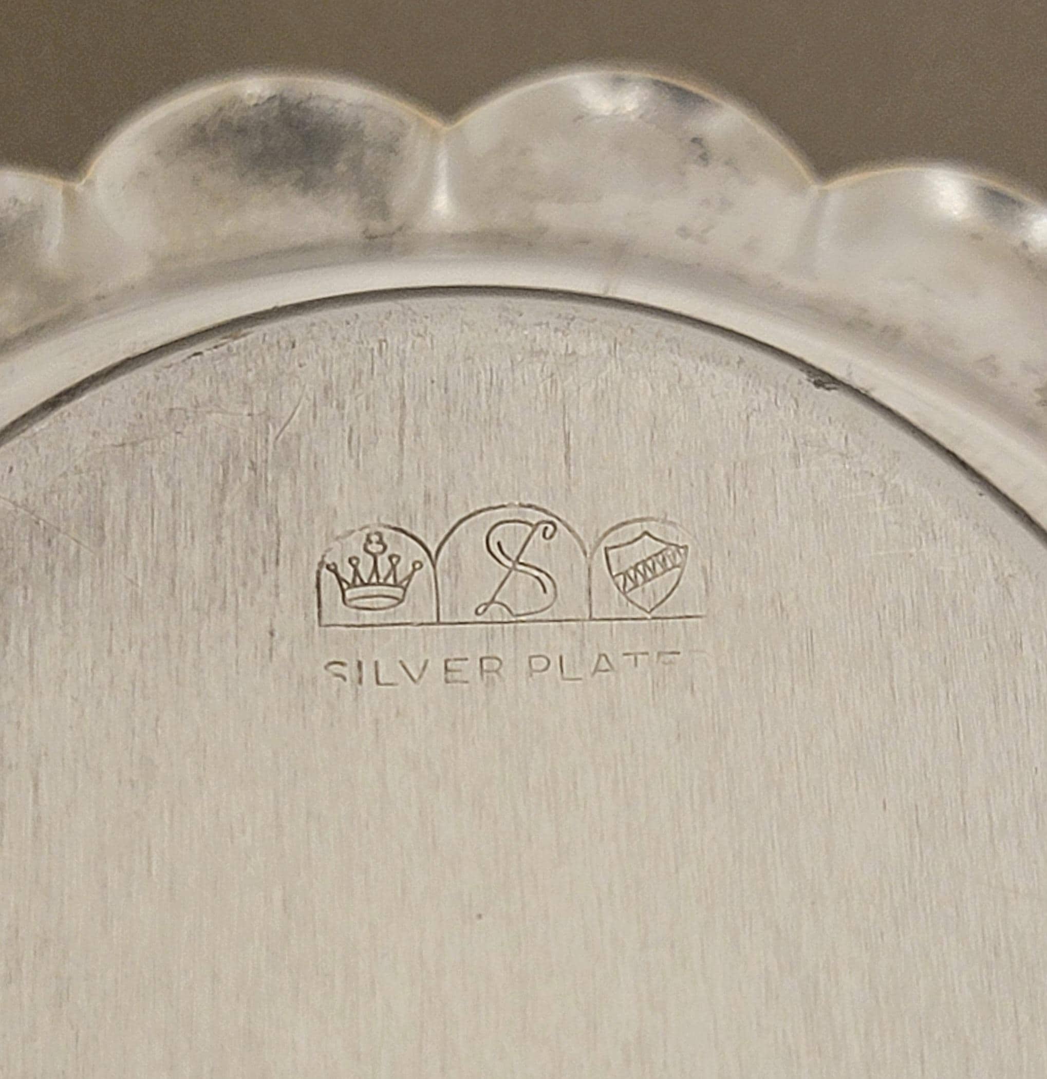 • Markings: Crown • Script “S” • Shield hallmarks, stamped SILVER PLATE (likely Sheffield-style or English-inspired, mid-20th century)