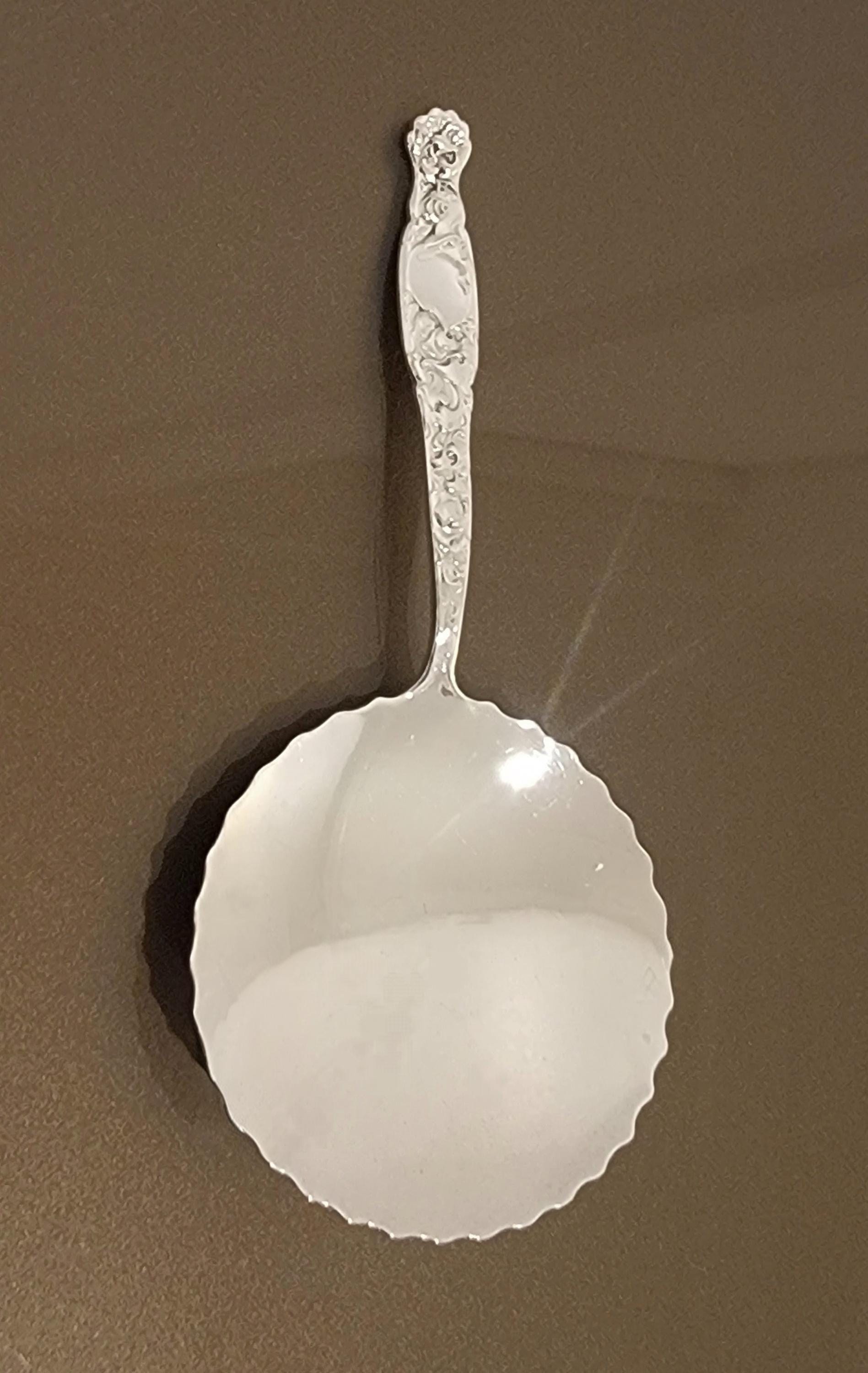 This exquisite sterling silver bon bon spoon was crafted by the Whiting Manufacturing Company in their celebrated “Heraldic” pattern, introduced in 1900. The handle showcases Whiting’s masterful Art Nouveau interpretation of medieval armorial design, featuring raised scrollwork, a shield-shaped cartouche, and intricate foliate motifs. The wide, scalloped bowl gleams with a bright, hand-polished finish — perfect for serving candies, nuts, or bon bons in elegant style.