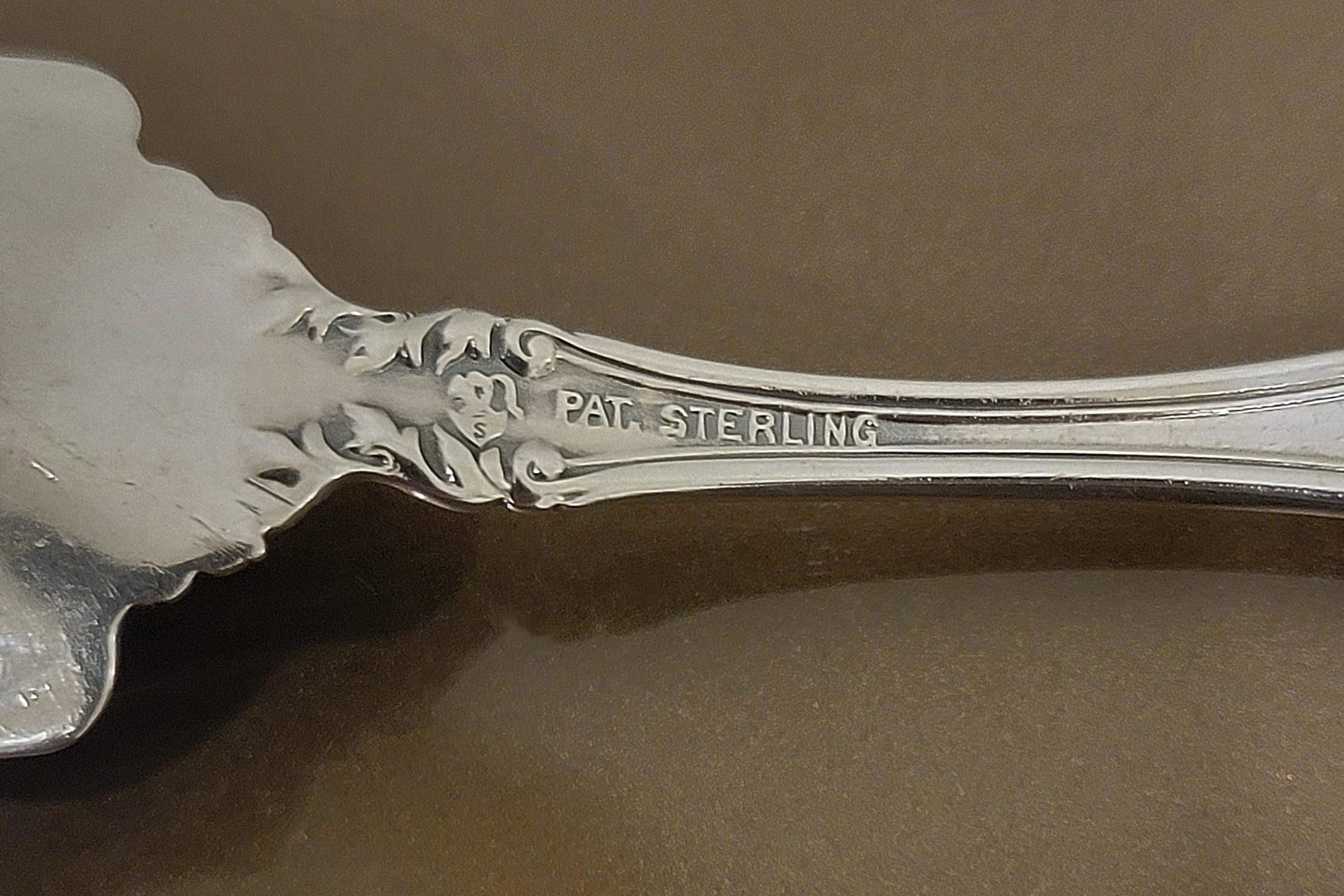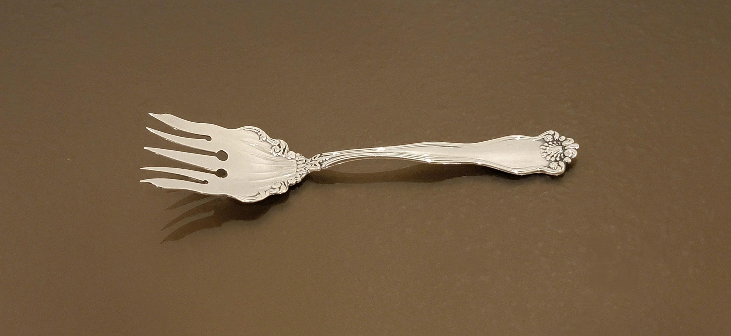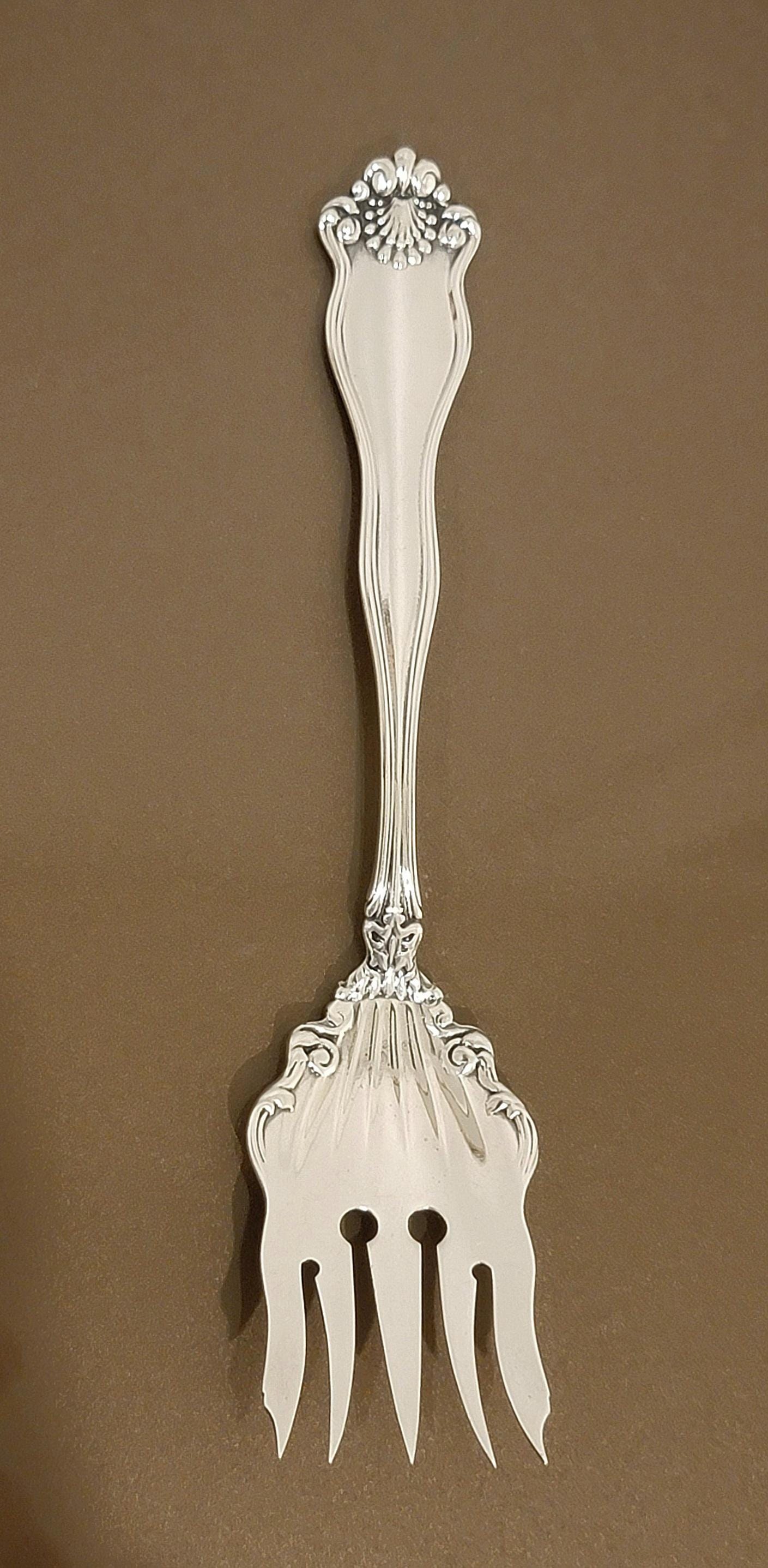 This elegant sterling silver sardine fork is in the Winchester pattern by International Silver, first introduced in 1903. Measuring approximately 6 inches long, it features a flared shell-form bowl with decorative pierced tines and a gracefully sculpted handle adorned with scroll and shell motifs.