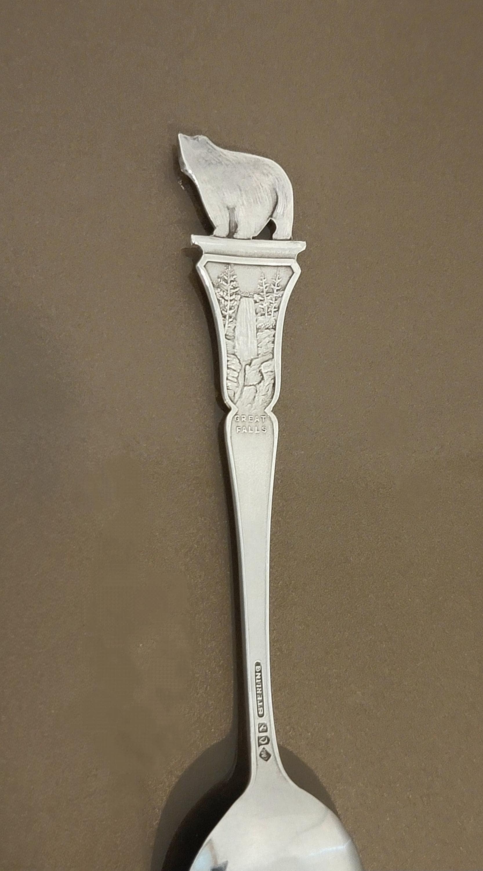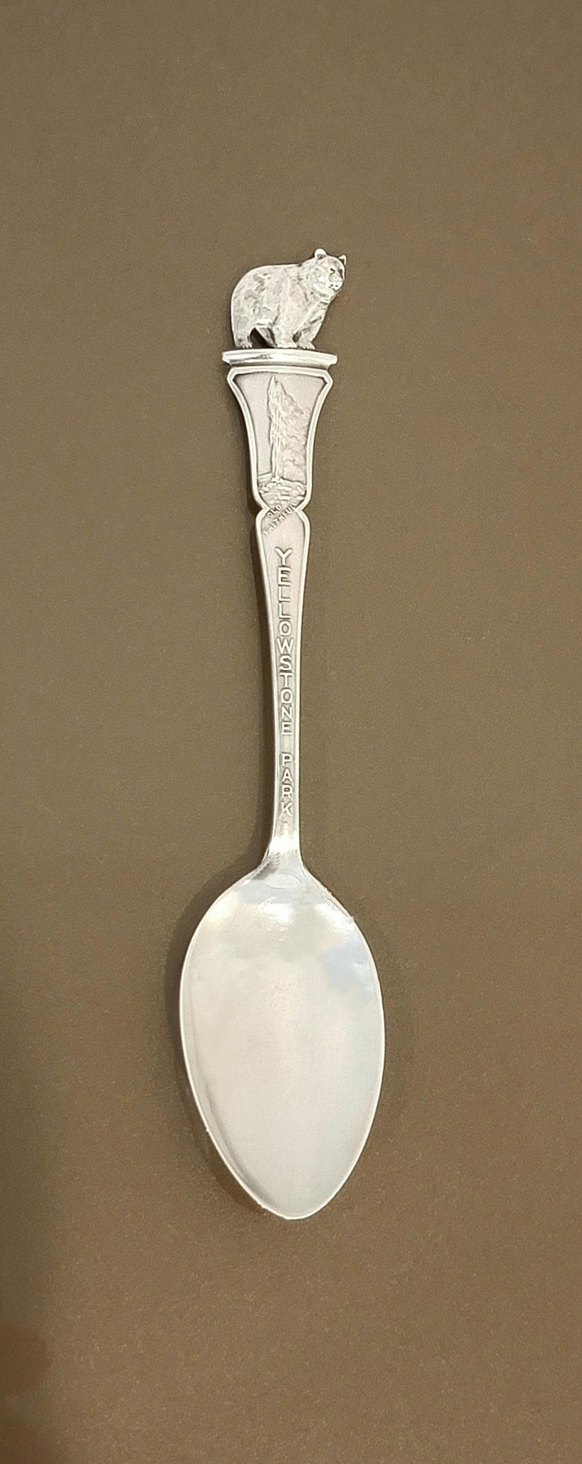 This finely made spoon features a 3D sculptural bear standing proudly at the finial, a detailed scenic panel of Great Falls, and crisp YELLOWSTONE PARK lettering down the handle. A perfect collectible for lovers of National Parks, wildlife, and antique sterling silver.