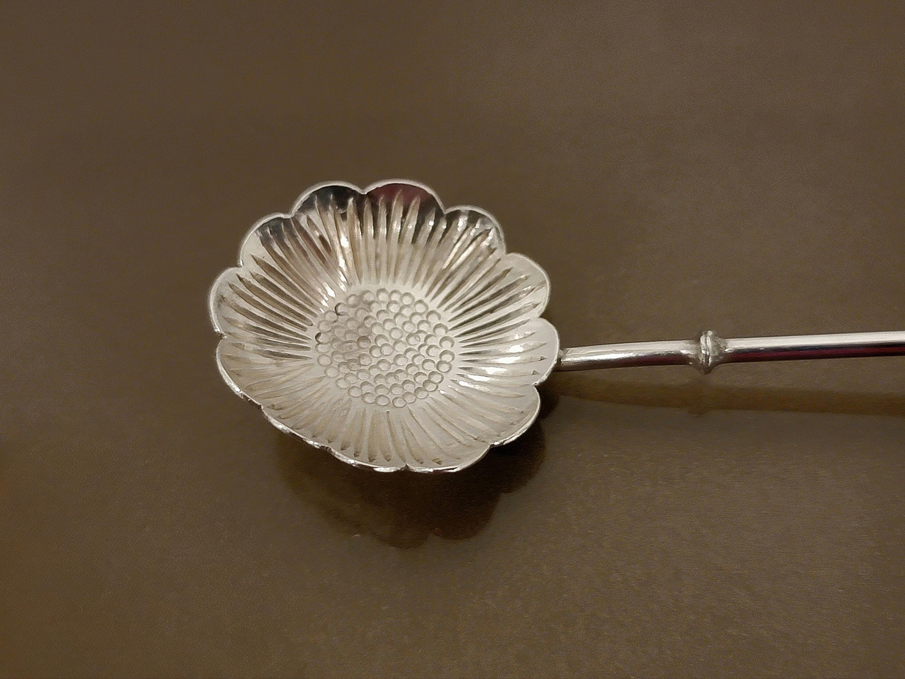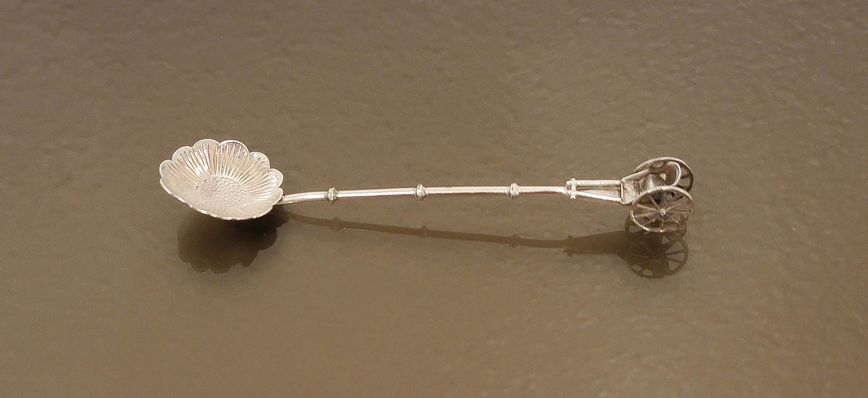 Bring a delightful touch of artistry to your silver collection with this vintage sterling silver rickshaw figural spoon, beautifully crafted with a detailed two-wheeled rickshaw carriage forming the terminal. The bowl is shaped like a blossoming flower with finely cast petals and a textured seed center, creating a perfect blend of novelty and elegance.
