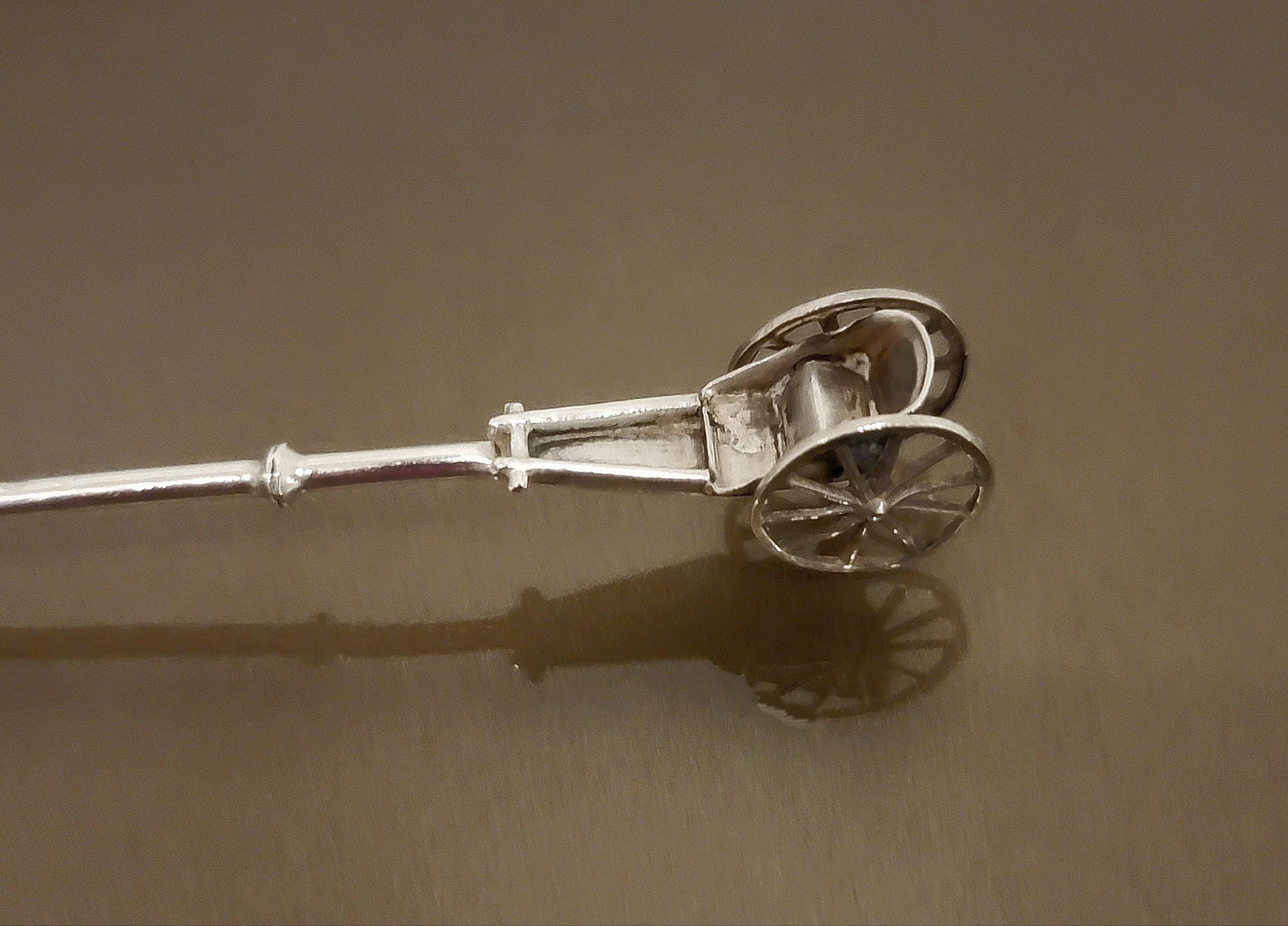 This whimsical miniature is fully marked STERLING and displays charming craftsmanship in its spoke wheels, carriage form, and delicately molded handle.