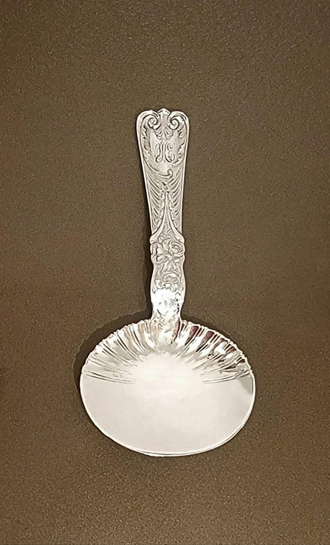 Add a touch of late-Victorian charm to your silver service with this exquisite Gorham Sterling Bon Bon Spoon, pattern 413. This beautifully crafted specialty spoon features an ornate Aesthetic-period handle with scrolls, florals, and feathered details, paired with a dramatic fluted, scalloped bowl—perfect for serving bonbons, nuts, mints, or small sweets.