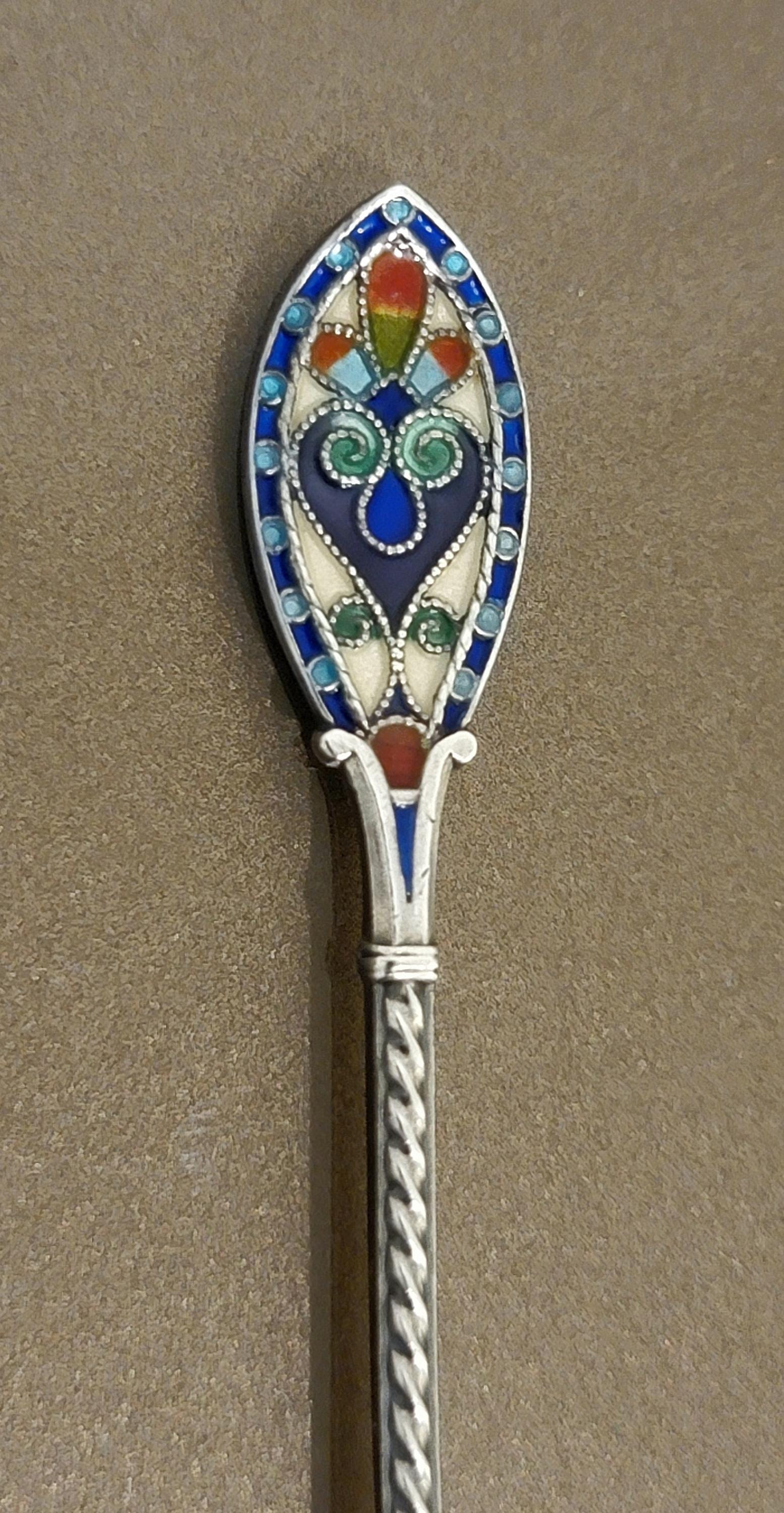 This charming 3-3/4 inch Scandinavian plique-à-jour silver spoon showcases the exceptional craftsmanship the region is known for. The finial is decorated with delicate plique-à-jour enamel, allowing light to pass through the translucent colors much like miniature stained glass. The twisted stem and shaped bowl complete this elegant Art Nouveau–influenced design.