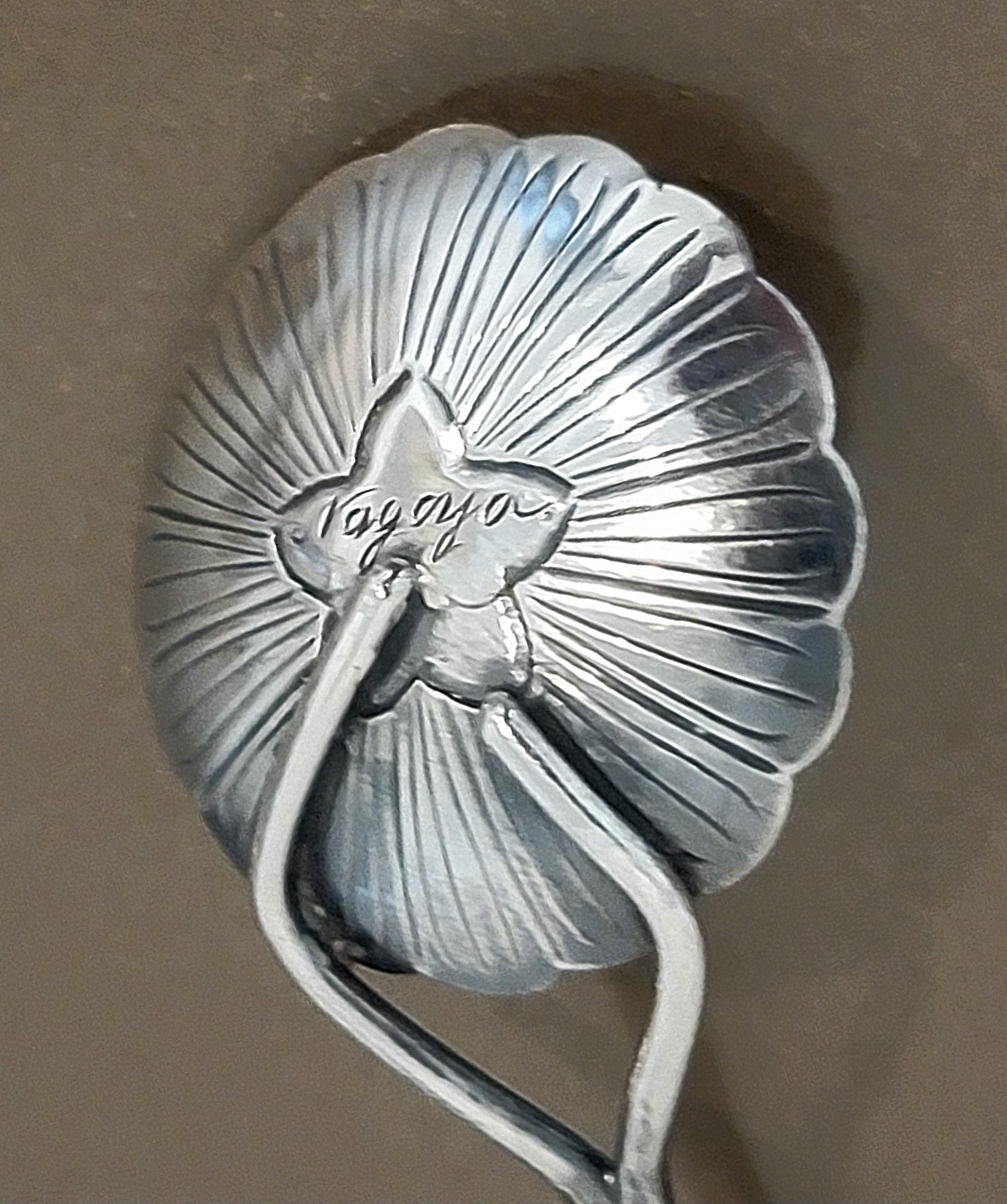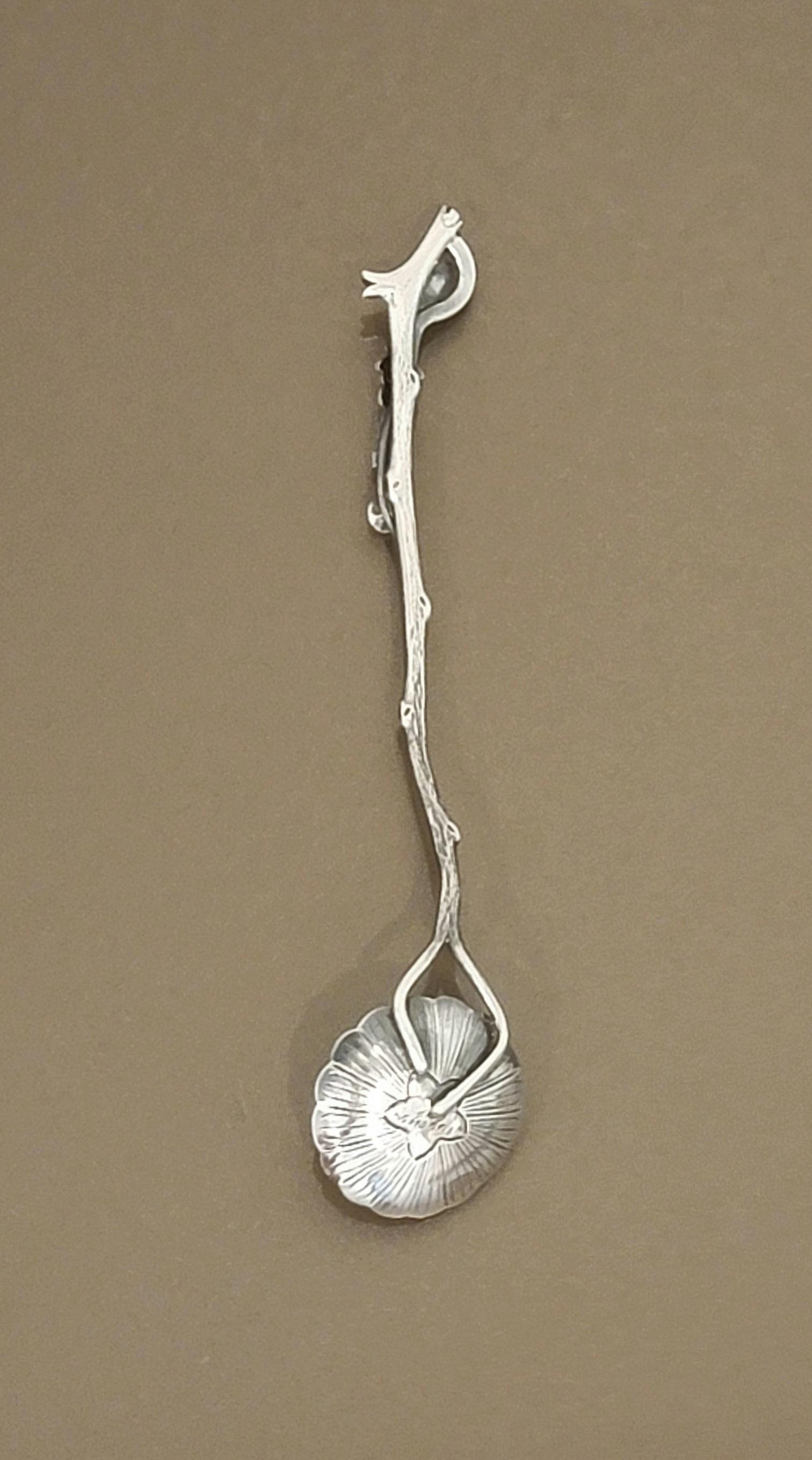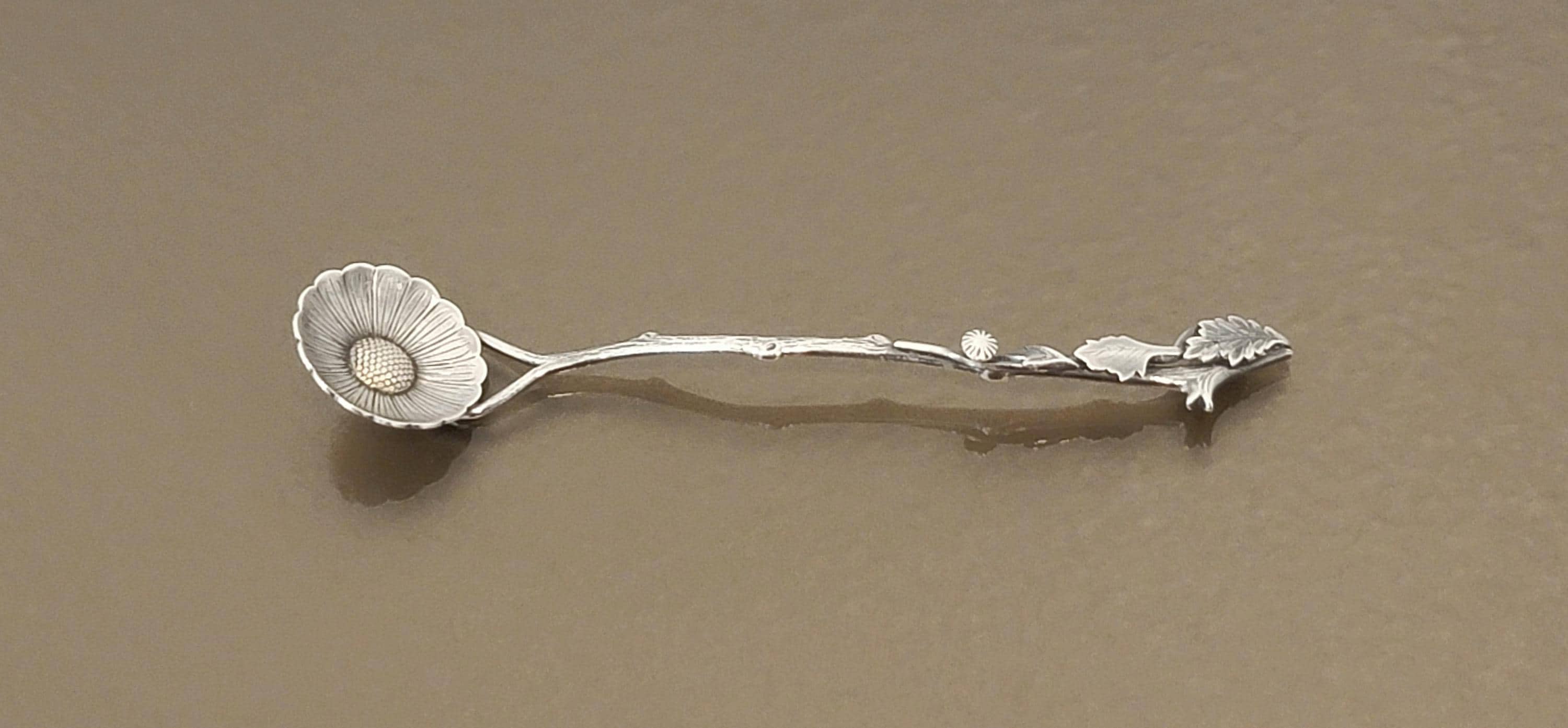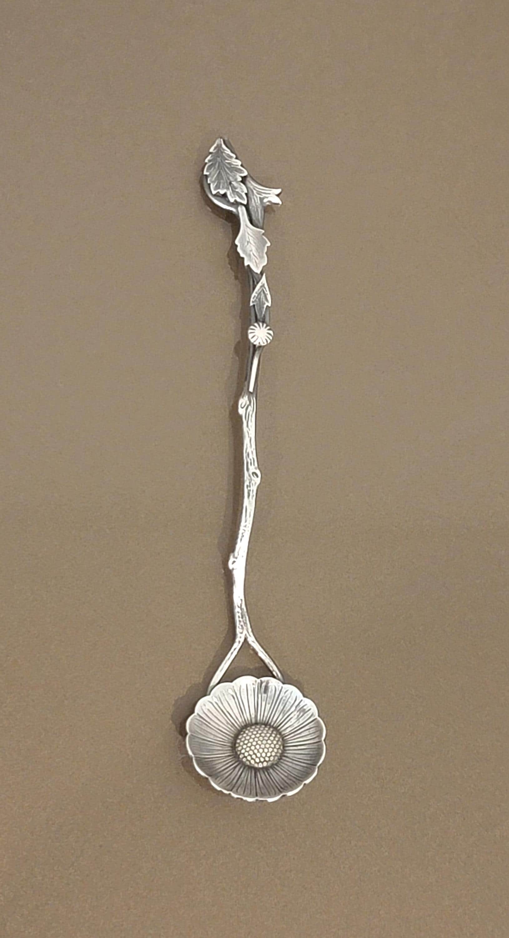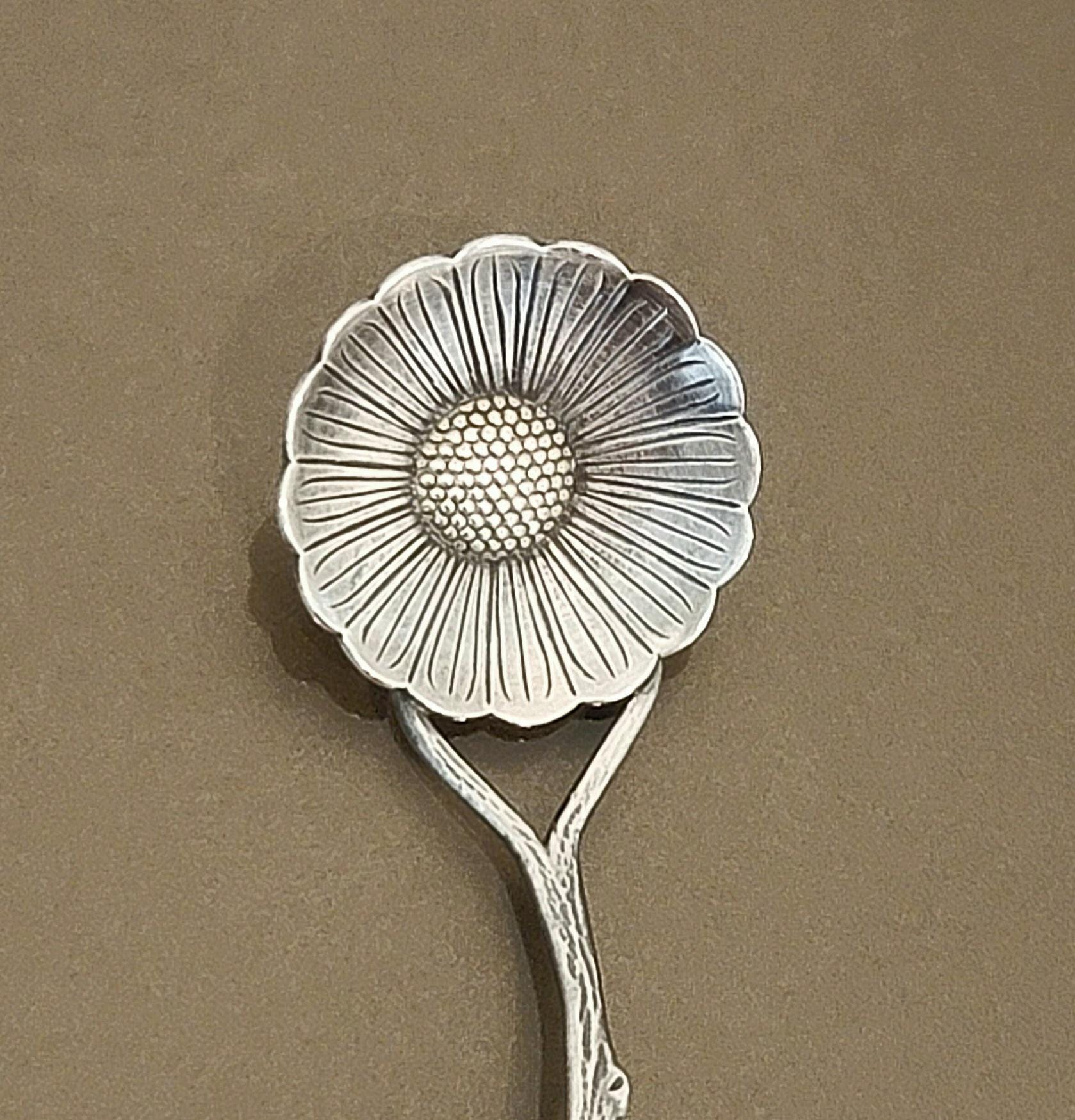 This exquisite 4½-inch handmade sterling silver figural spoon, signed “Nagoya,” is a beautiful example of Japanese artistry and naturalistic design. Sculpted entirely in the form of a blooming daisy, the bowl features finely chased petals and a textured center, while the handle is crafted as a winding branch with buds and leaves.