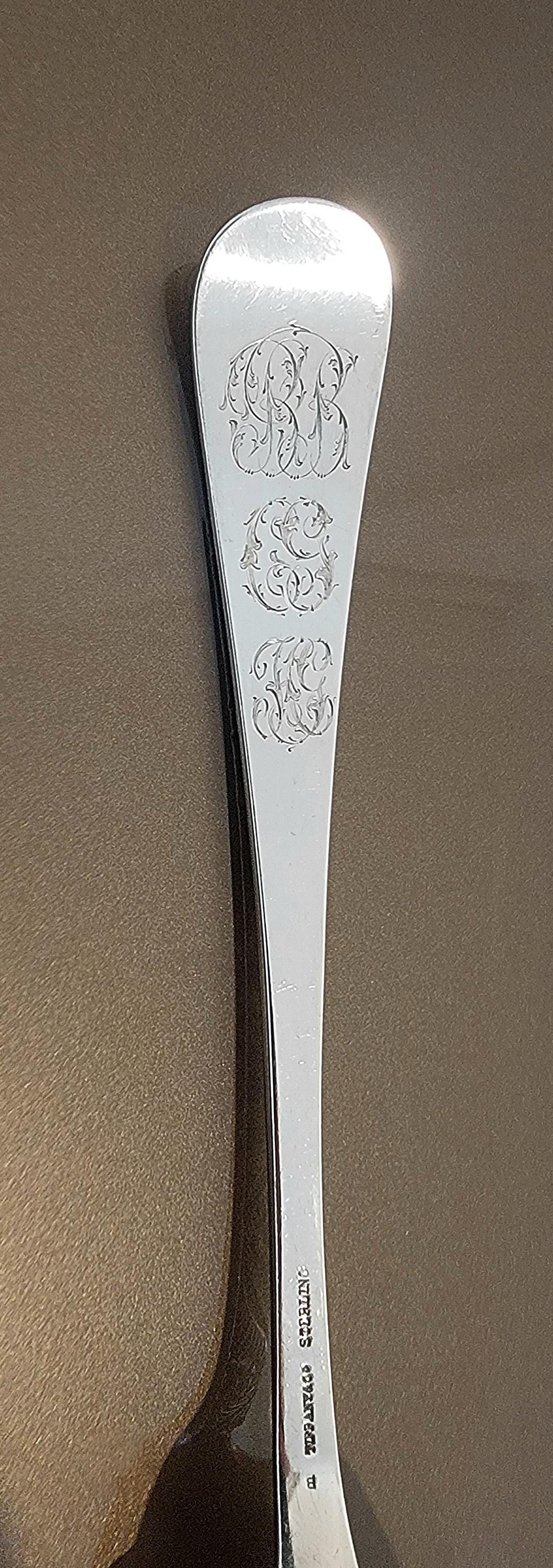 The spoon bears the Tiffany & Co. STERLING hallmark, confirming genuine sterling silver (.925). The handle is adorned with ornate floral engraving on one side and features three hand-engraved triple monograms on the reverse, executed in a refined Victorian/Edwardian script—an exquisite example of period personalization.