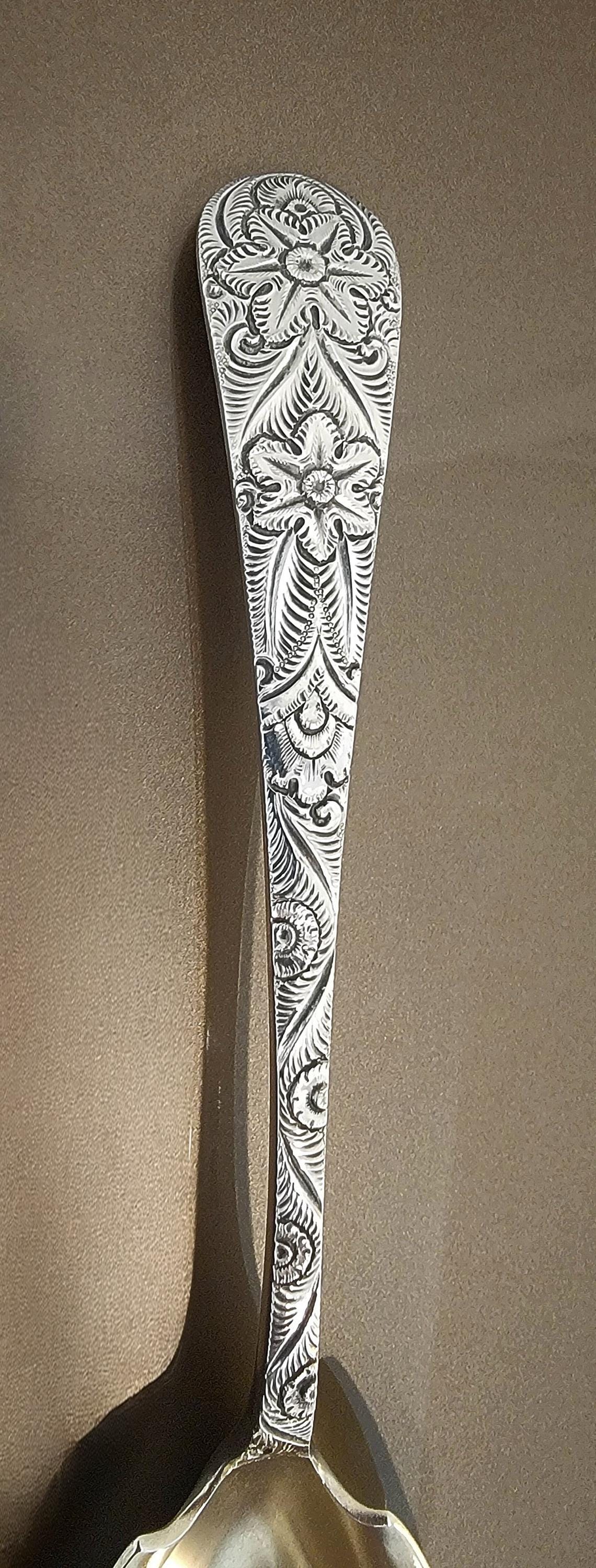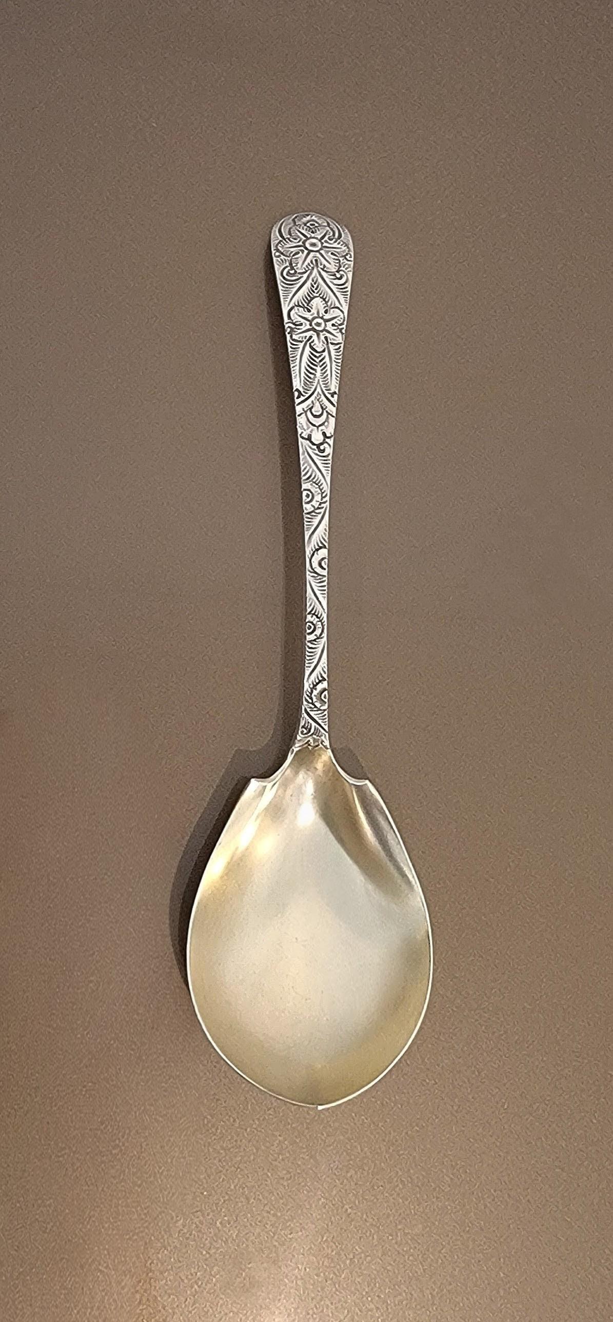 A beautiful and authentic antique Tiffany & Co. sterling silver preserve spoon, crafted in classic American form and enhanced with elegant hand engraving. This timeless piece was designed specifically for serving jams, preserves, marmalade, or condiments, with a generously sized bowl and graceful proportions.
