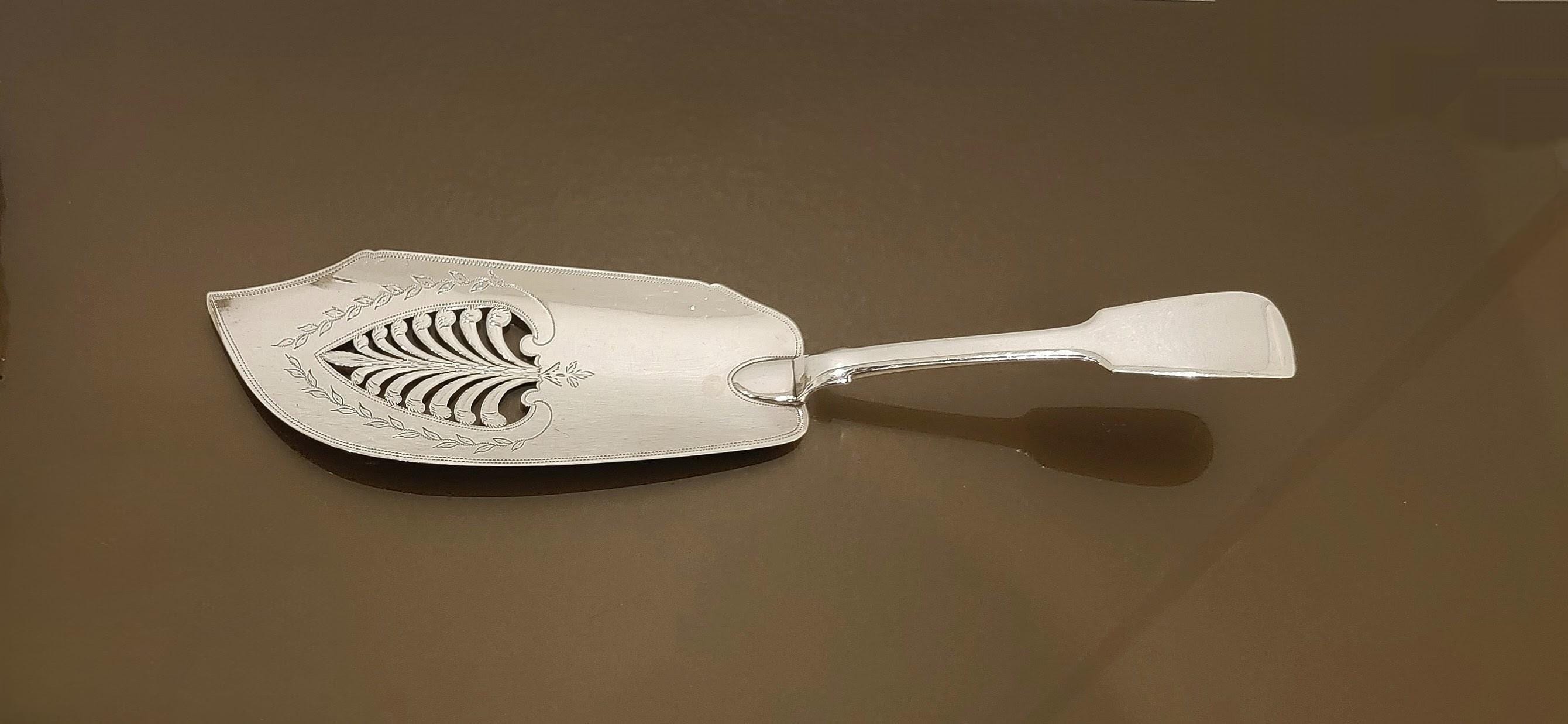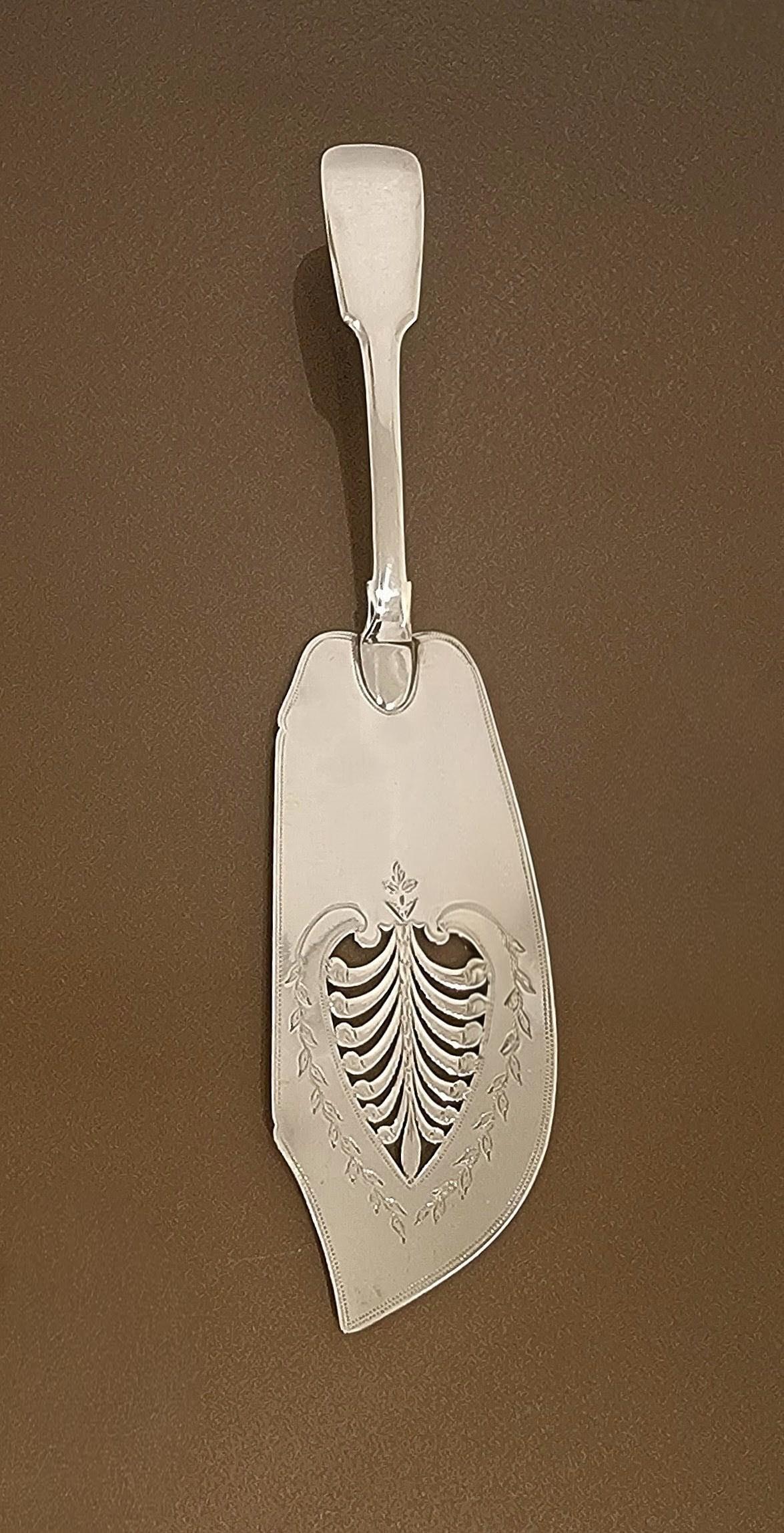 A handsome antique English sterling silver fish serving knife, distinguished by its pierced and engraved blade designed to drain sauces cleanly while serving delicate fish courses. The elegant foliate piercing gives this piece both beauty and function, making it equally suitable for use or display.