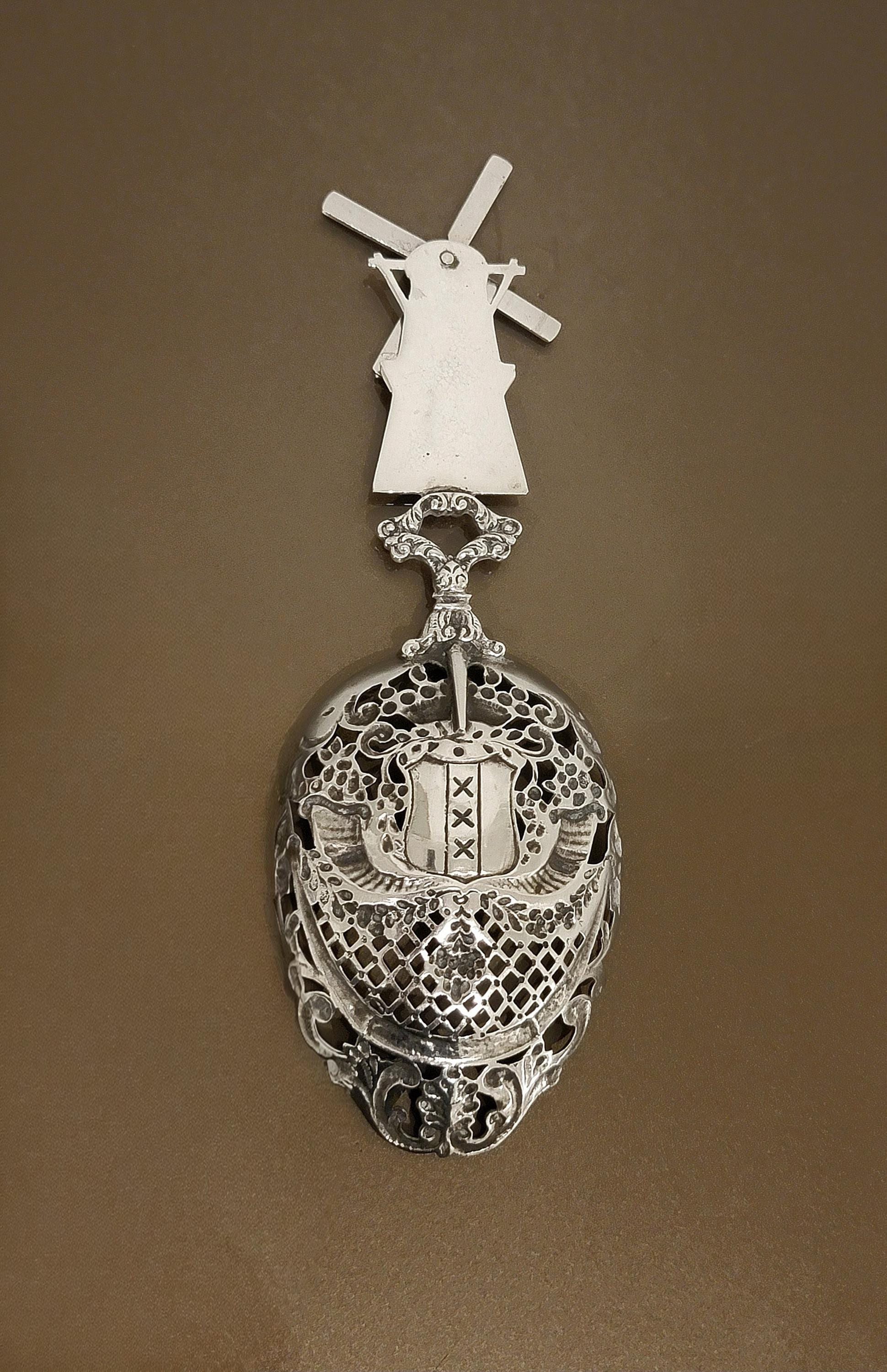 A finely crafted antique Dutch silver souvenir spoon, featuring a traditional windmill finial above an ornate pierced bowl decorated with the Amsterdam coat of arms (three St. Andrew’s crosses beneath a crown). A classic example of Dutch national symbolism and silversmithing.