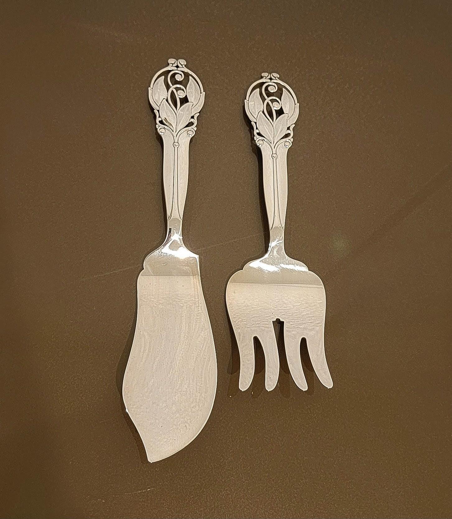 This refined set features flowing organic scrollwork and stylized botanical terminals—hallmarks of Scandinavian Jugendstil design. The sculptural fish knife blade and matching fork were specifically designed for serving fish, making this both a functional serving set and a highly collectible example of early Danish silver craftsmanship.
