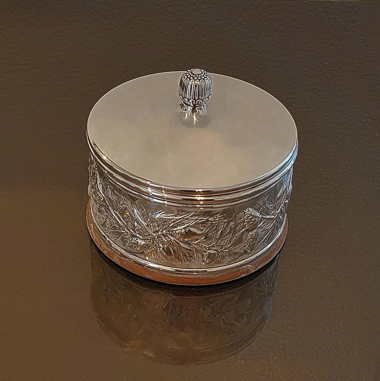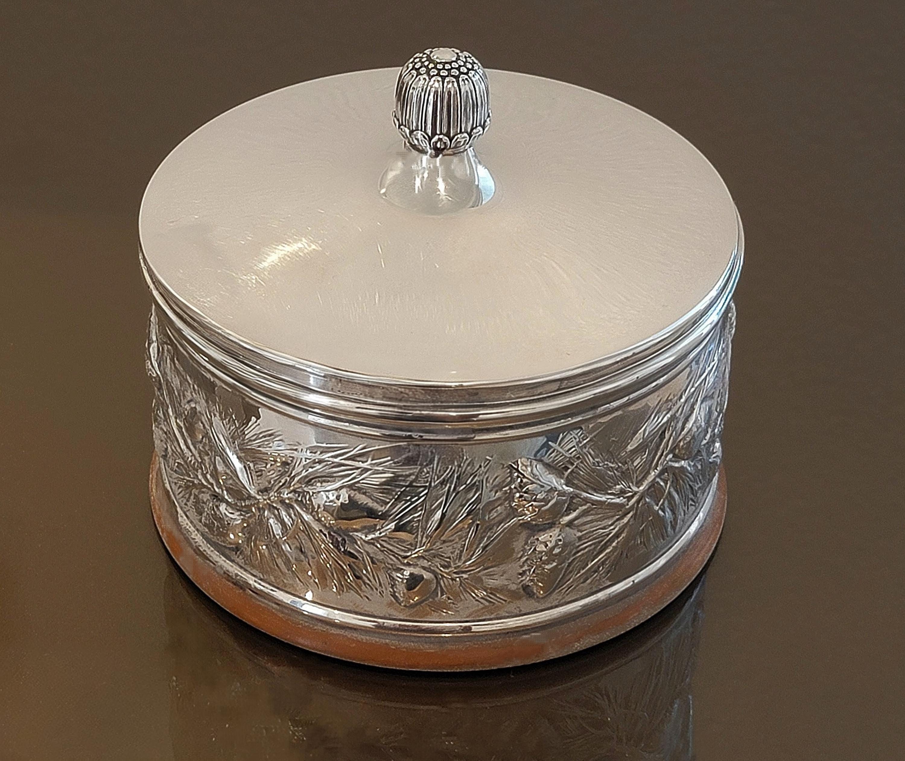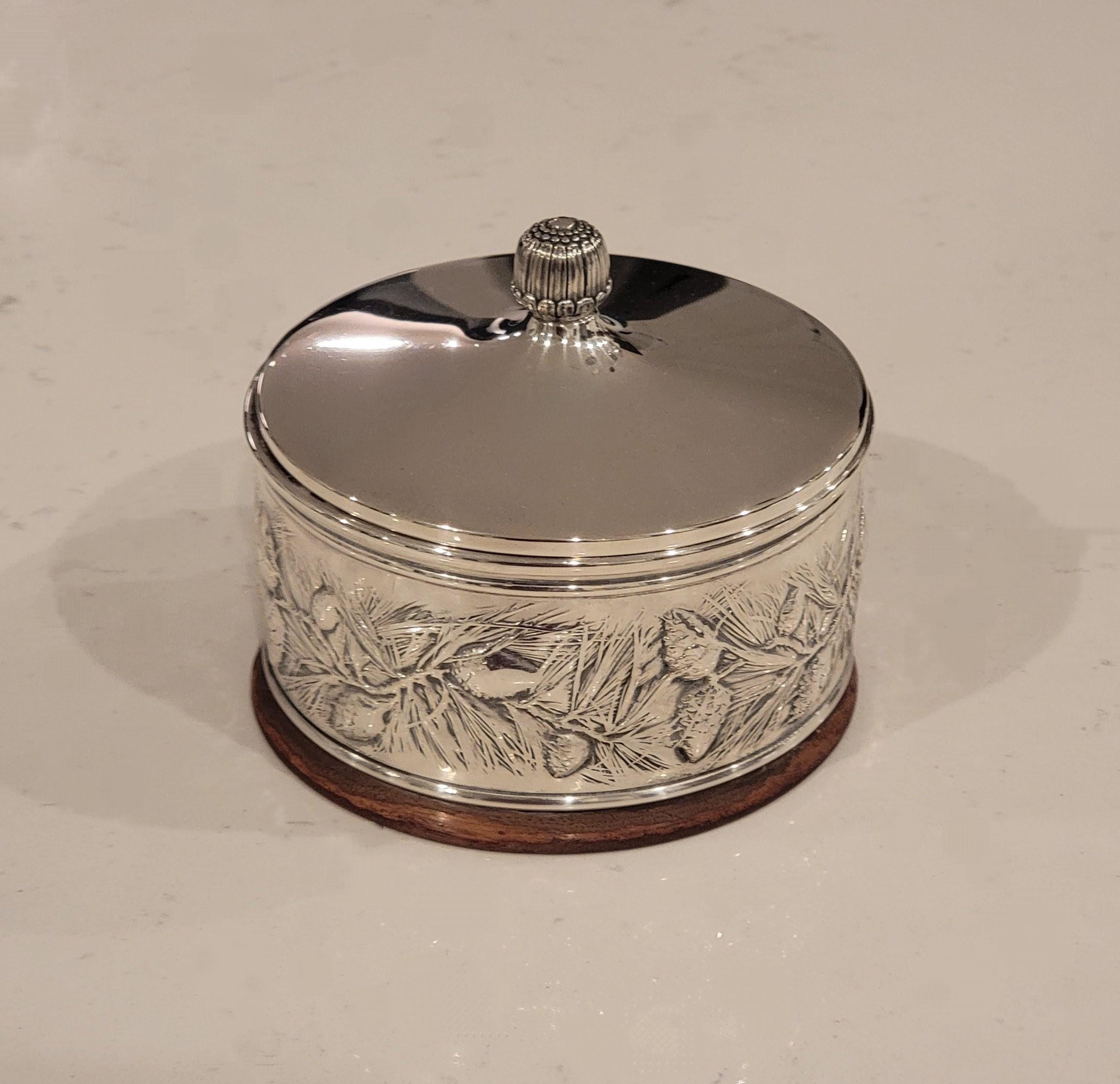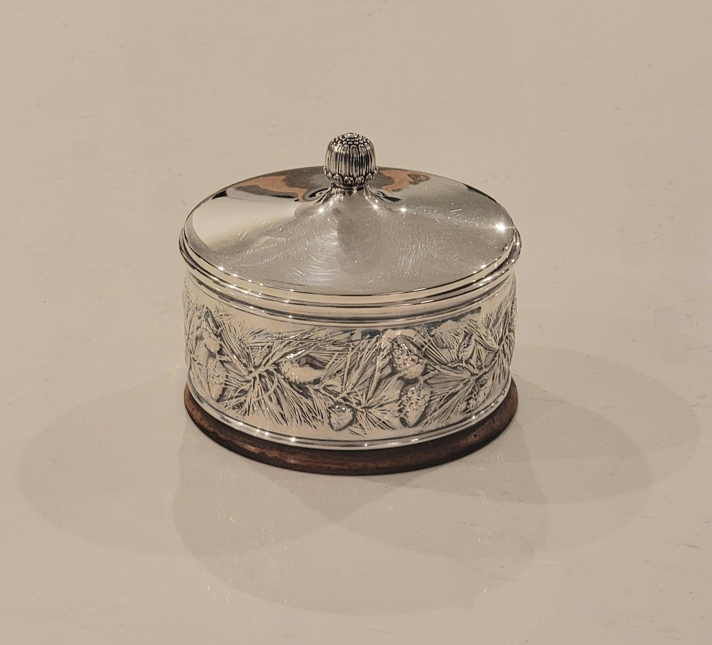 This elegant vintage Gorham sterling silver covered keepsake box features a beautifully executed hand-chased nature motif encircling the body, showcasing Gorham’s renowned craftsmanship and classic American design.