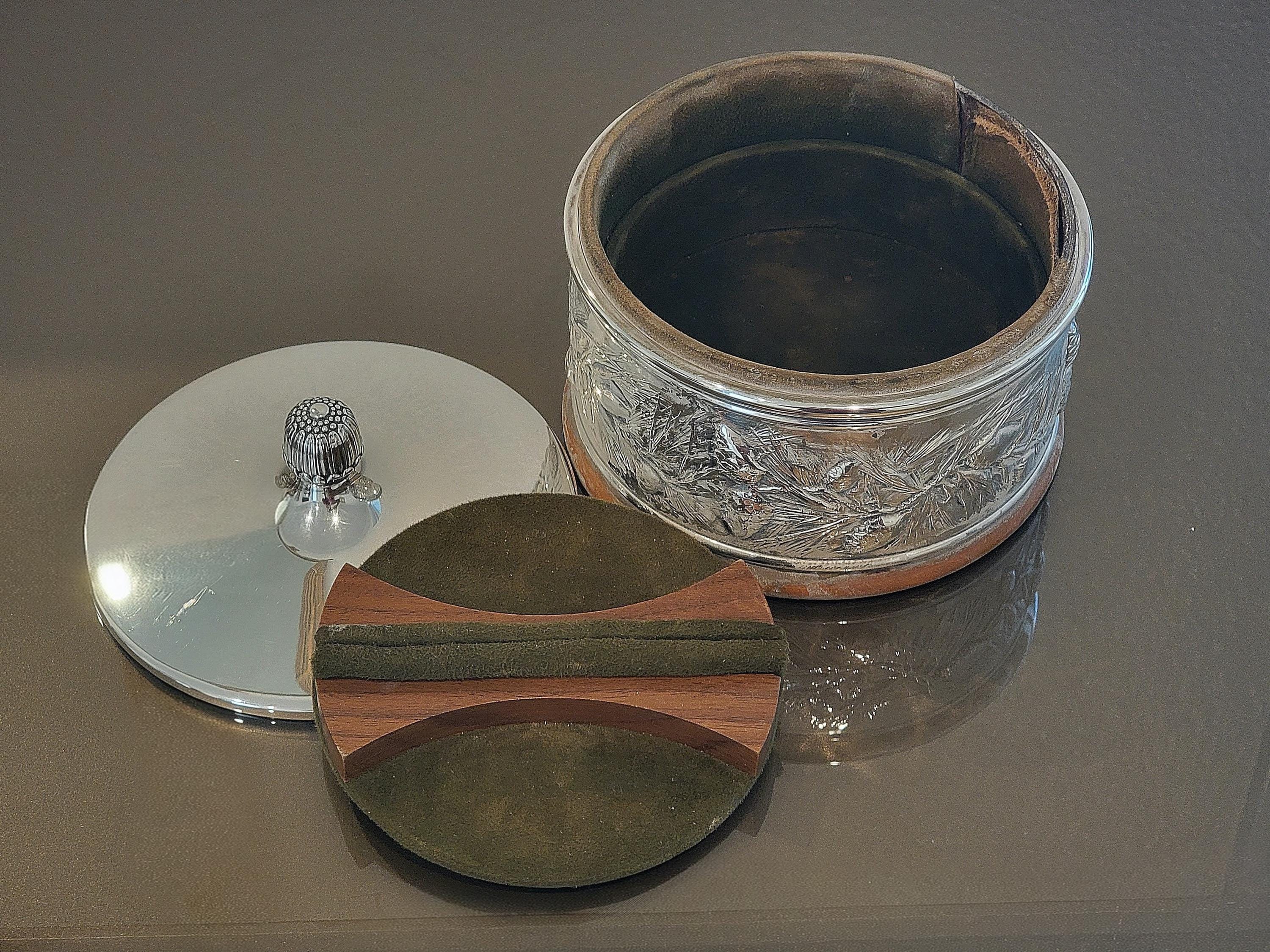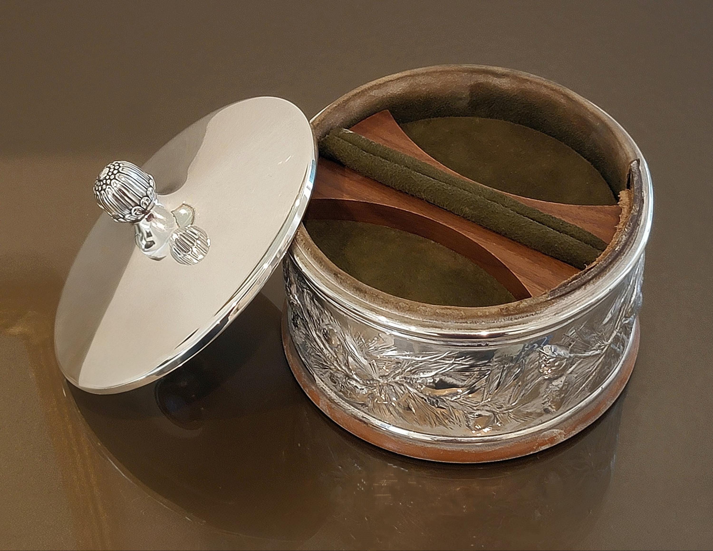 The box is fitted with a removable sterling silver lid topped with a finial, opening to a rich brown velvet–lined interior with a removable wooden insert. The interior presents warmly and makes this piece ideal for holding personal mementos, jewelry, or treasured keepsakes.