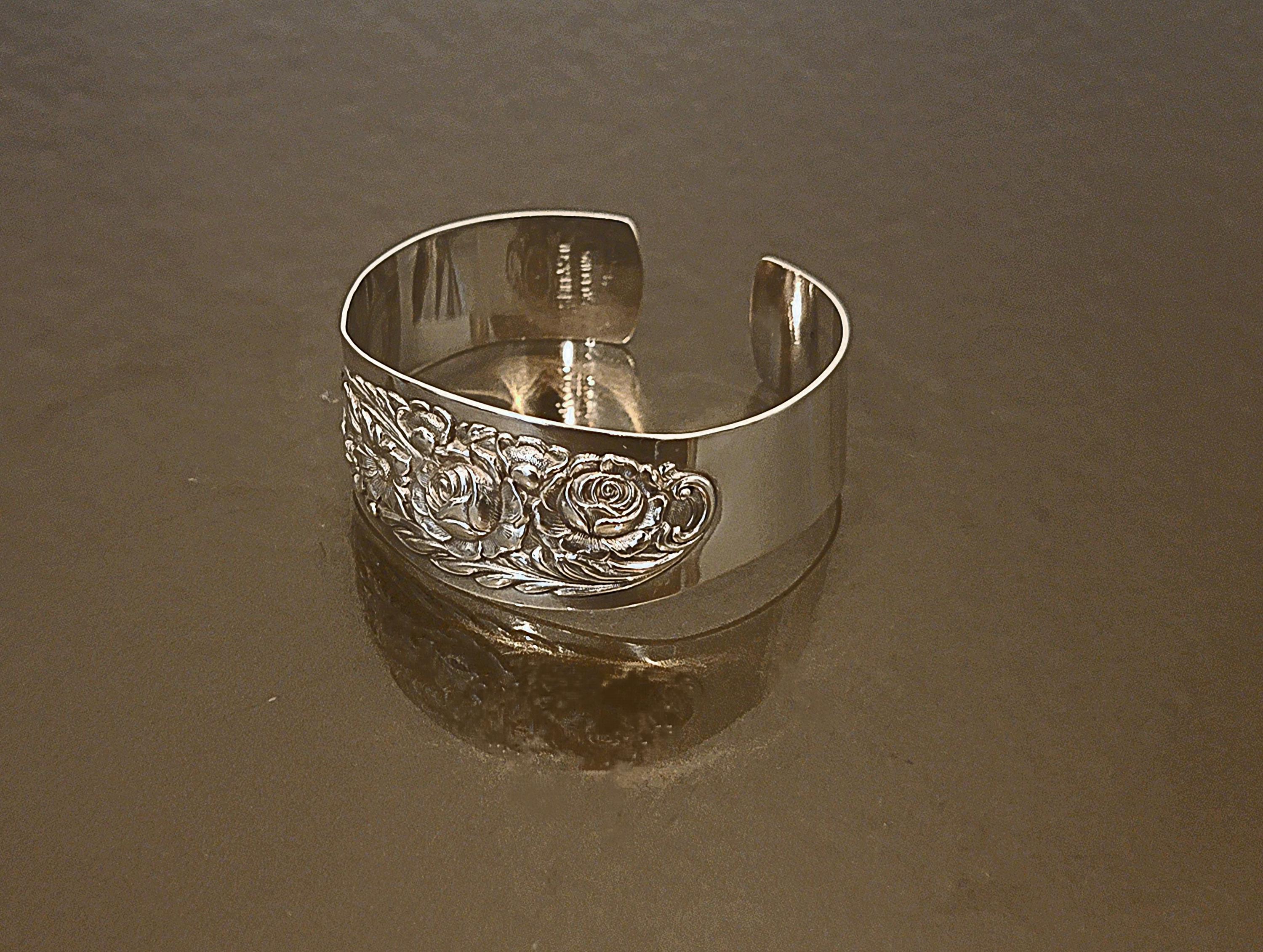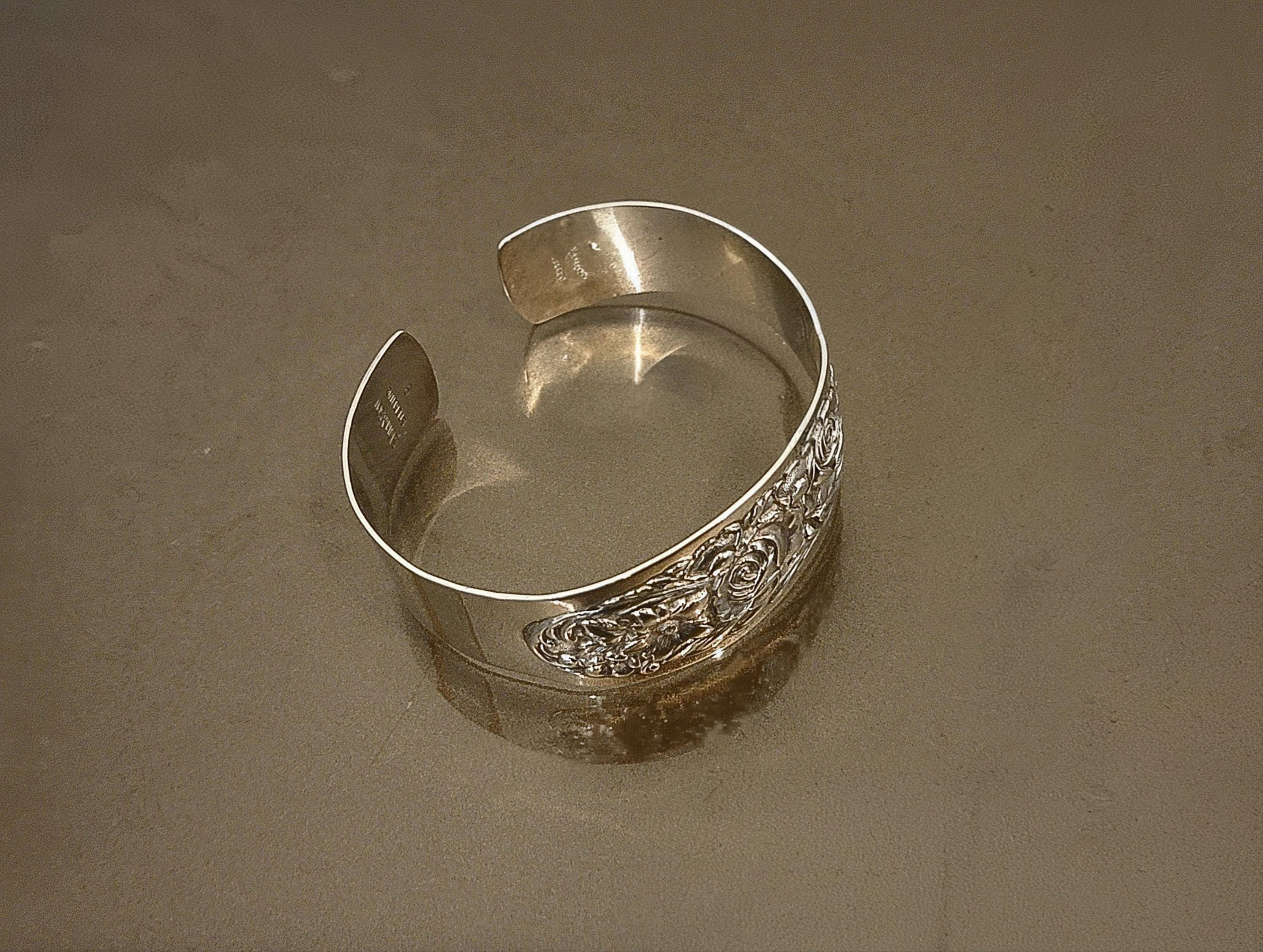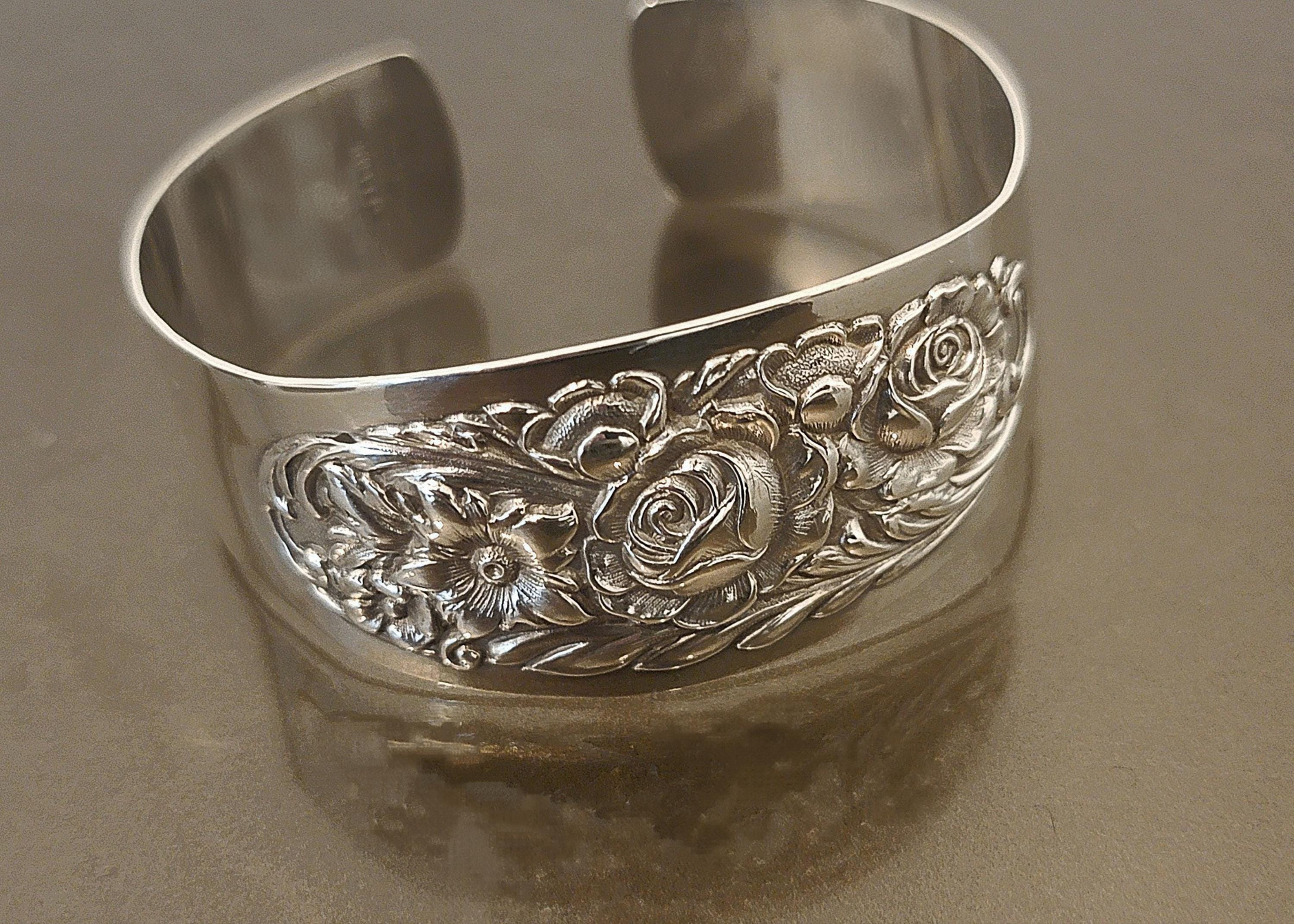 Converted from authentic Kirk sterling flatware, this wide cuff retains crisp pattern definition and a substantial silver presence—both highly sought after by collectors and lovers of antique silver jewelry.