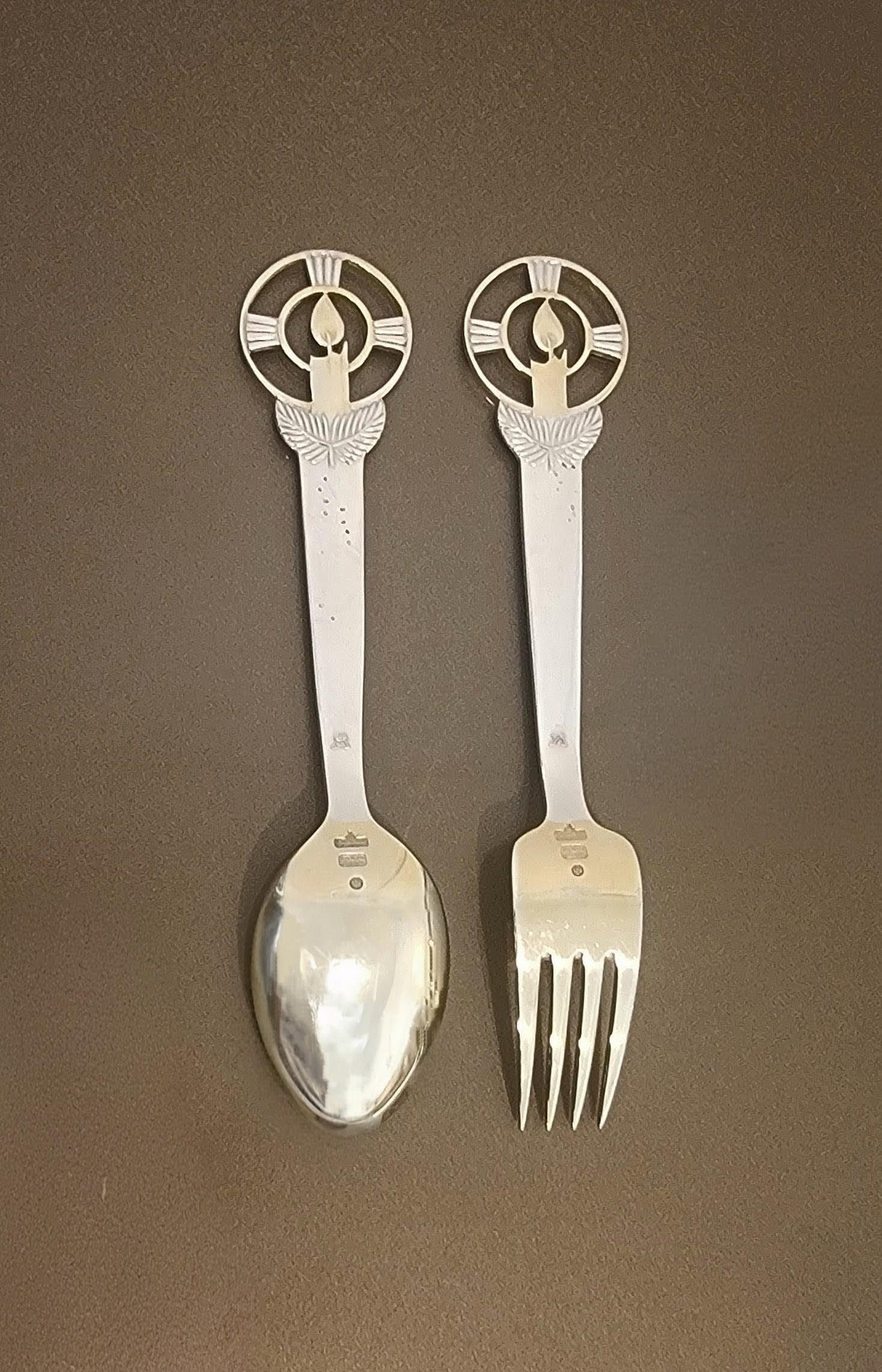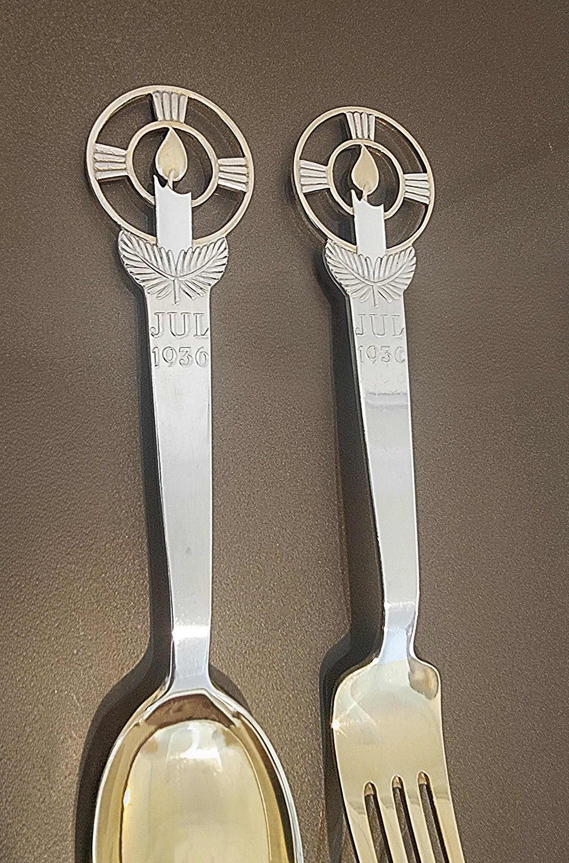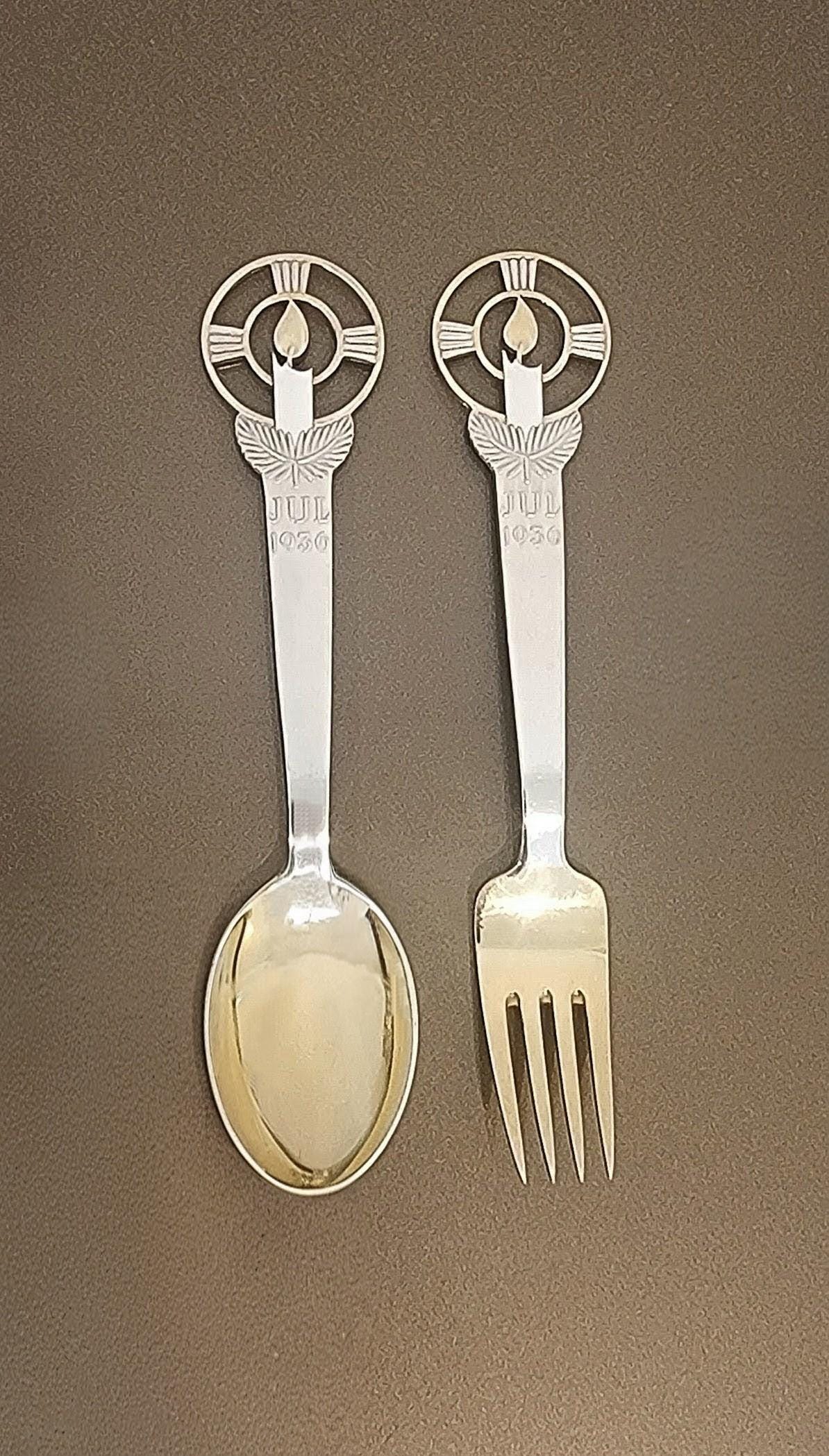 A beautiful and highly collectible A. Michelsen Danish sterling silver Christmas (Jul) baby spoon and fork set, dated 1936.