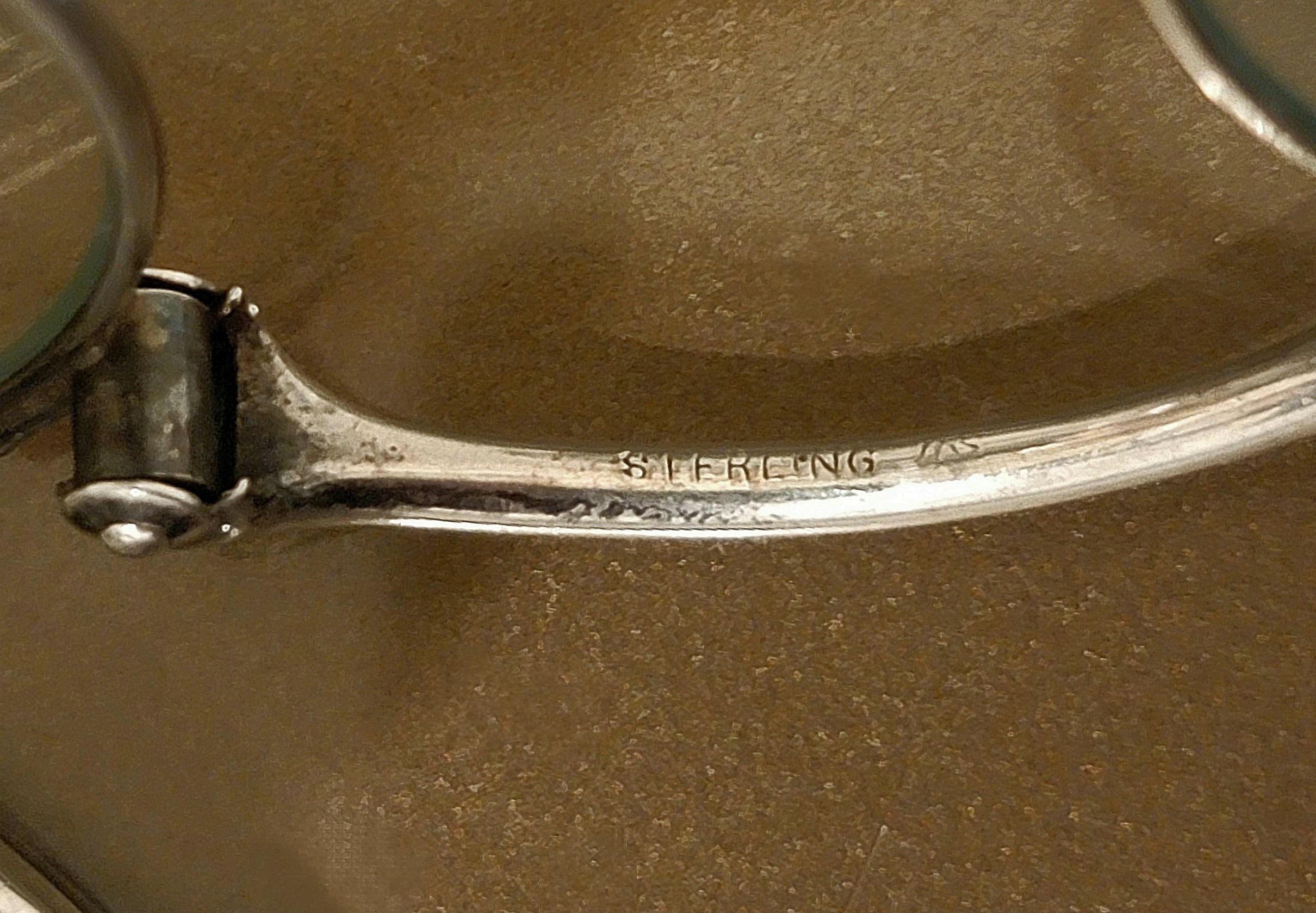 A beautifully crafted sterling silver folding lorgnette, measuring approximately 4 inches across when open, featuring finely pierced openwork handles and clear glass lenses. Marked STERLING, this piece reflects the refined craftsmanship and understated elegance of the late Victorian / Edwardian era.