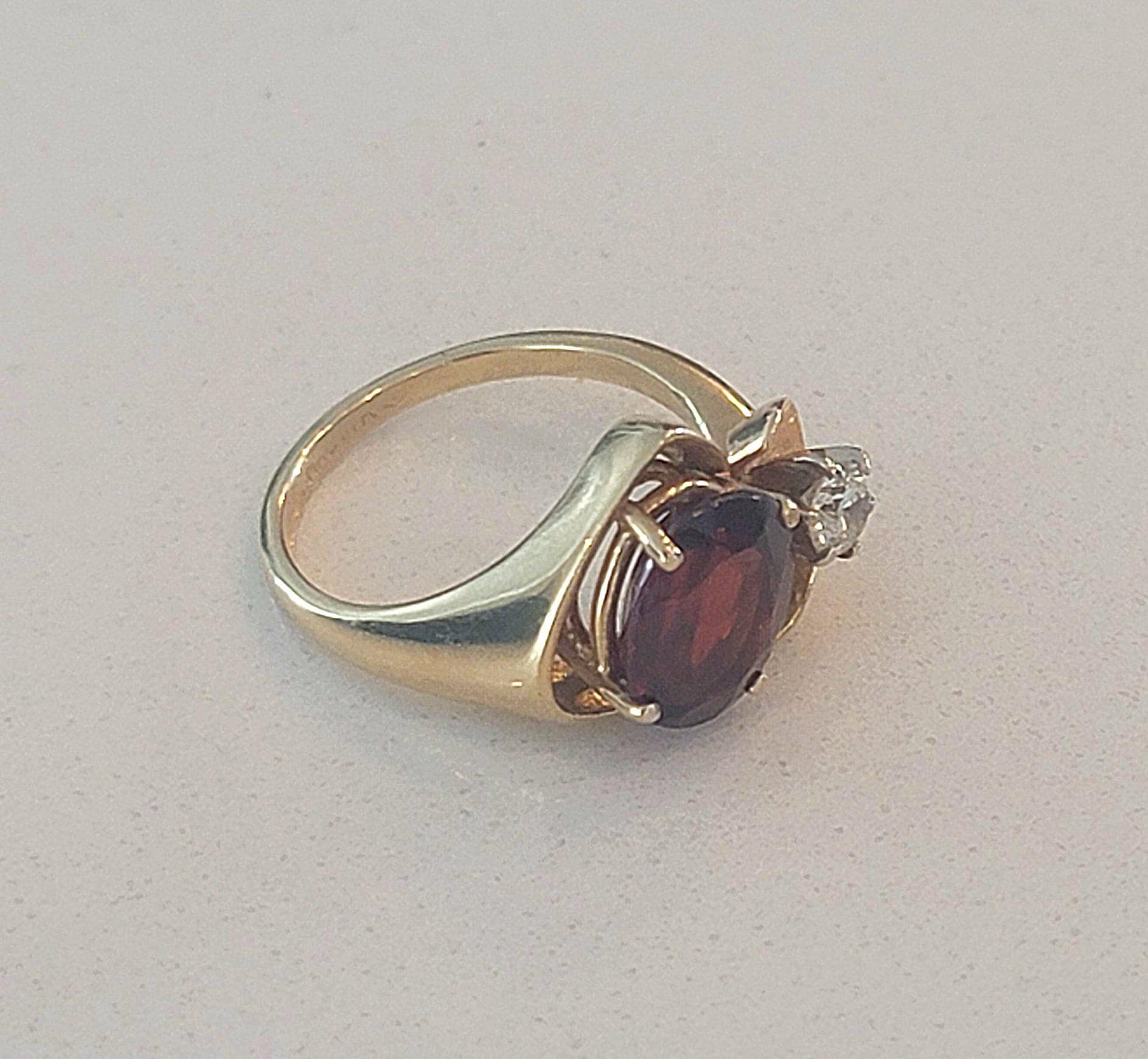 The garnet displays a deep wine-red hue with subtle flashes of ember and cranberry tones in the light, while the diamond adds a bright, refined contrast. The setting has a smooth, balanced profile and a comfortable band, making it ideal for everyday wear or as a meaningful vintage gift.