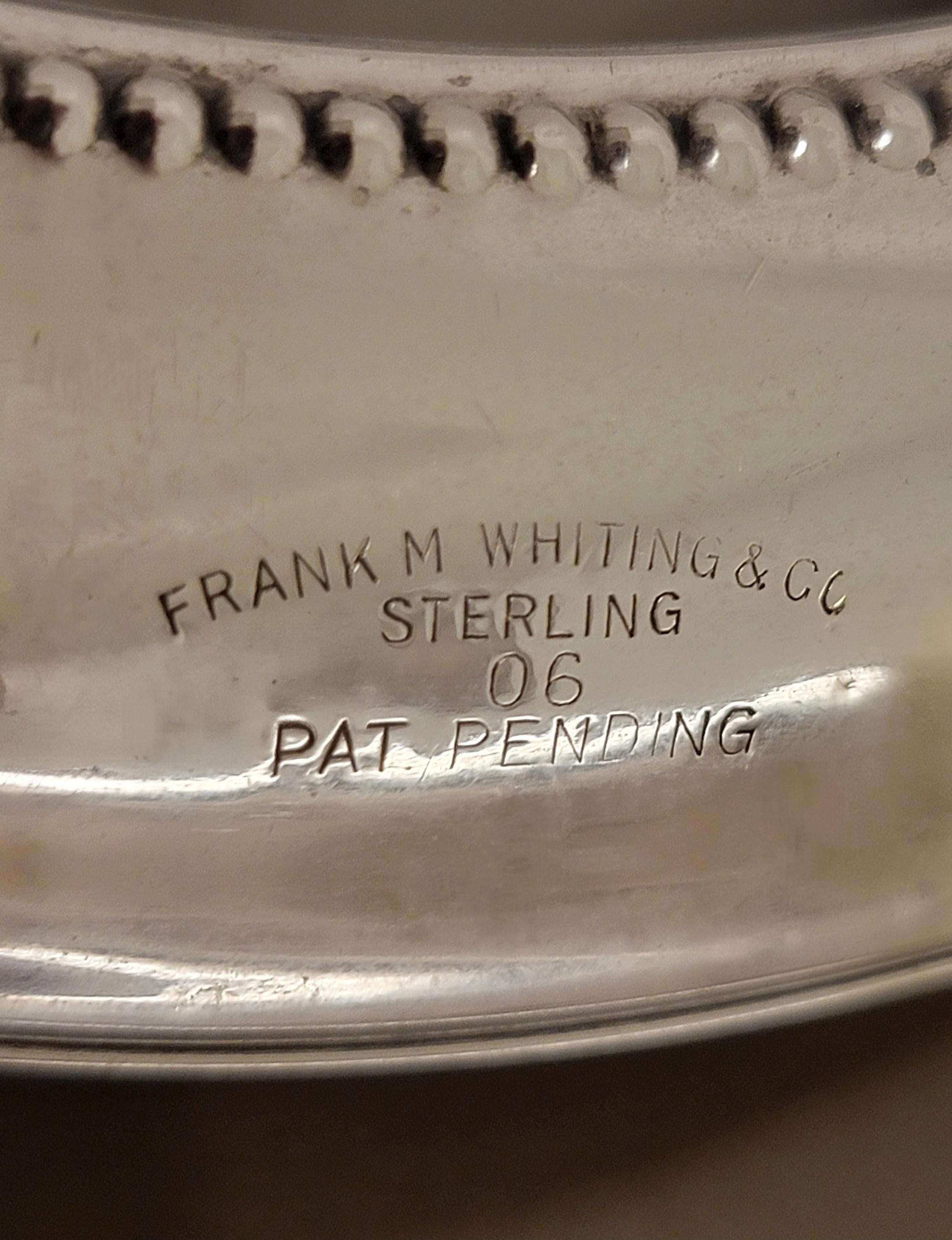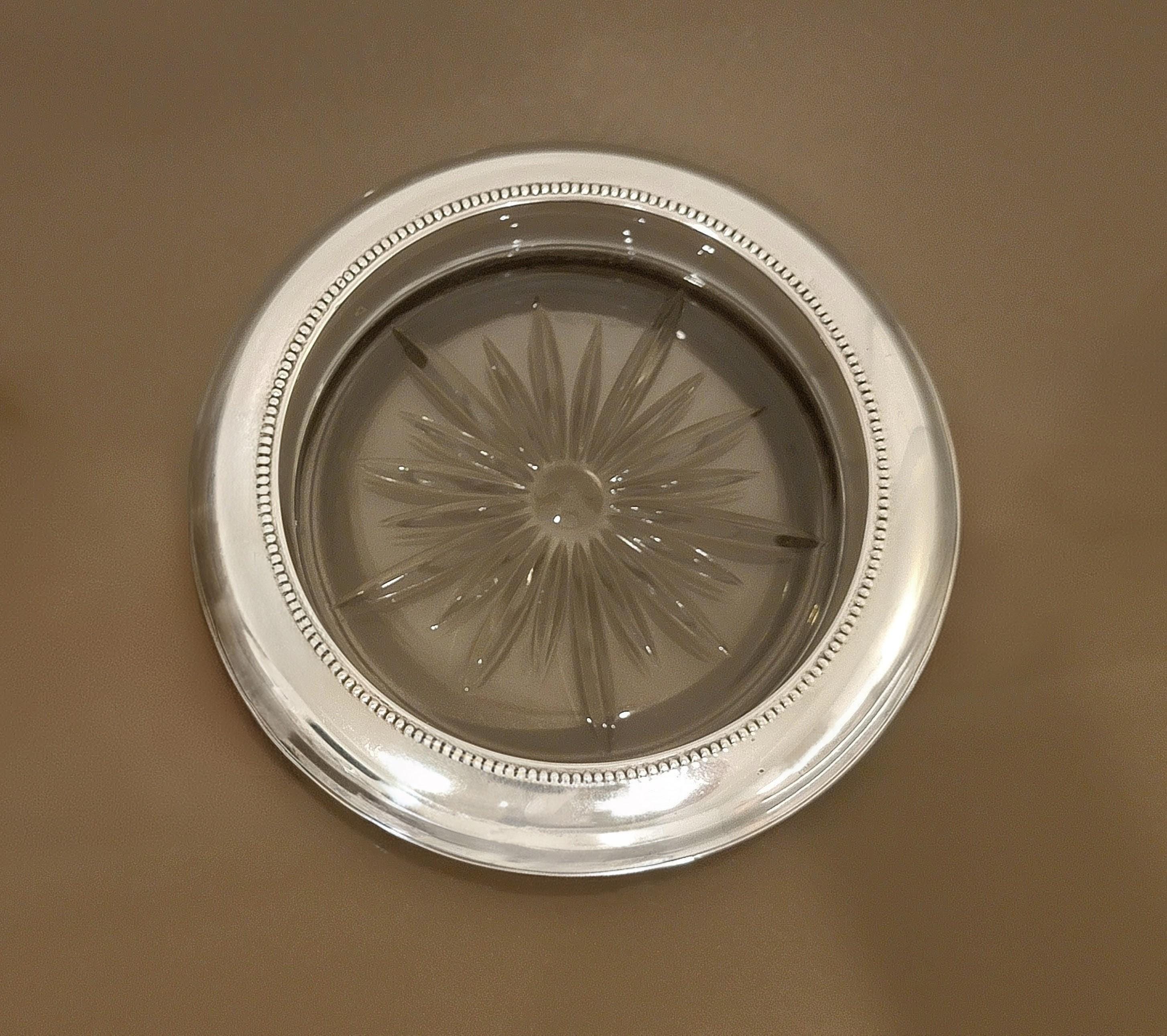 A classic vintage Frank M. Whiting & Co. sterling silver overlay and pressed glass coaster, featuring a refined beaded sterling rim surrounding a molded starburst glass insert.