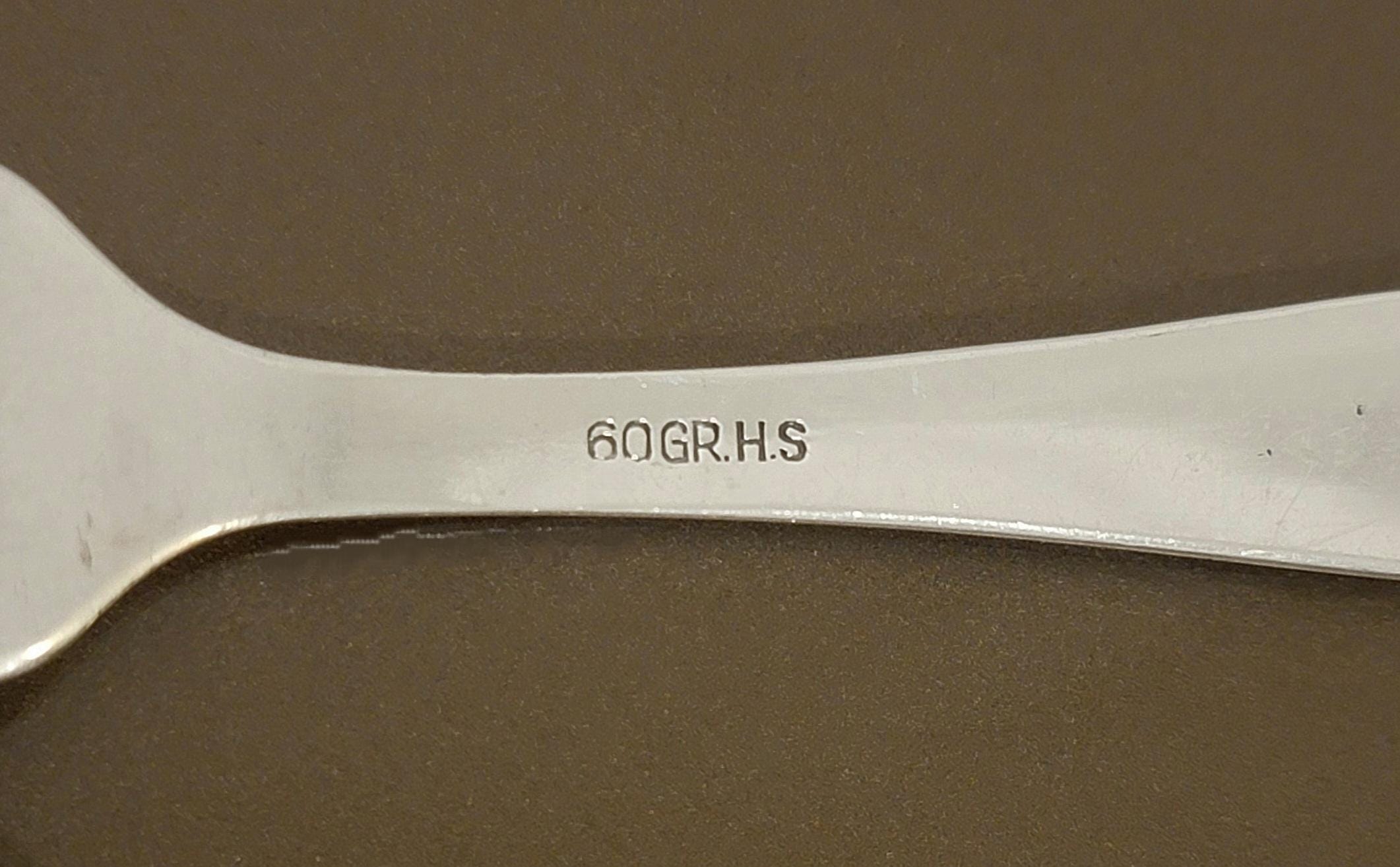 Both pieces are marked “60 GR H.S.” — a common Continental/European plating-grade mark associated with heavy-duty “hotel silver” silverplate, indicating a higher plating standard than lighter grades.
