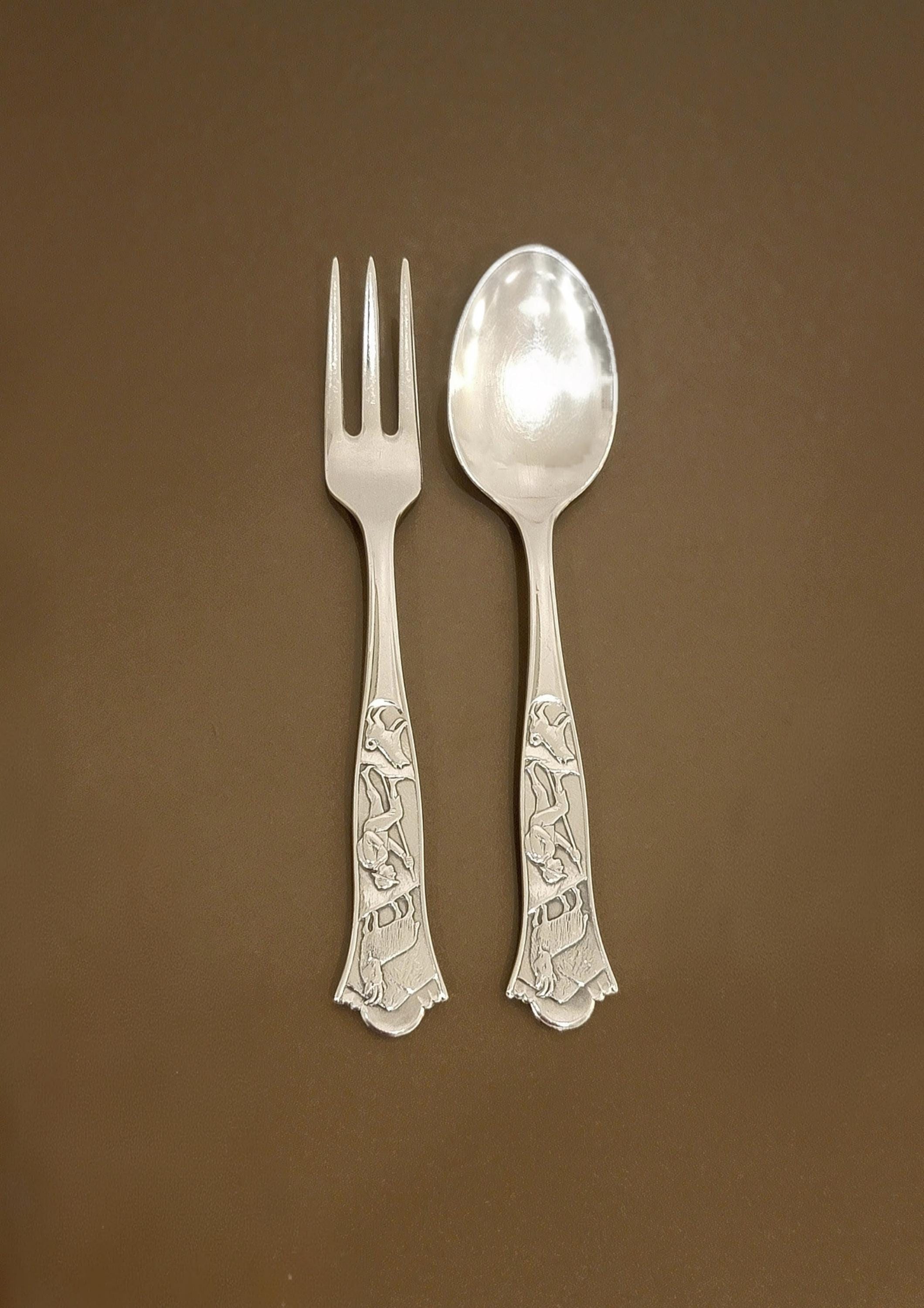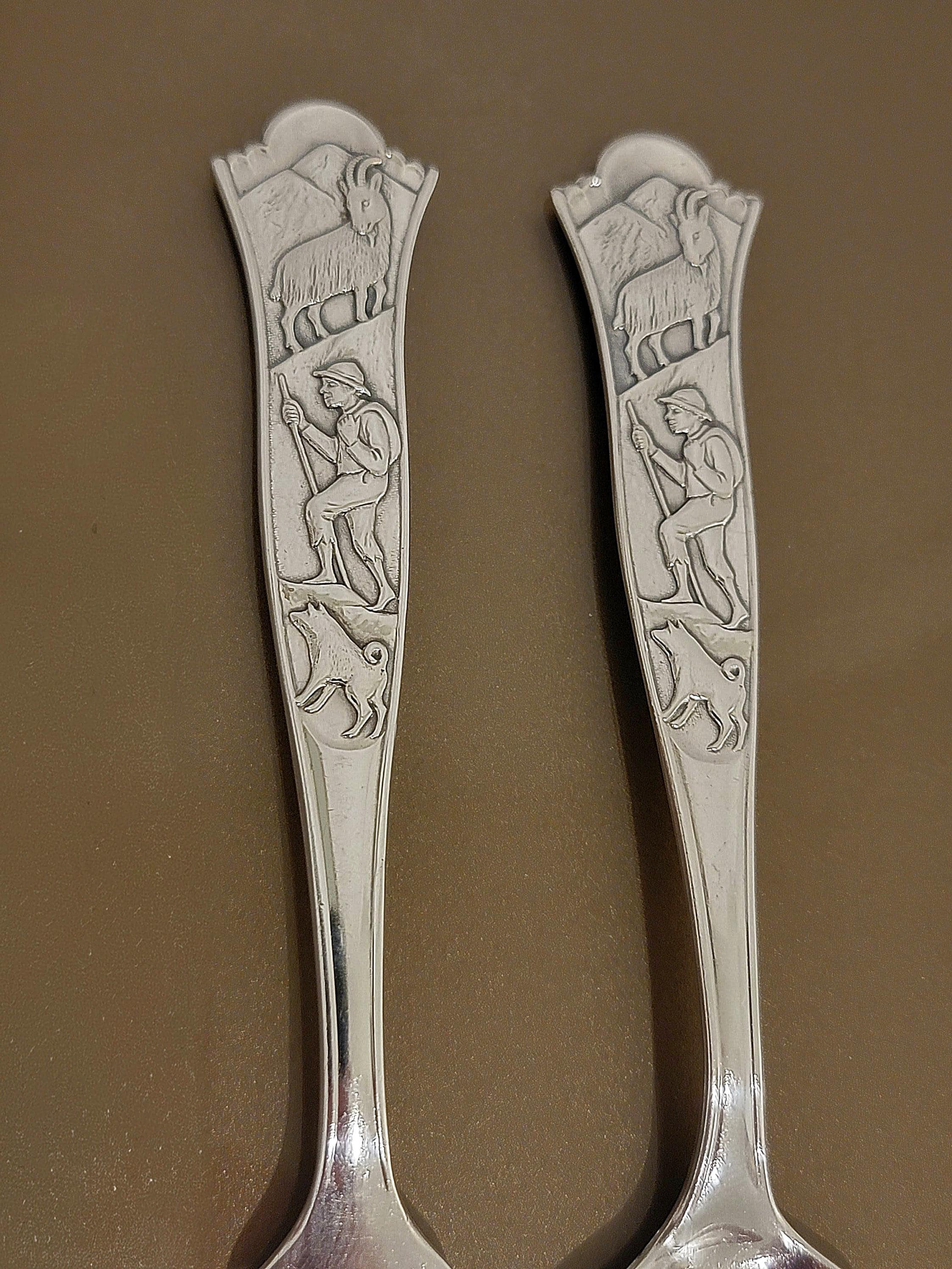 A charming vintage European hotel-quality silverplate child’s spoon and fork set with a crisp Alpine pastoral design. Each piece measures 5-7/8” long and features a raised scenic handle: shepherd with staff, mountain goat, and dog, set against an Alpine landscape.