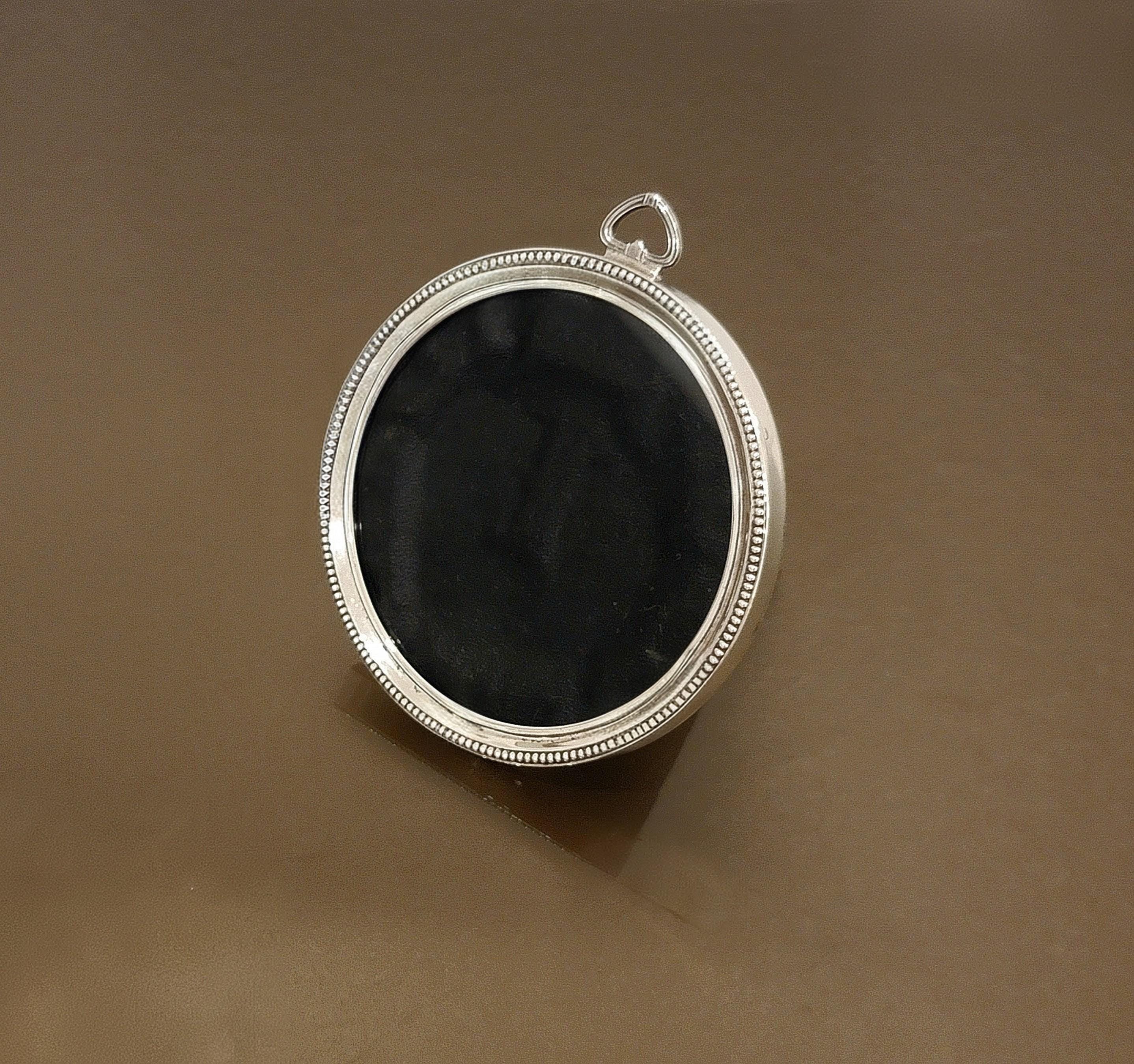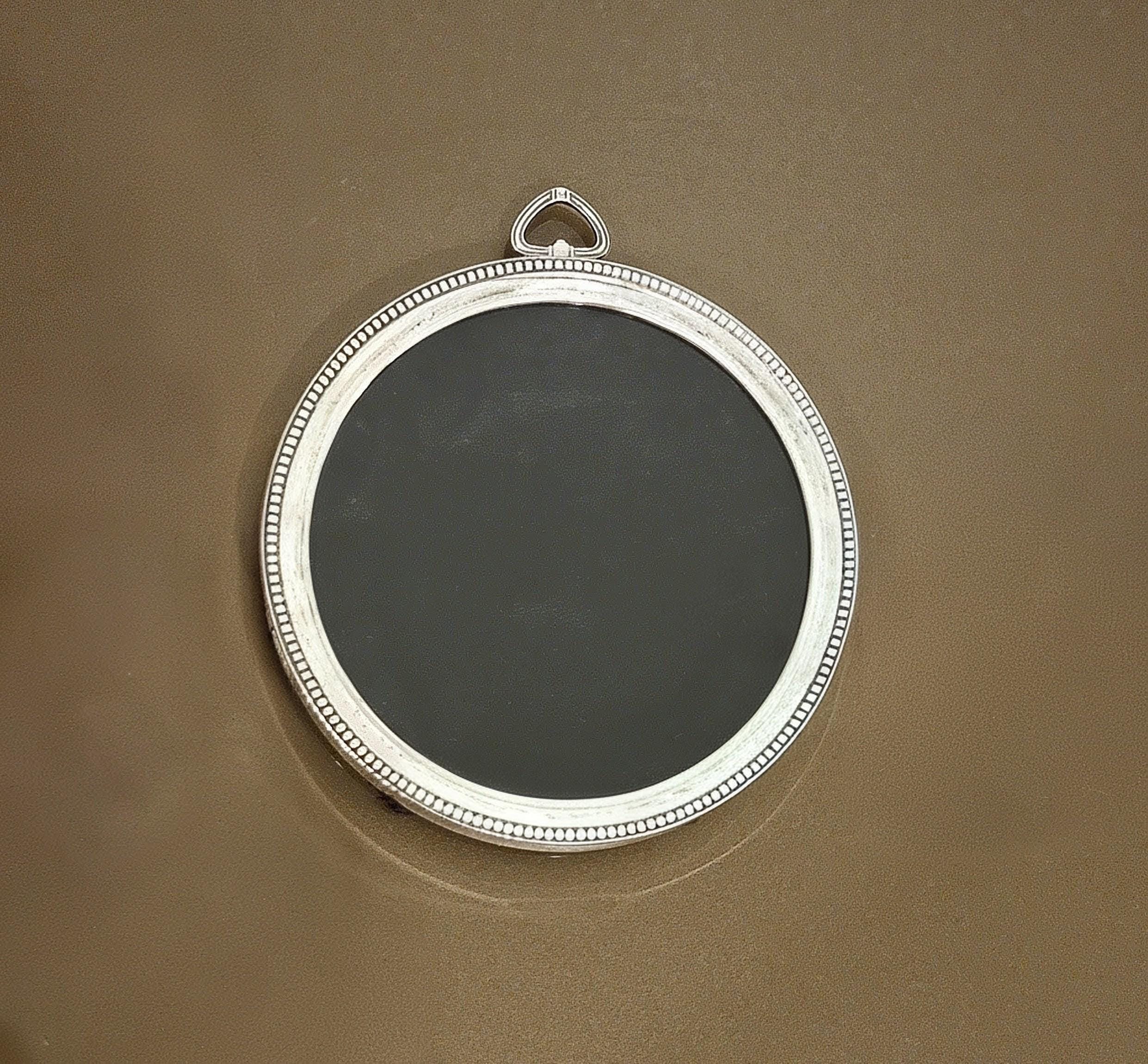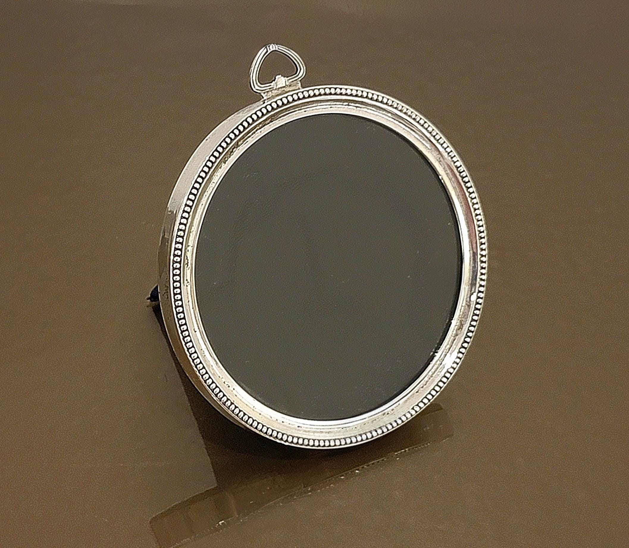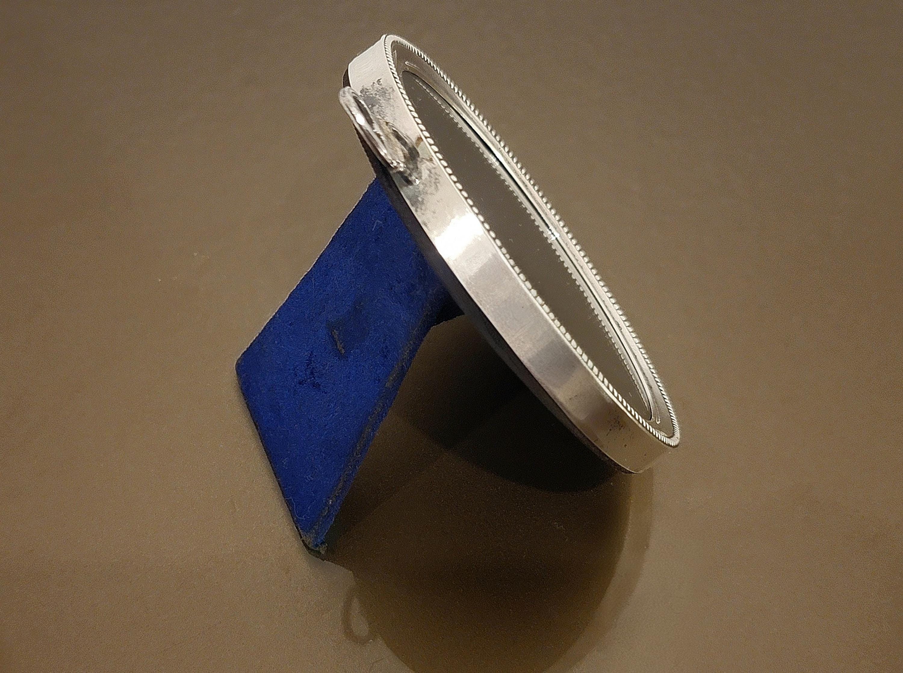 A timeless antique sterling silver round picture frame by Webster, crafted with elegant restraint and classic American design. This refined frame features a crisp beaded (reeded) border and a rich original blue easel backing, giving it both visual depth and period authenticity.