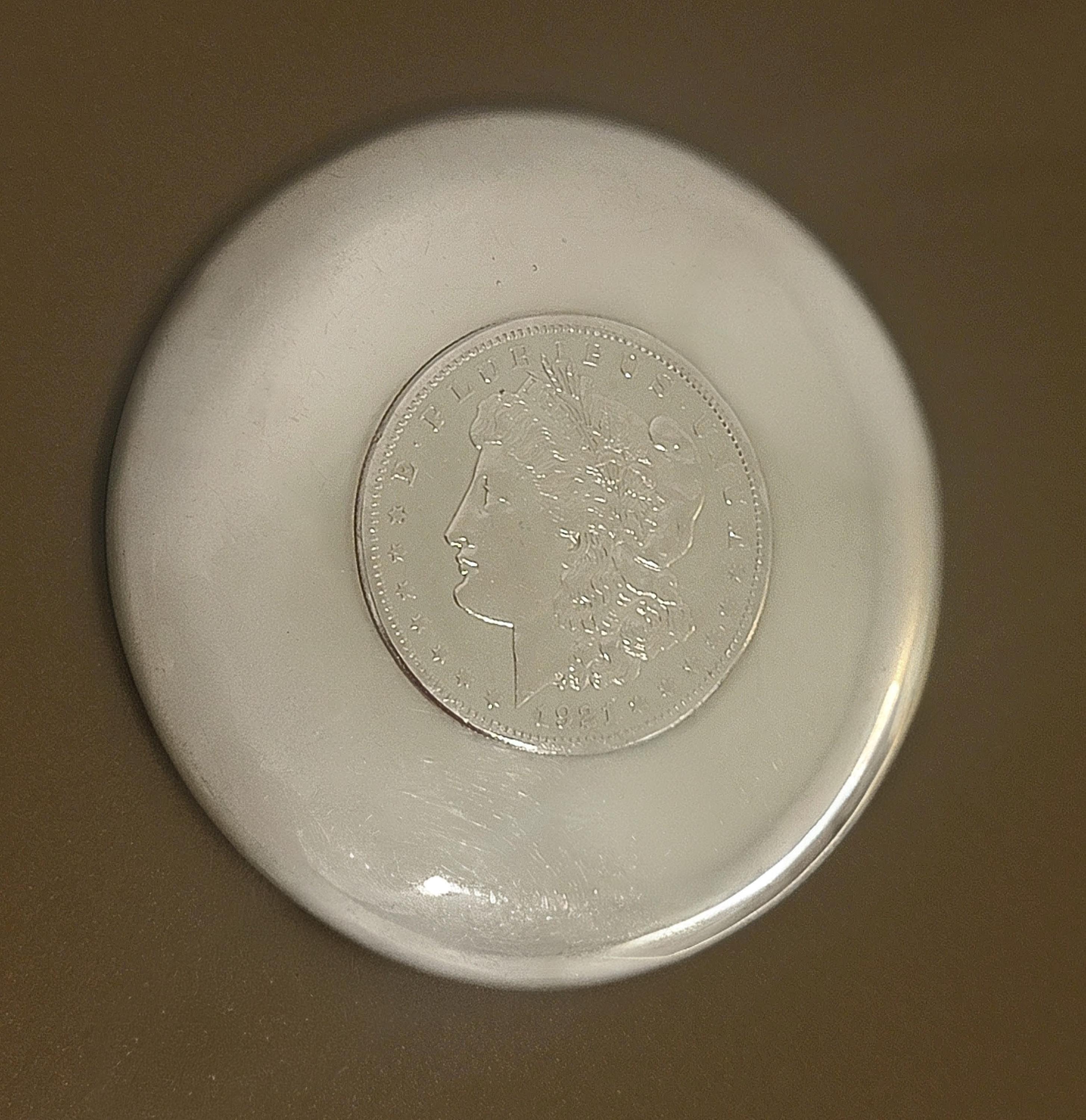This 1.60 troy ounce .999 fine silver dish features a beautifully detailed 1921 Morgan Dollar design on both sides — Liberty on the obverse and the heraldic eagle on the reverse — deeply struck into a gently concave form.