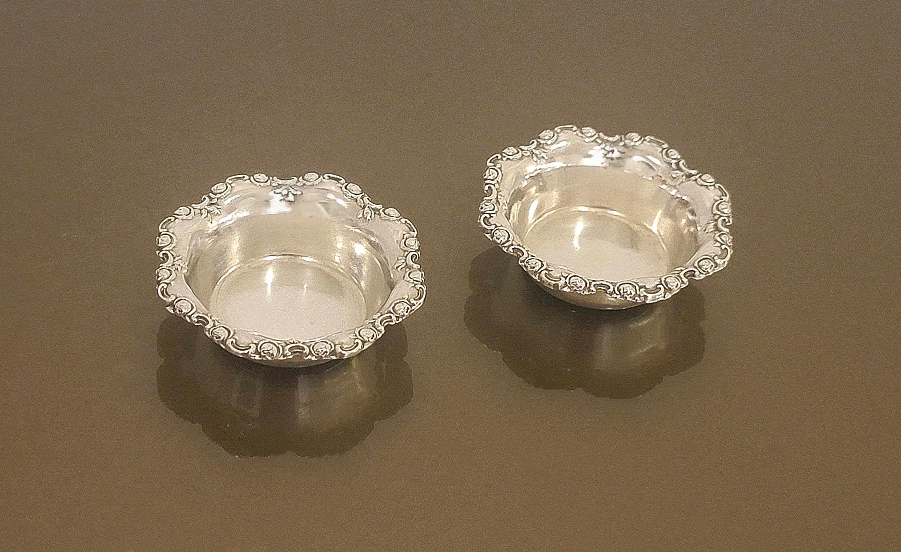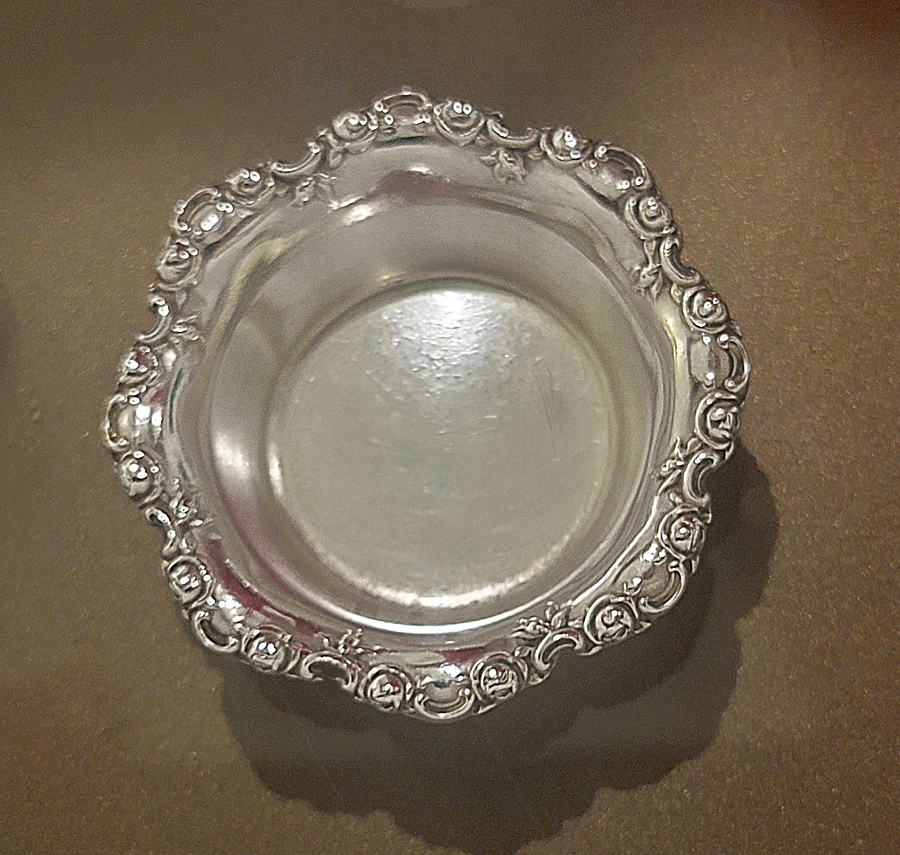 Each dish features a beautifully detailed scrolling border with floral and rococo-inspired ornamentation surrounding a smooth, circular basin. The weighty feel and crisp casting reflect the quality associated with Shreve & Co., one of America’s premier luxury retailers and silversmiths.