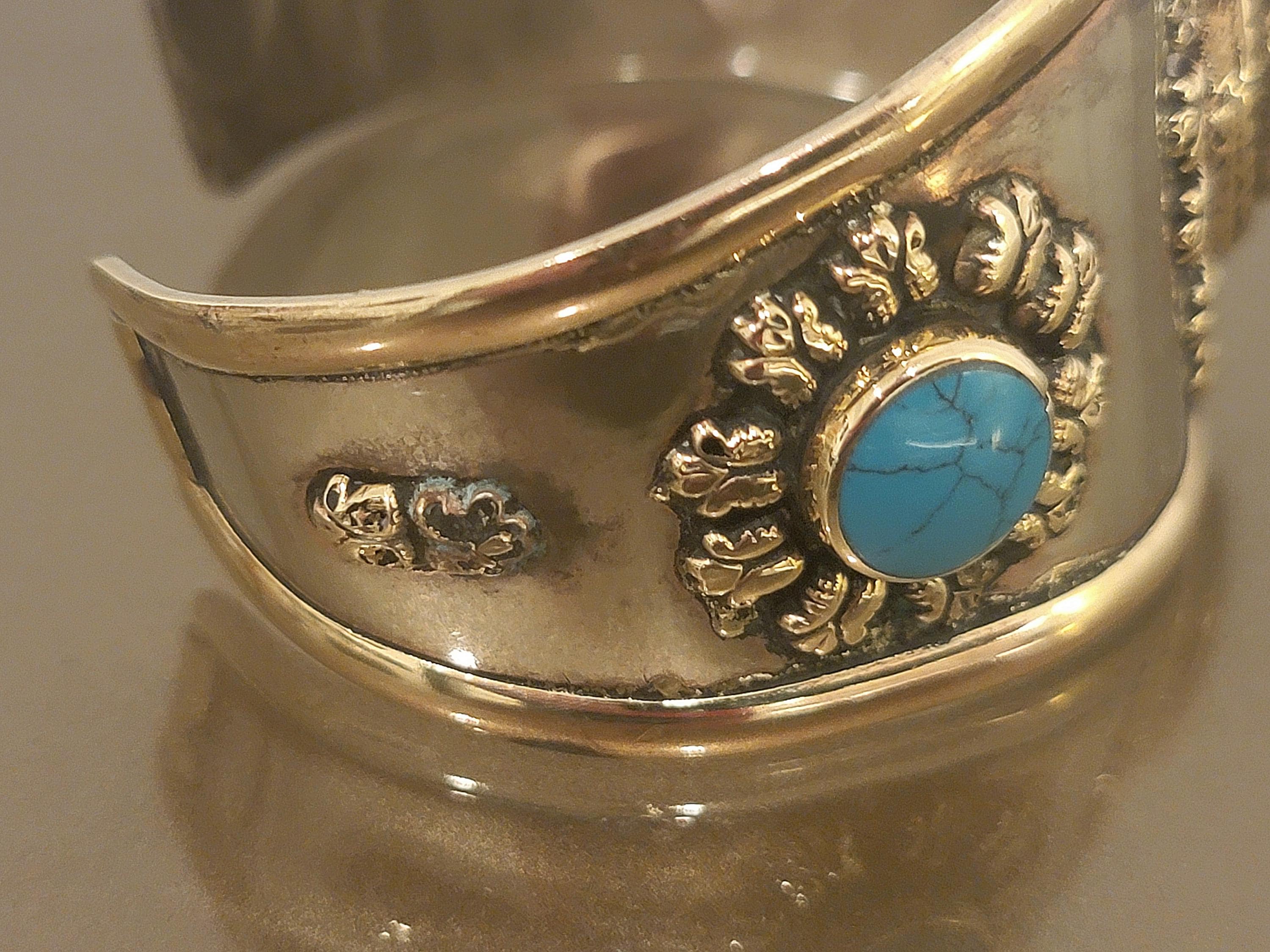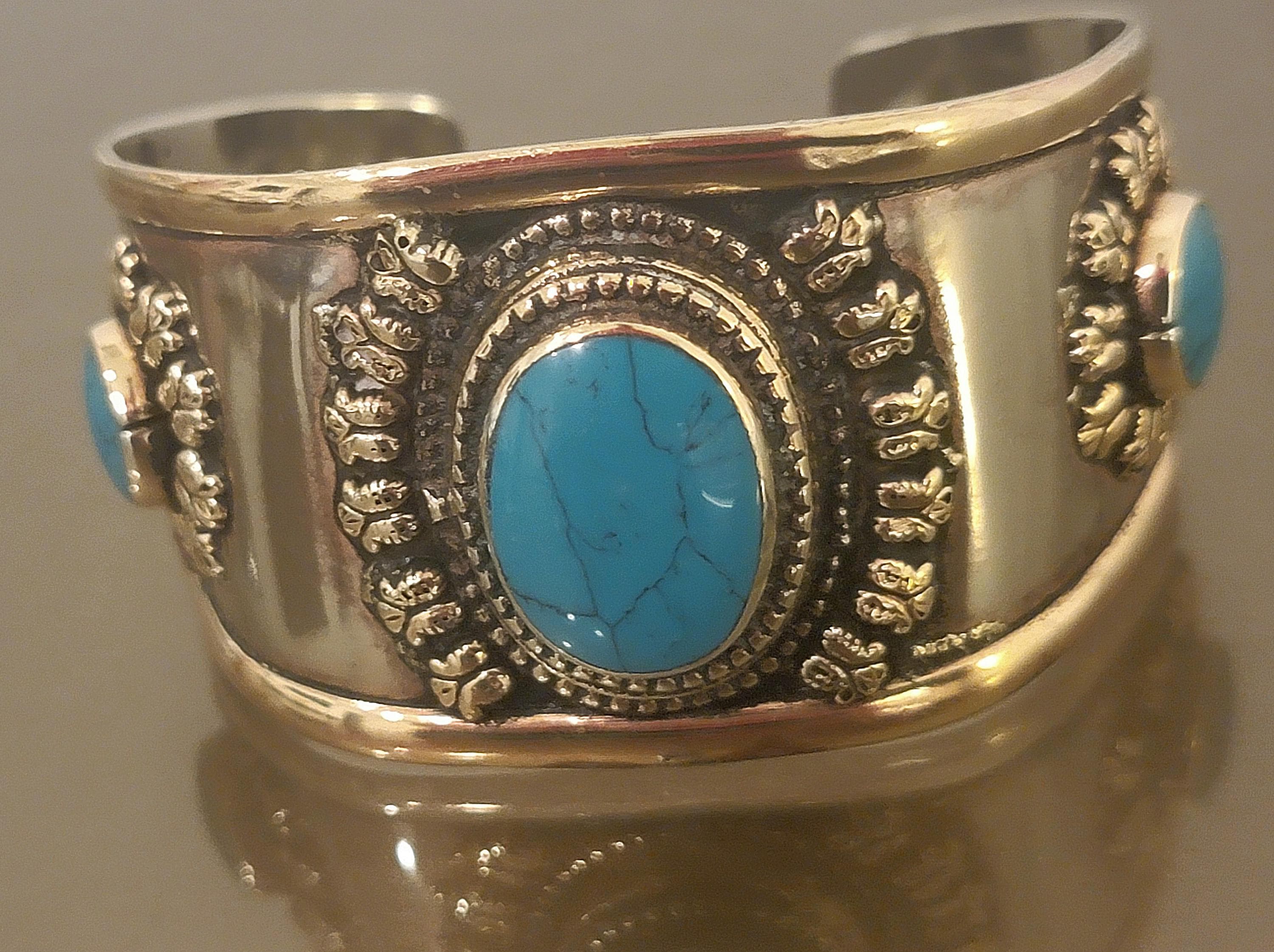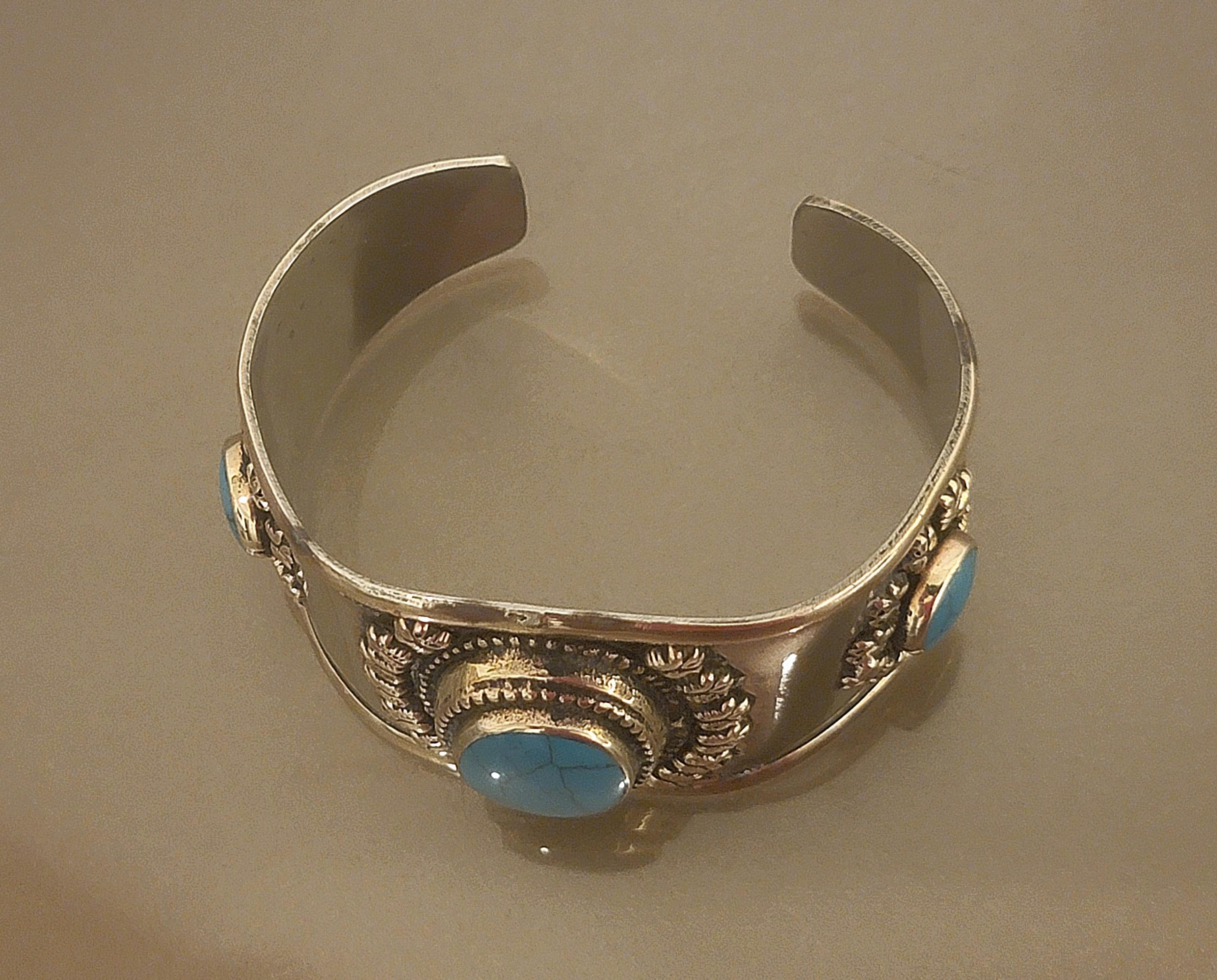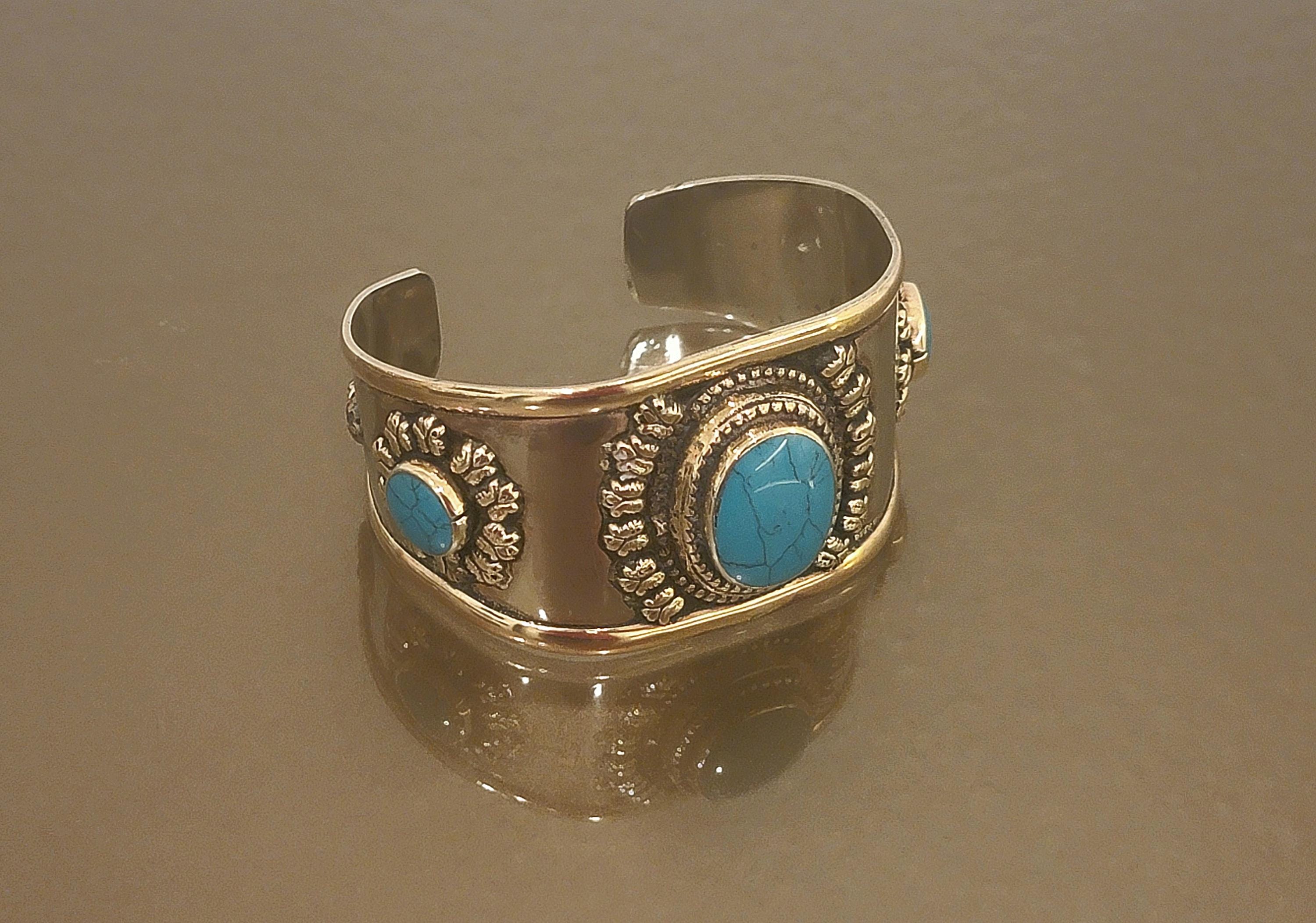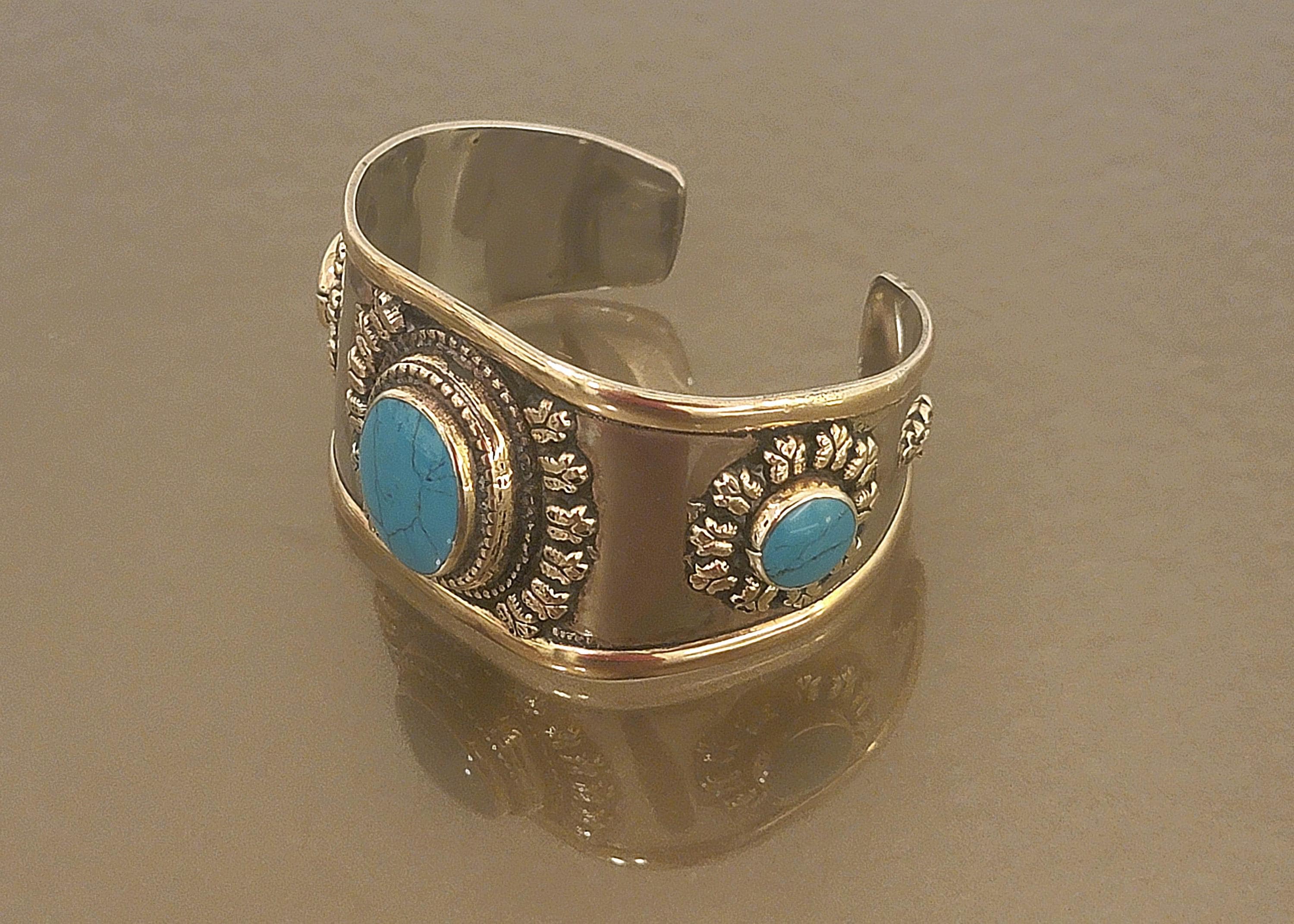 Vintage Southwestern-inspired cuff bracelet featuring three turquoise-colored cabochons set in an ornate raised floral design. The wide band creates a bold statement look, perfect for boho styling, casual wear, or layering with other silver-tone jewelry.