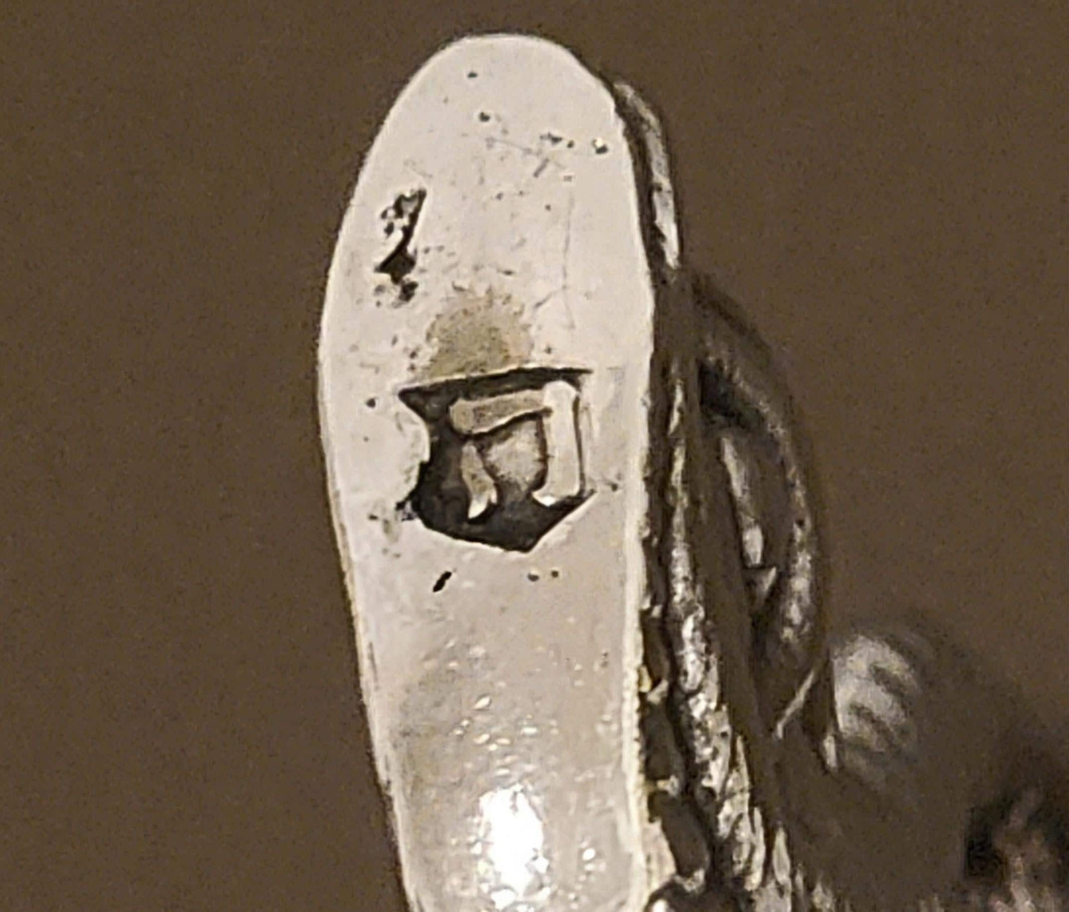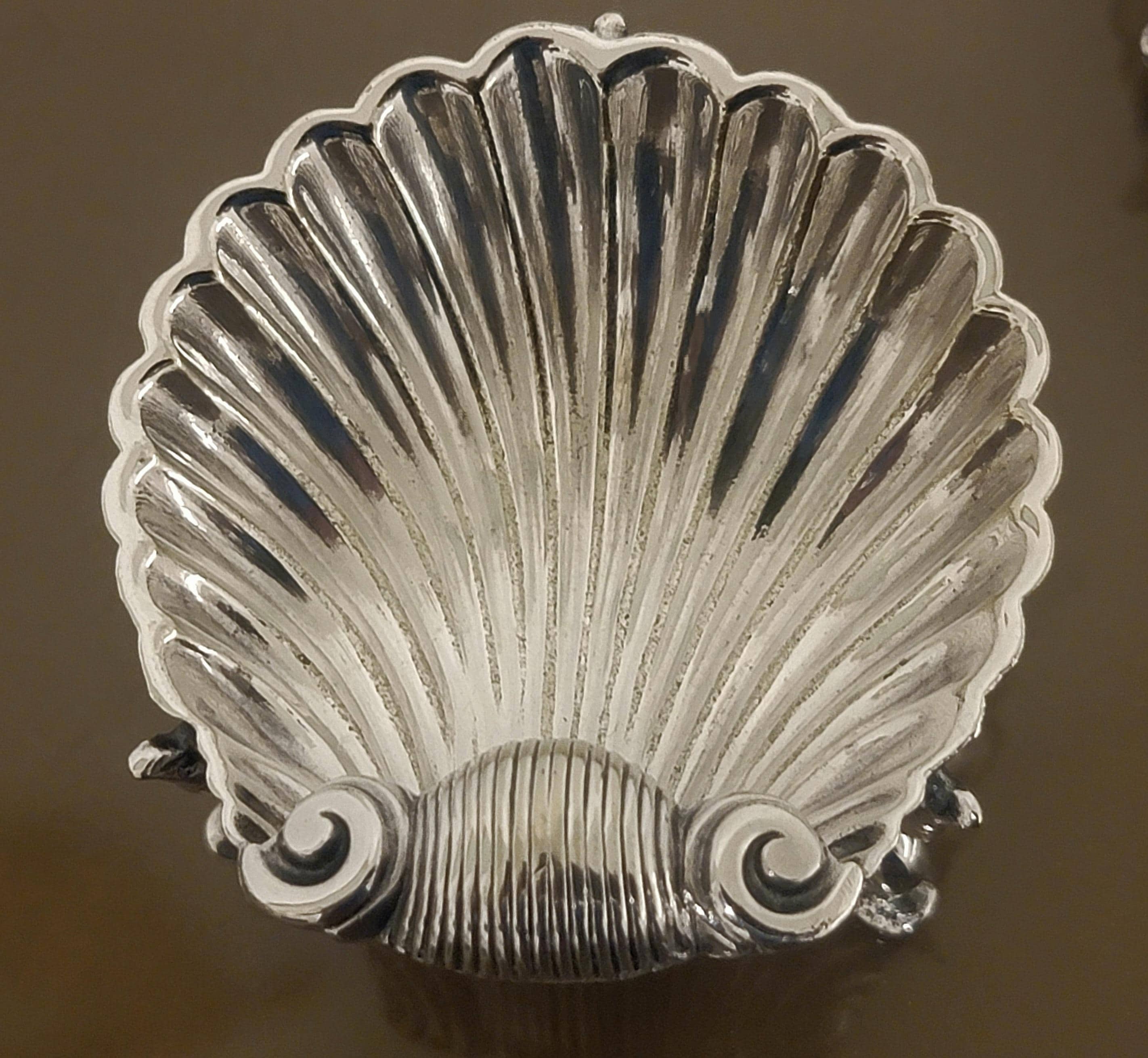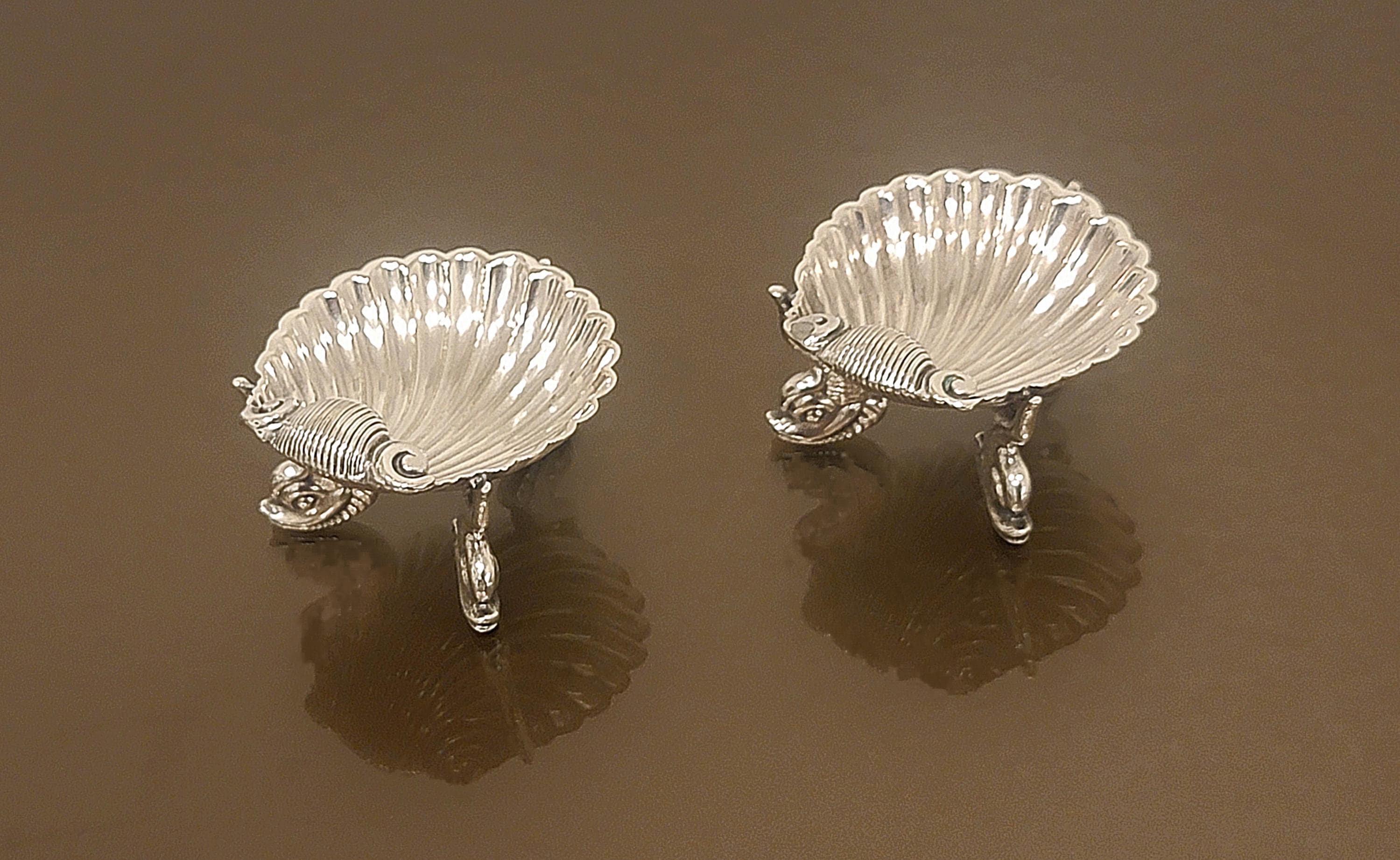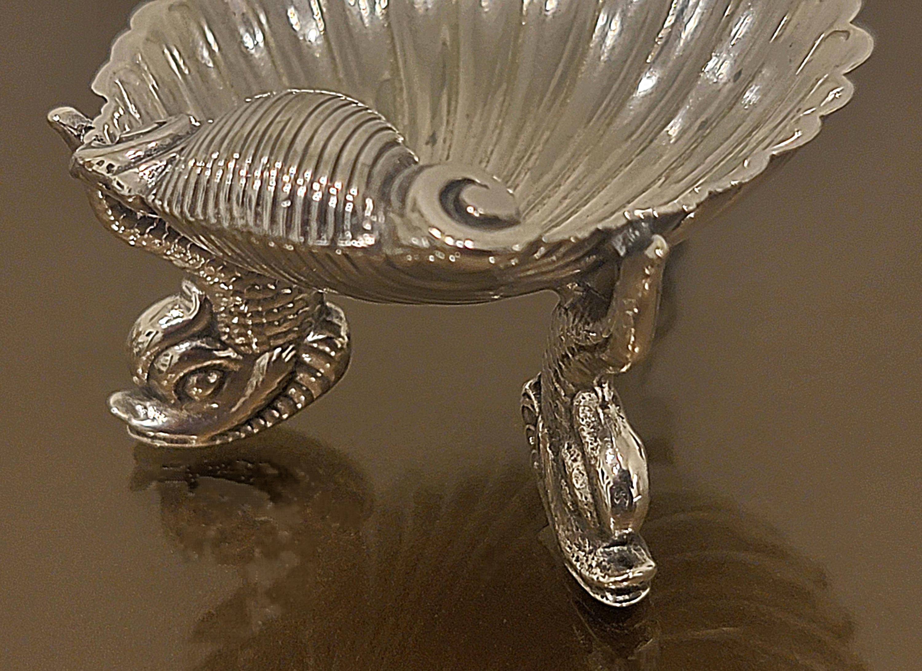 This charming pair of vintage silver on brass salt cellars features beautifully detailed scallop shell bowls supported by sculpted dolphins. The design evokes Victorian and early 20th century nautical tableware — decorative, refined, and perfect for coastal or traditional settings.