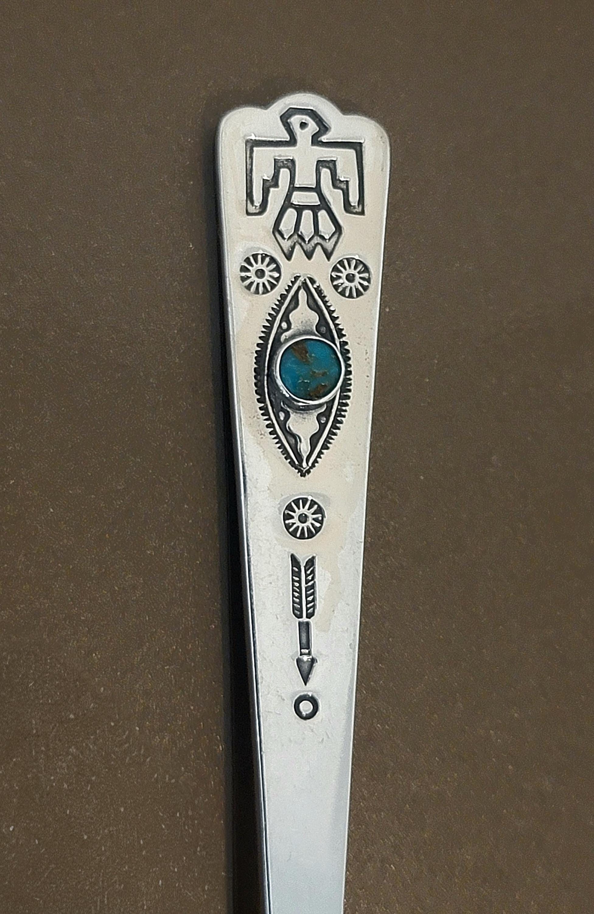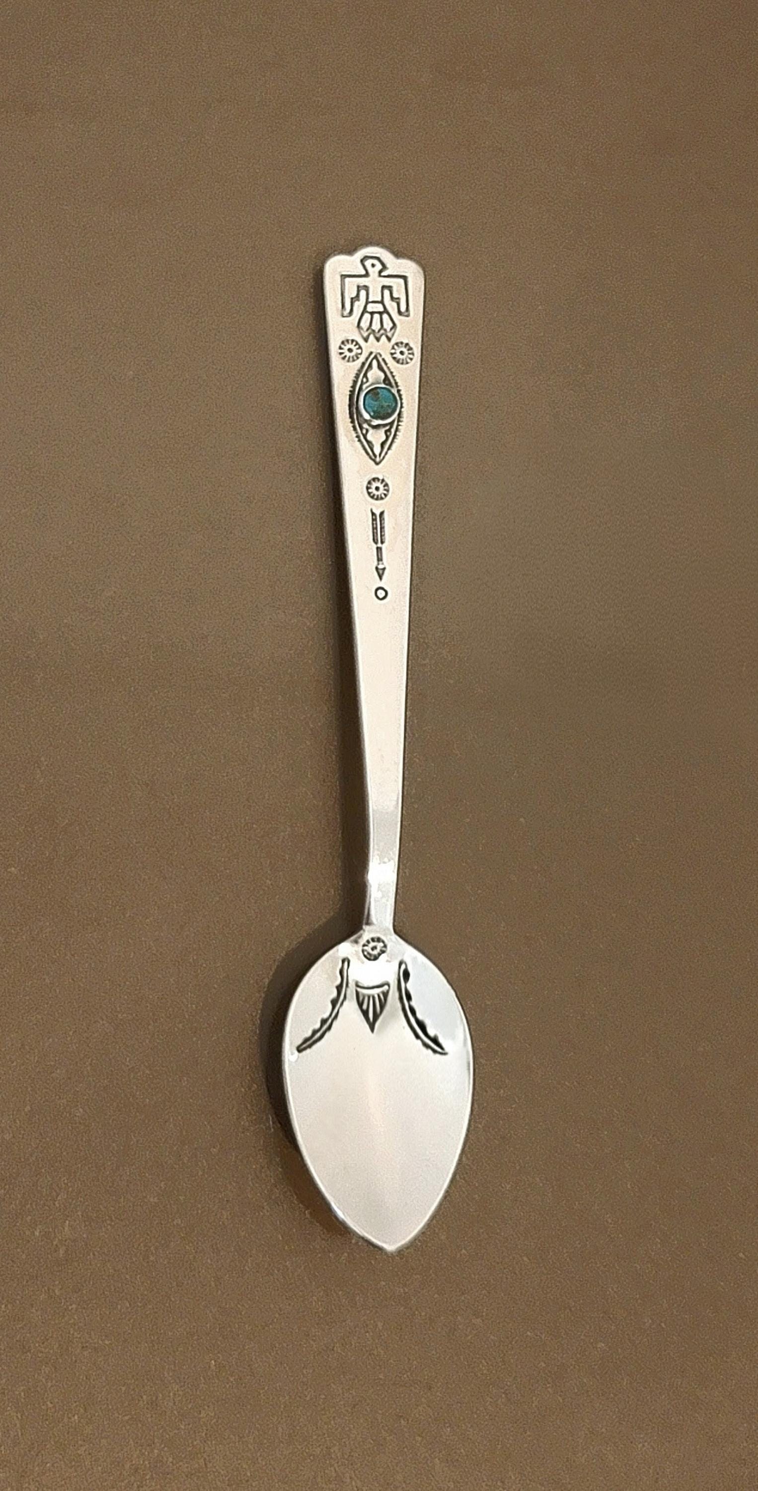 This striking vintage sterling silver spoon features classic Southwestern design elements with bold symbolism and a vibrant turquoise accent stone set into the handle.