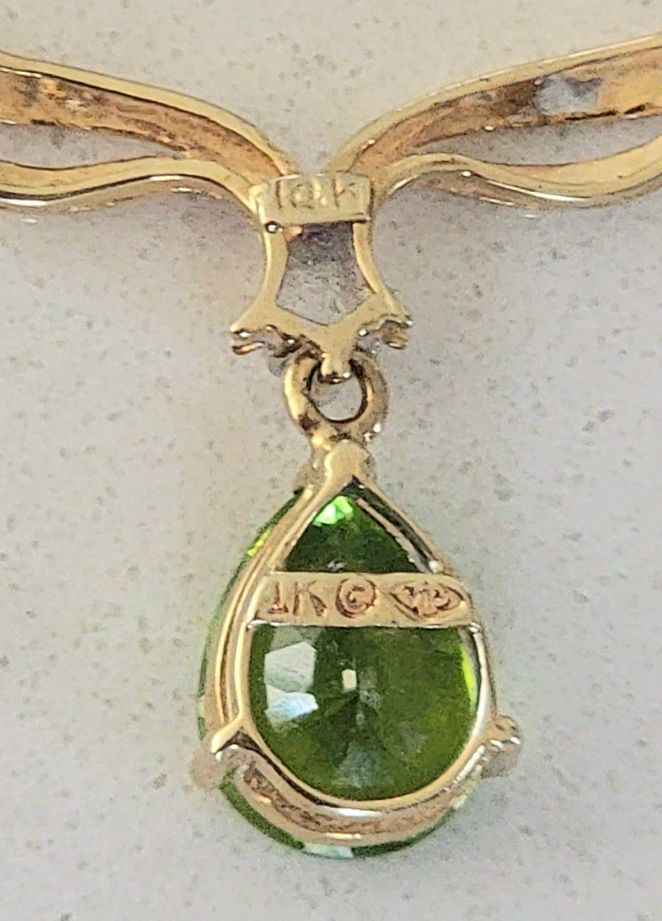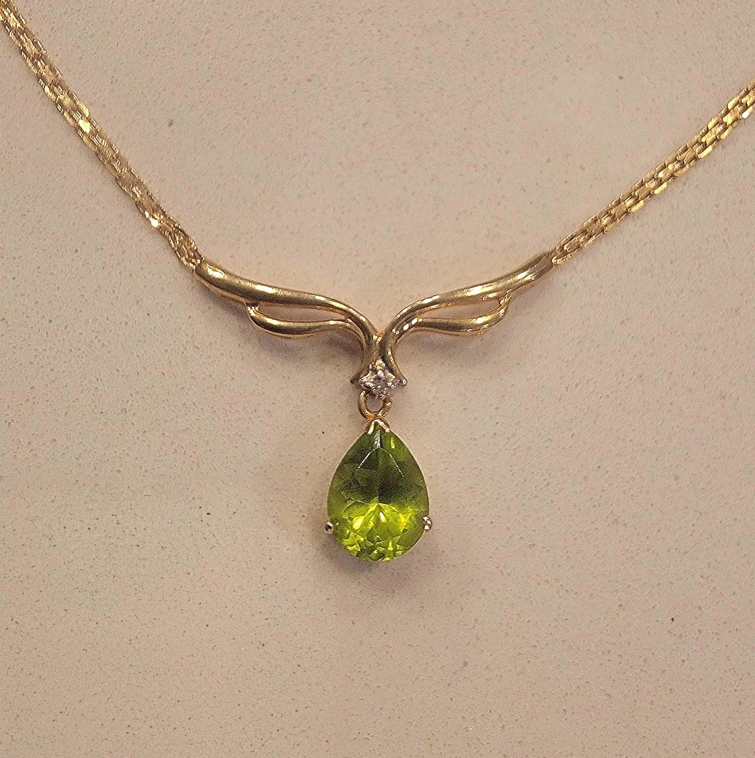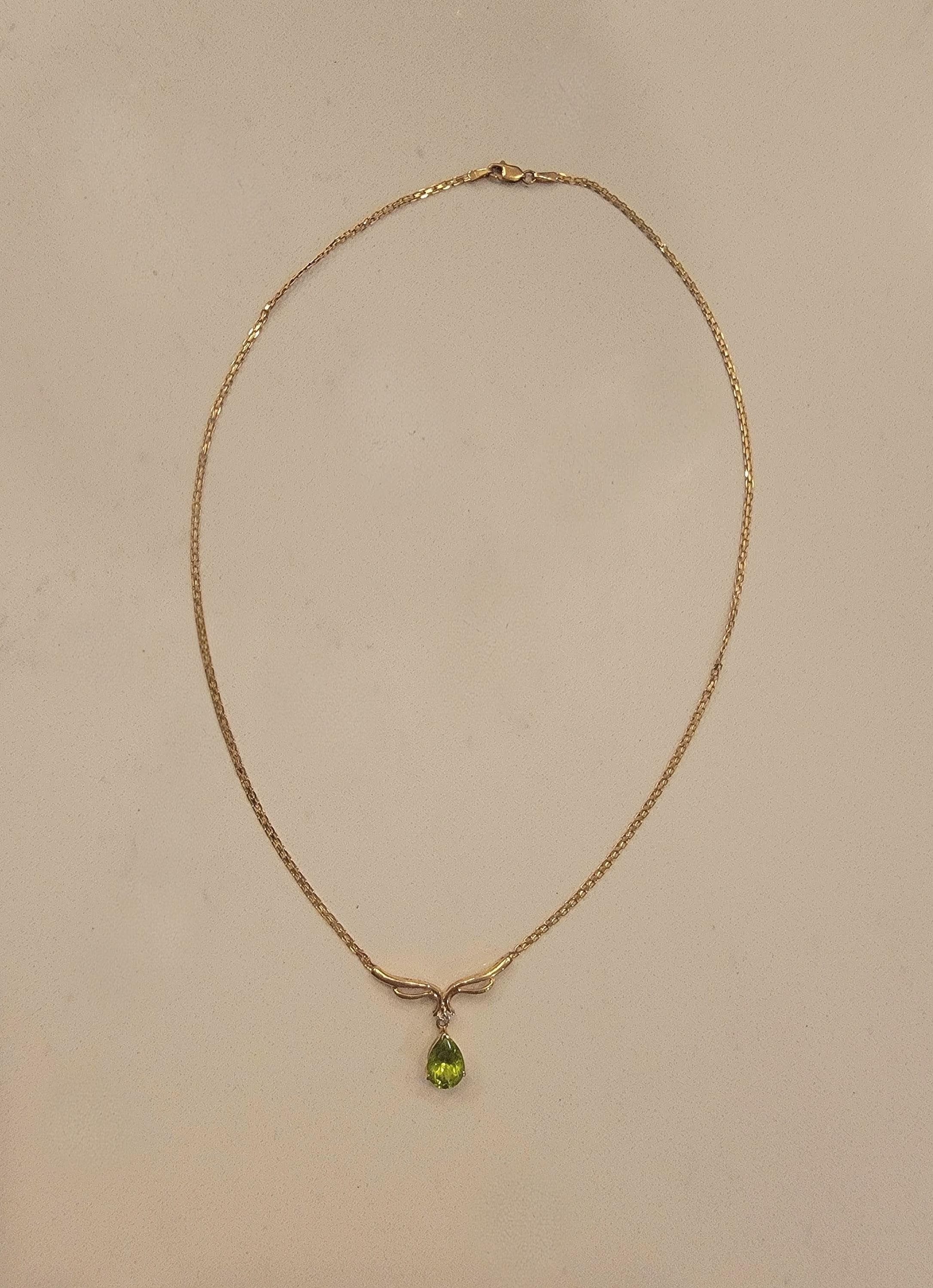 A luminous pear-cut peridot glows in vibrant spring green, suspended from an elegant 14K gold setting with graceful wing-inspired curves. This estate necklace offers refined femininity in a beautifully balanced, close-to-the-collarbone design.